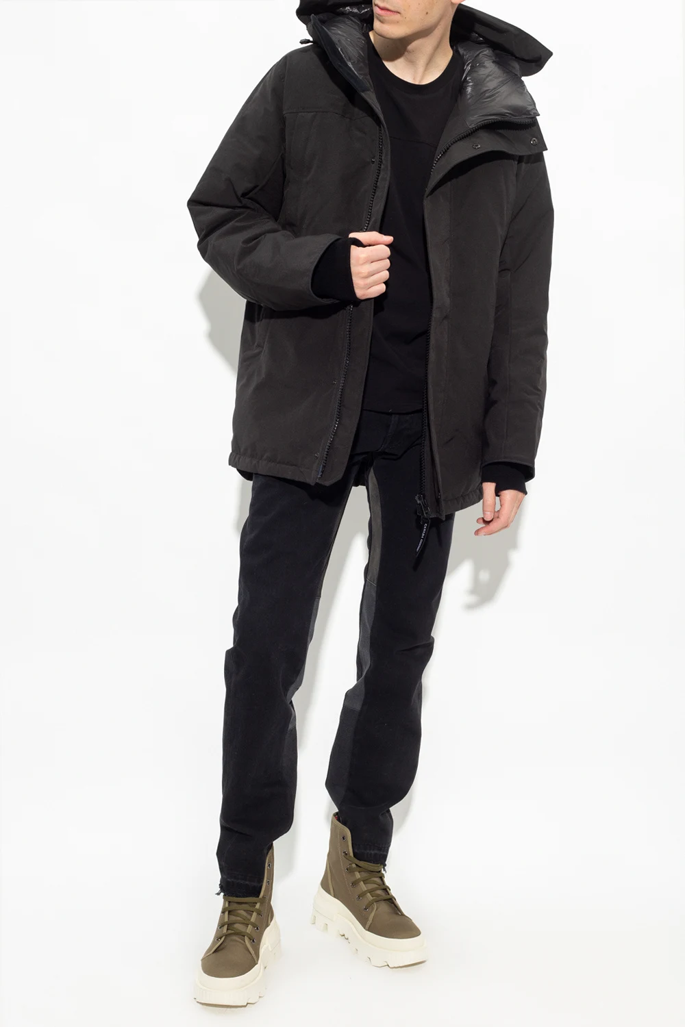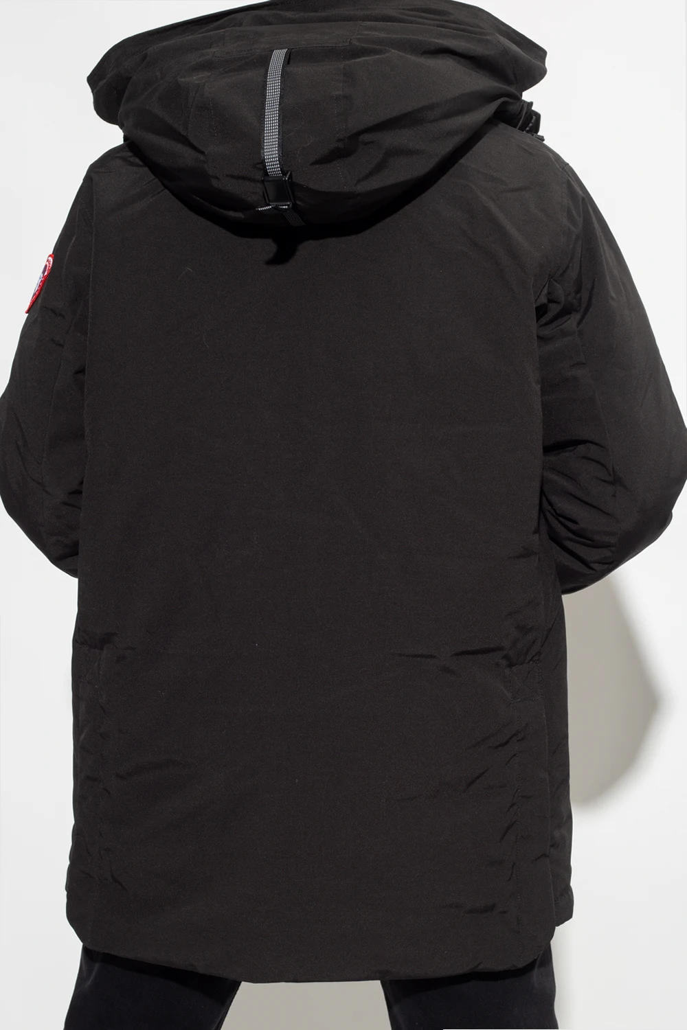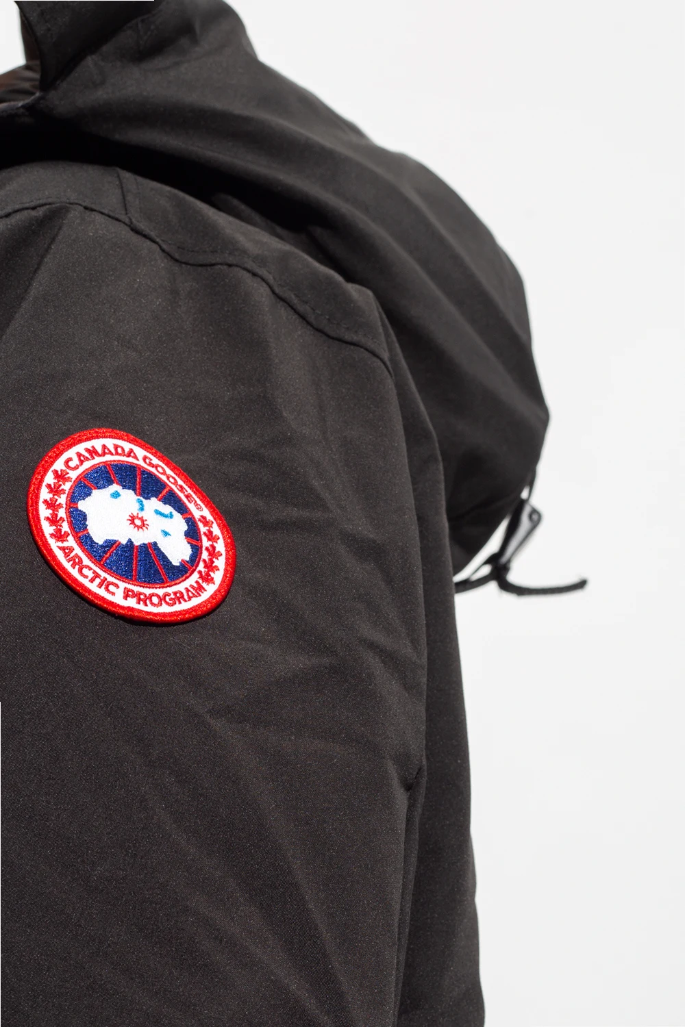 Black ‘Sanford’ quilted jacket from Canada Goose. Filled with duck down, this style secures with a two-way zip and snaps and features a drawcord-adjustable hood, four zip pockets on the front, a branded sleeve patch, snap closures on the side, long sleeves with elasticated cuffs and thumbholes, and internal straps which allow the item to be carried hands-free over the shoulders.