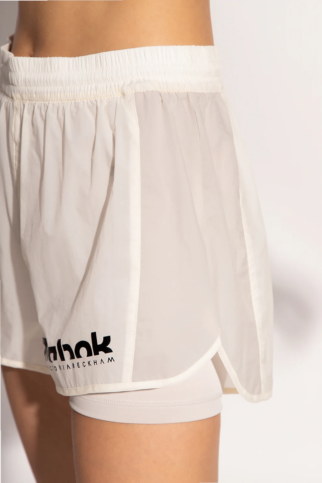 Cream and grey two-layered shorts from Reebok x Victoria Beckham. Fastened with drawstrings, this pair is decorated with a black logo print.
