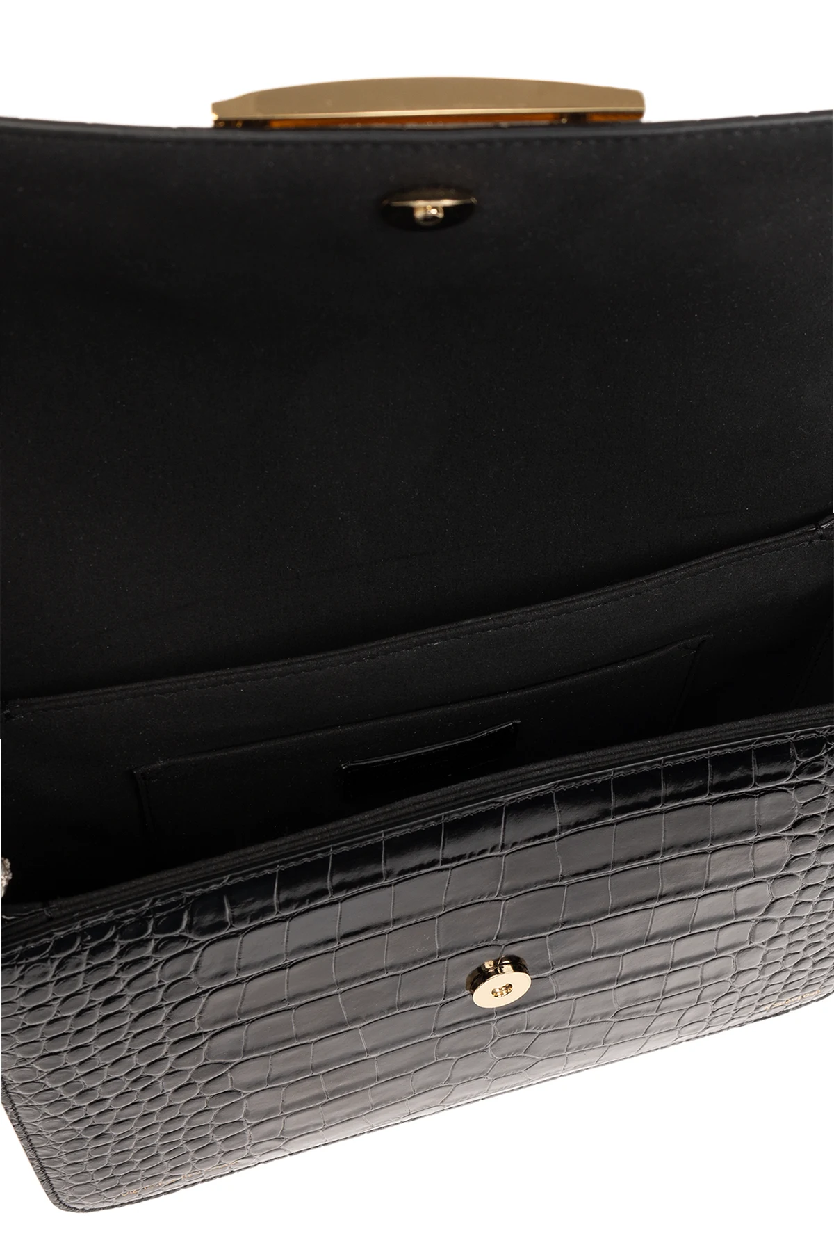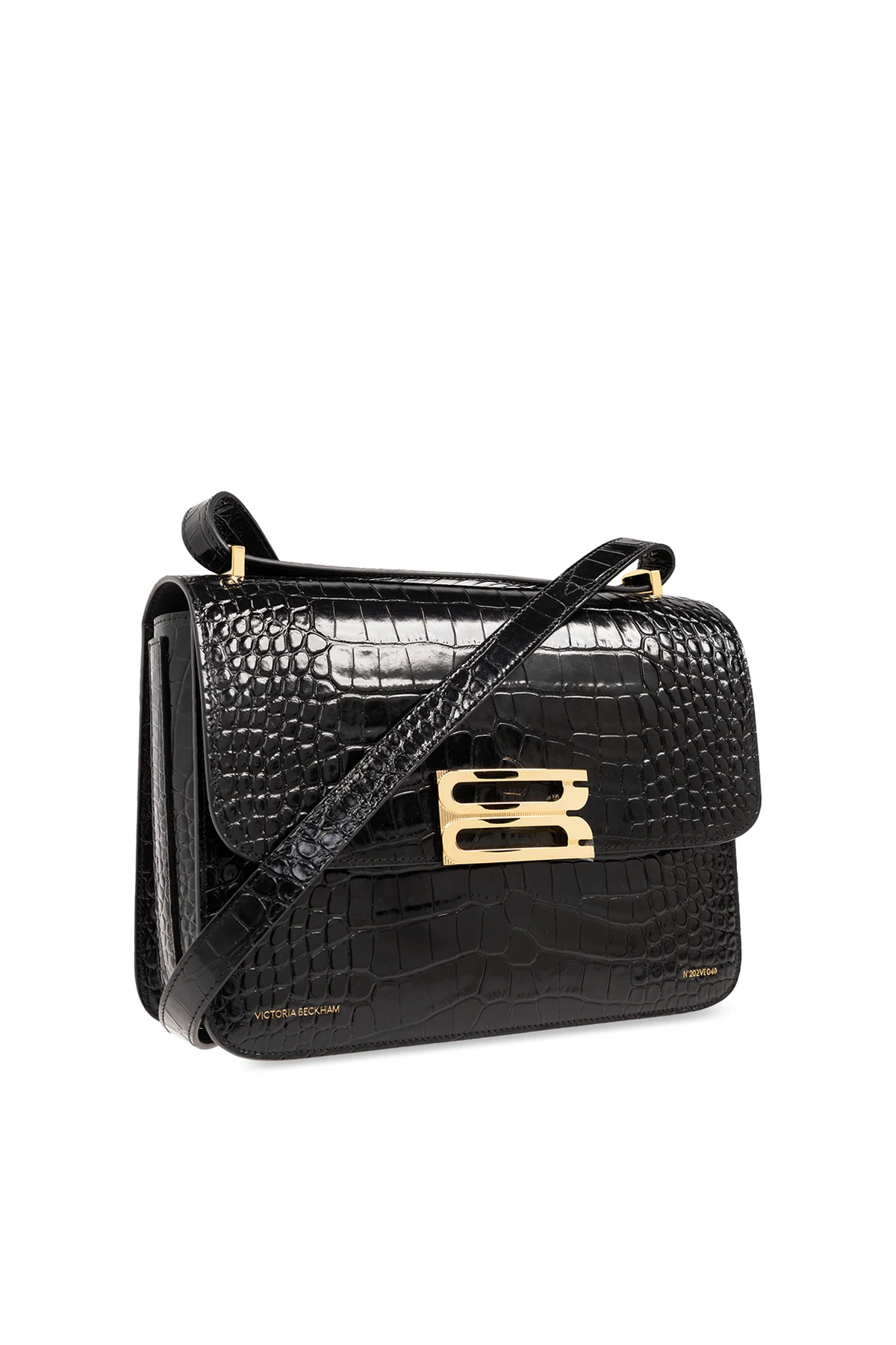 Black shoulder bag from Victoria Beckham. Made from leather, this design secures via a magnetic fastener and features a shoulder strap, one back slip pocket, gold-tone metal hardware and one internal compartment with two slip pockets.
