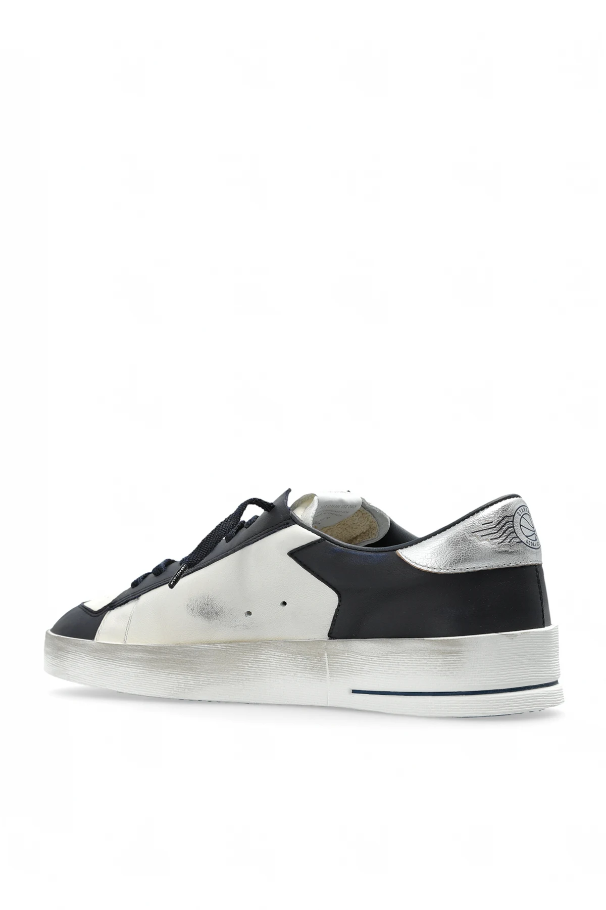Die weiße Sohle mit marineblauem Streifen verleiht einen sportlichen Charakter, und der absichtlich gealterte Vintage-Effekt, typisch für Golden Goose, schafft einen unverwechselbaren Stil. Diese Schuhe passen perfekt zu urbanen und Vintage-Outfits und verbinden Raffinesse mit Rebellion.
