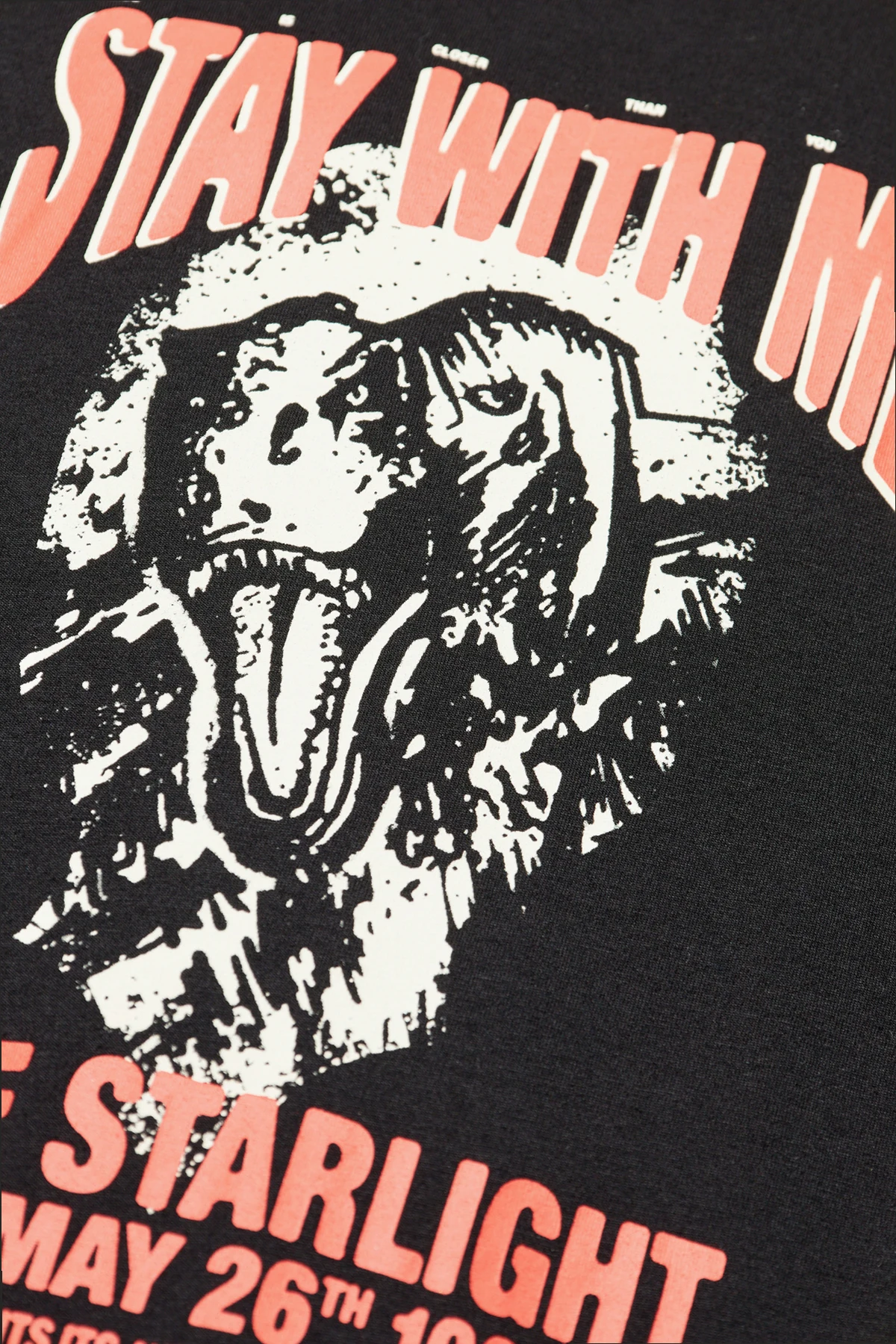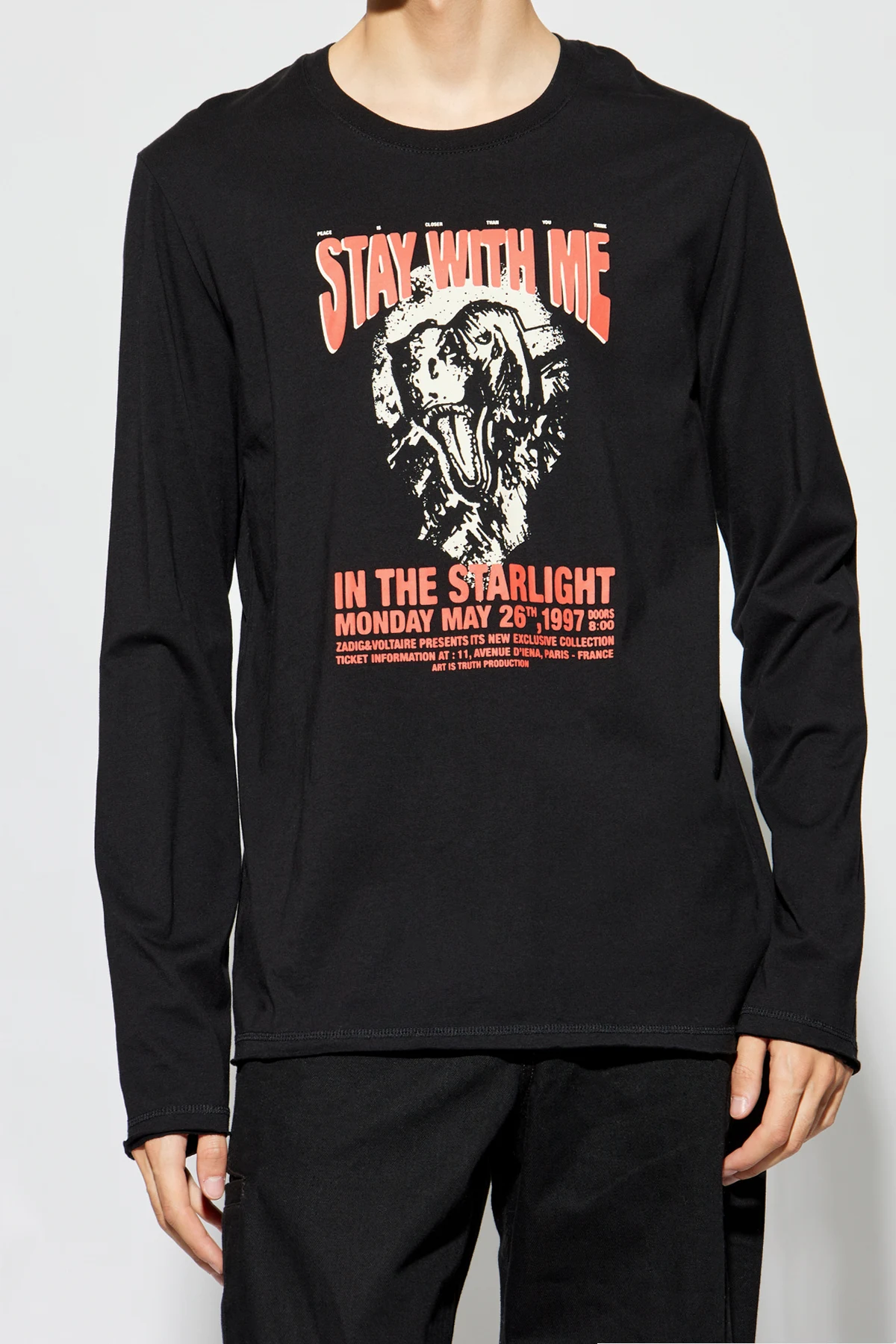 Auf der Vorderseite des Shirts befindet sich ein großer, auffälliger Druck in Weiß und Rot, der eine Grafik eines Hundekopfes sowie den Schriftzug "STAY WITH ME" zeigt. Zusätzliche Textdetails in Rot und kleinere Textzeilen verleihen dem Shirt Charakter. Auf dem Rücken ist ein Druck mit dem Markennamen "ZADIG & VOLTAIRE" sowie weitere Texte, wahrscheinlich im Zusammenhang mit einer Konzerttournee, zu sehen.