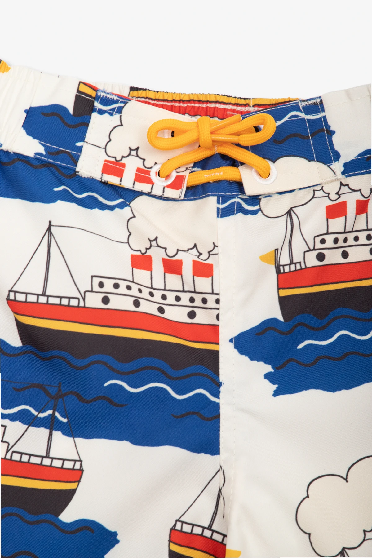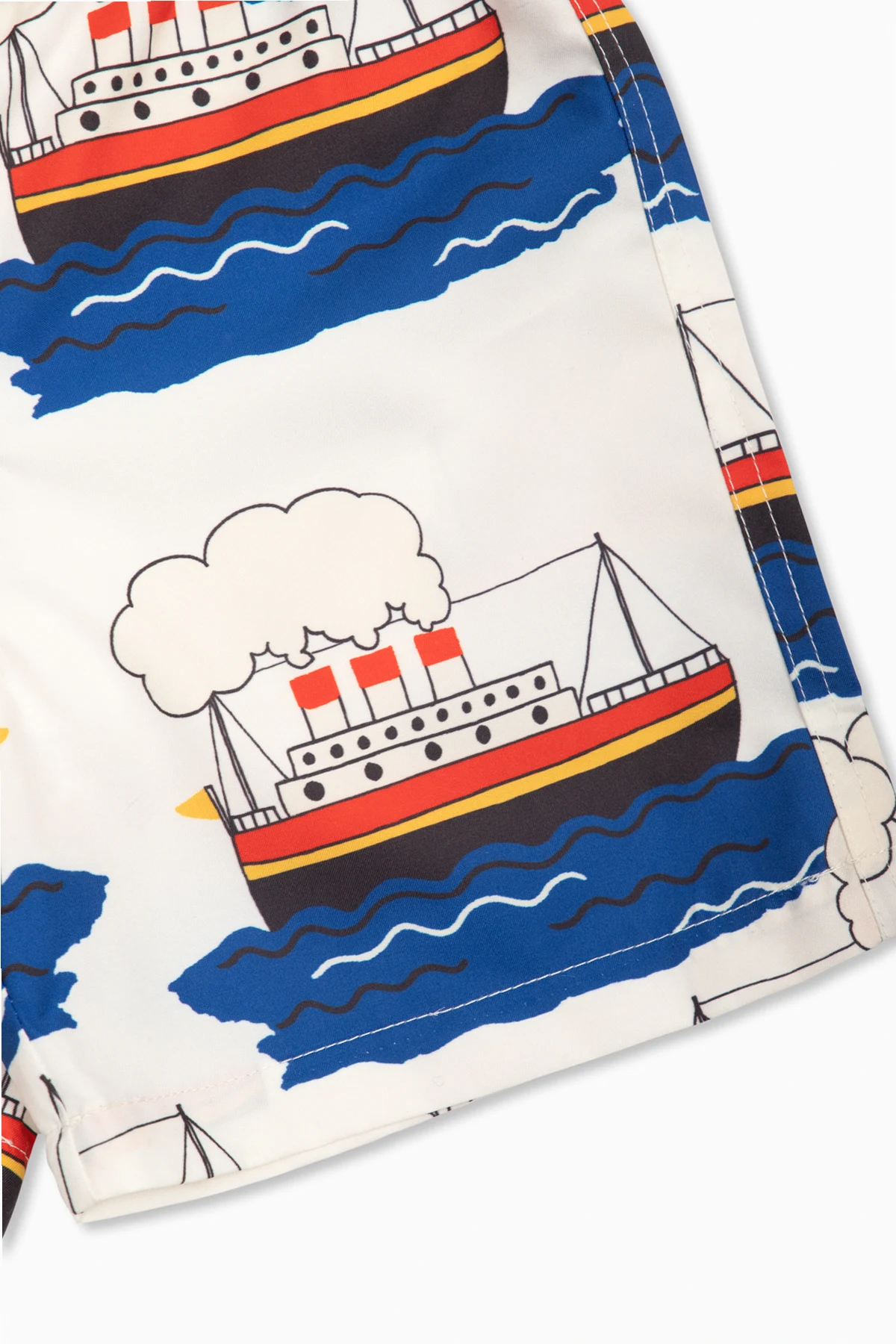 Cream swimming shorts from Mini Rodini. Crafted from recycled material, this pair is cinched with drawcords at the waist and features a colourful ferry print and two frontal slip pockets.