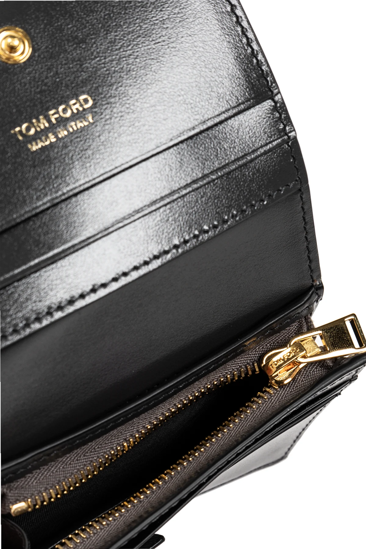 Das Portemonnaie wird mit einem Druckknopf verschlossen, was die Sicherheit der darin aufbewahrten Gegenstände gewährleistet. Das Innere enthält vier Kartenfächer, zwei Einschubtaschen und ein Münzfach mit einem goldfarbenen Reißverschluss. Zusätzlich unterstreicht der goldene Schriftzug "TOM FORD MADE IN ITALY" im Inneren des Portemonnaies seine hohe Qualität und italienische Herkunft.