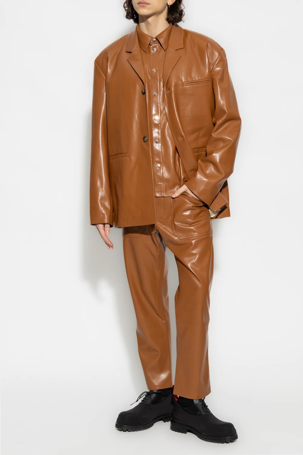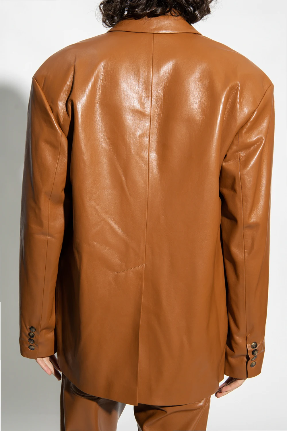 Brown ‘Karo’ blazer from Nanushka. Made of vegan leather, this long sleeve design features button fastenings, three slip pockets, single rear vent and notch lapels.