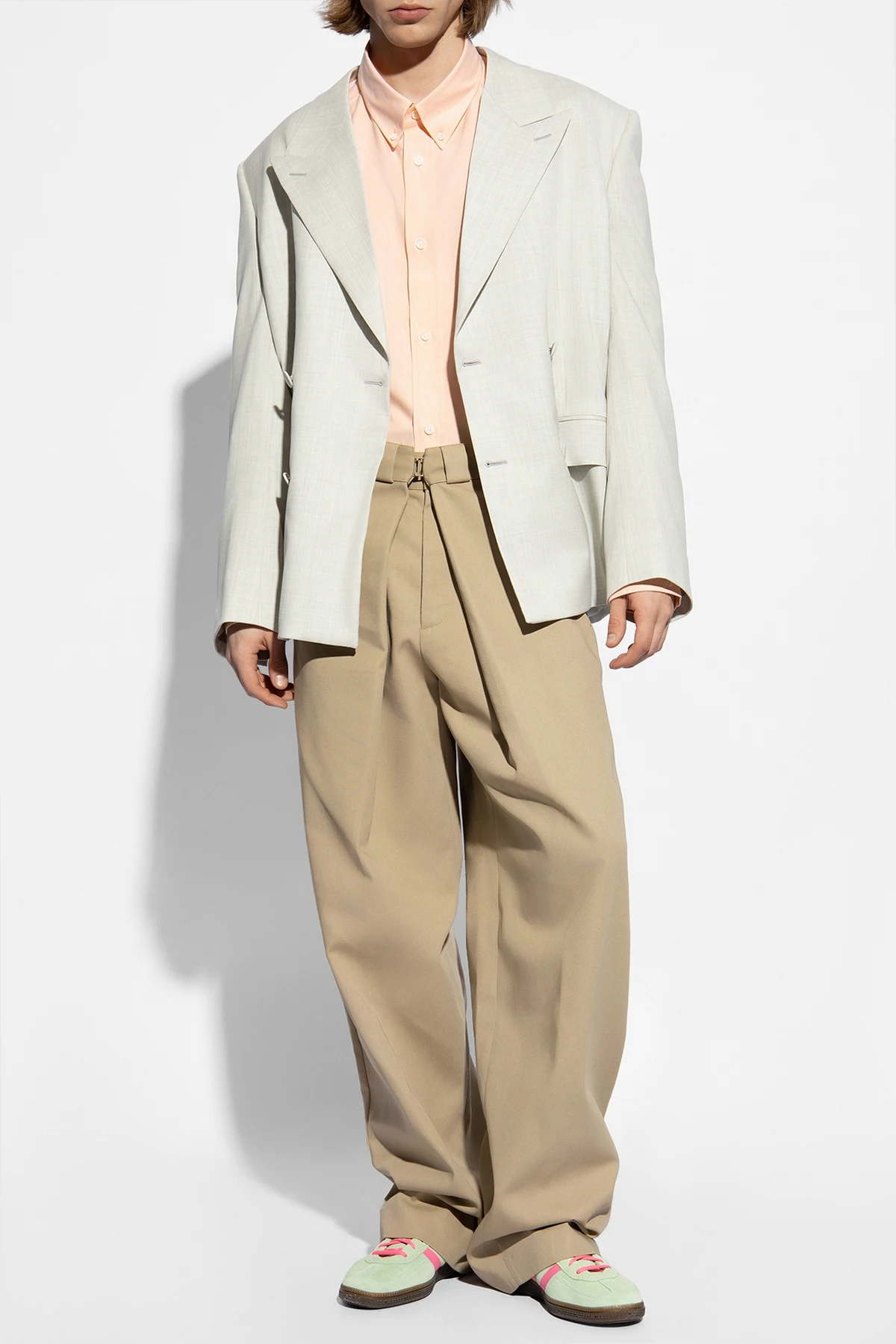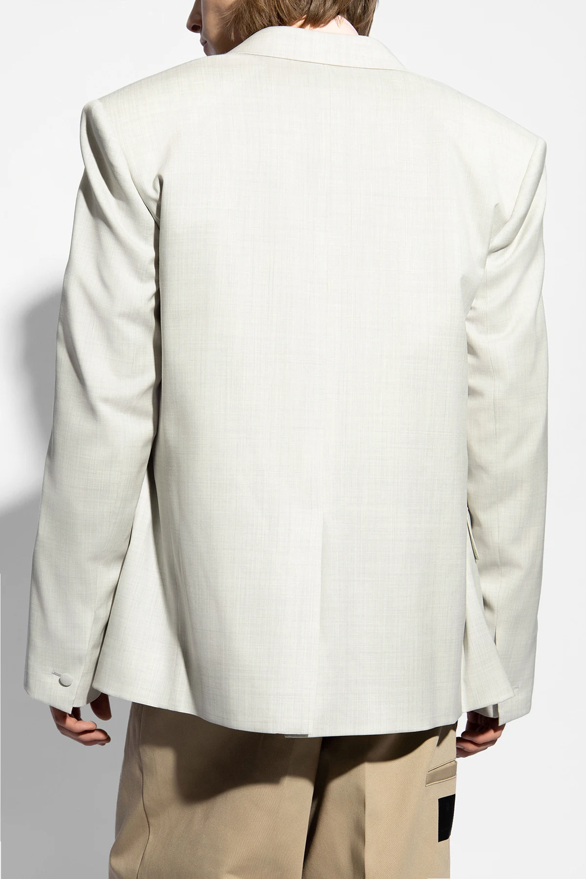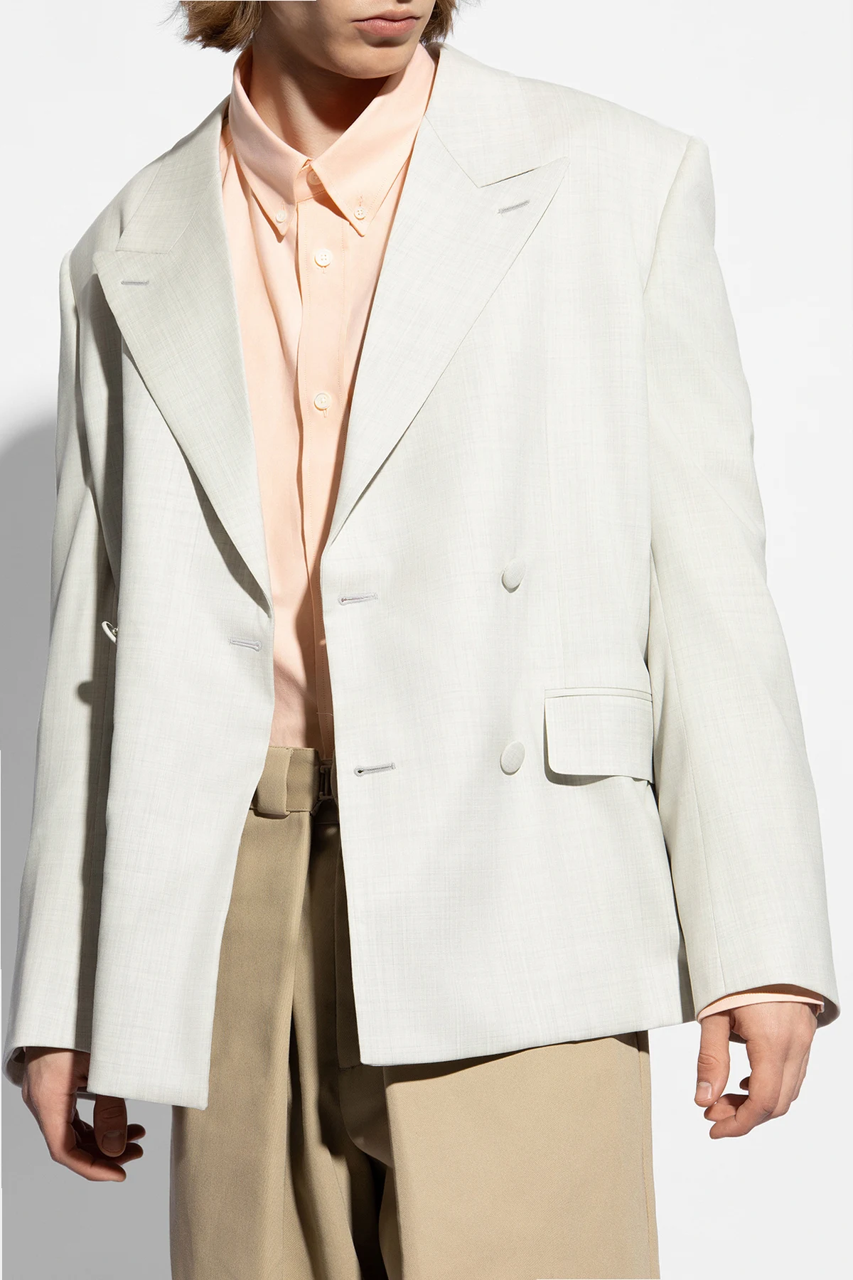 Doppelreihiger Blazer von Givenchy ist die Quintessenz raffinierter Eleganz, die klassische Formen mit subtilen, modernen Akzenten verbindet. Hergestellt aus hochwertigster Wolle, präsentiert er sich in einem hellen Beigeton, der dem Ganzen eine Leichtigkeit und Frische verleiht. Die charakteristischen, breiten Revers und die doppelreihige Knopfleiste mit sorgfältig ausgewählten Knöpfen unterstreichen den formellen, aber dennoch lässigen Charakter dieses Blazers.
