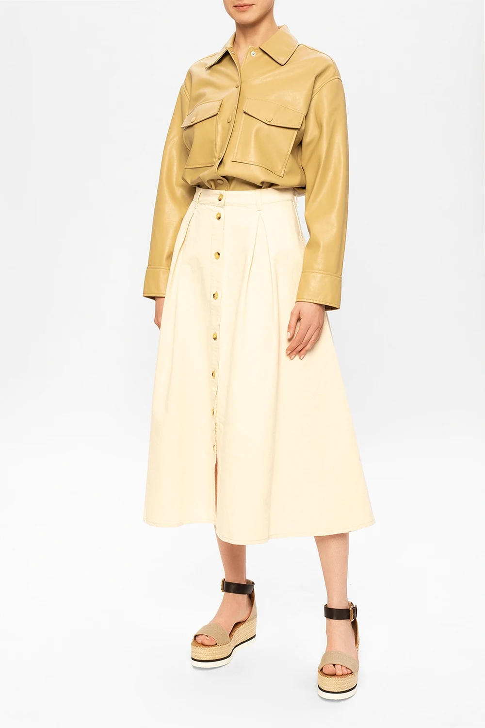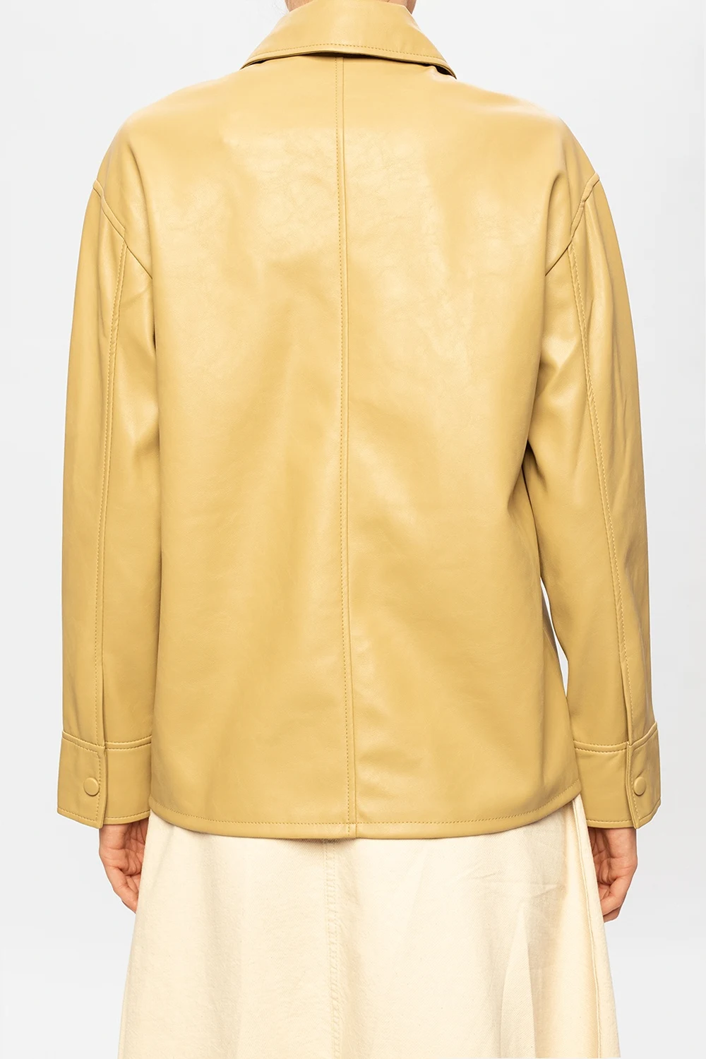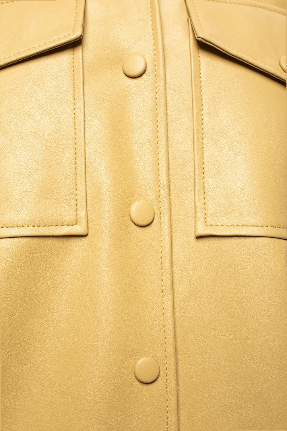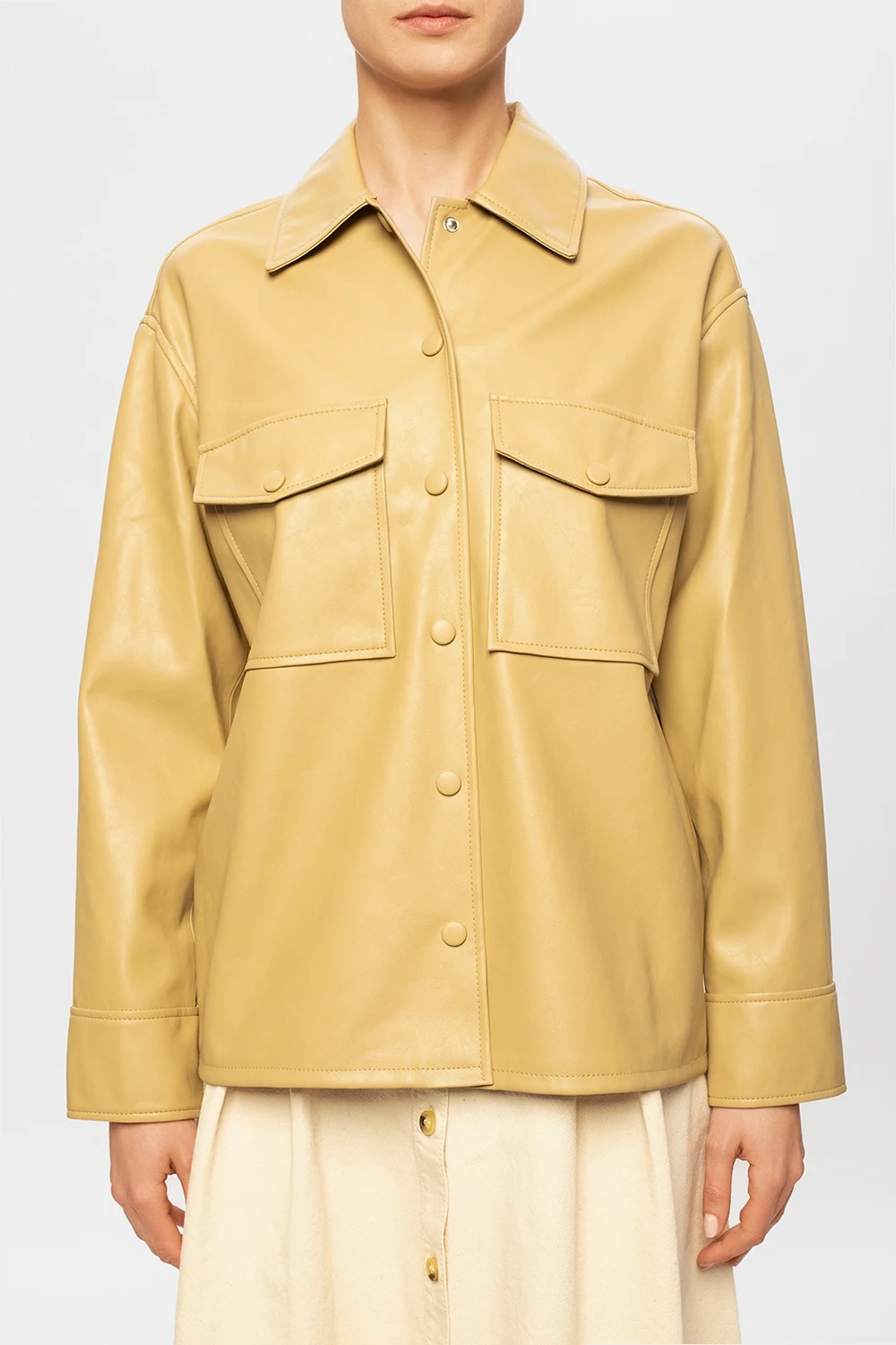 Beige ‘Shereen’ jacket from Samsoe Samsoe. Made of faux leather. Fastened with snaps. Two flap pockets fastened with snaps on the front.