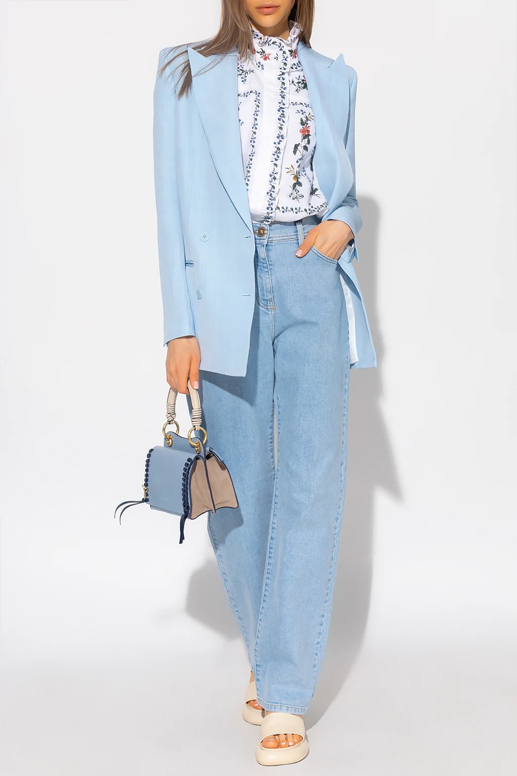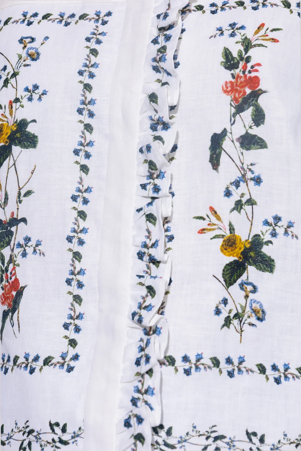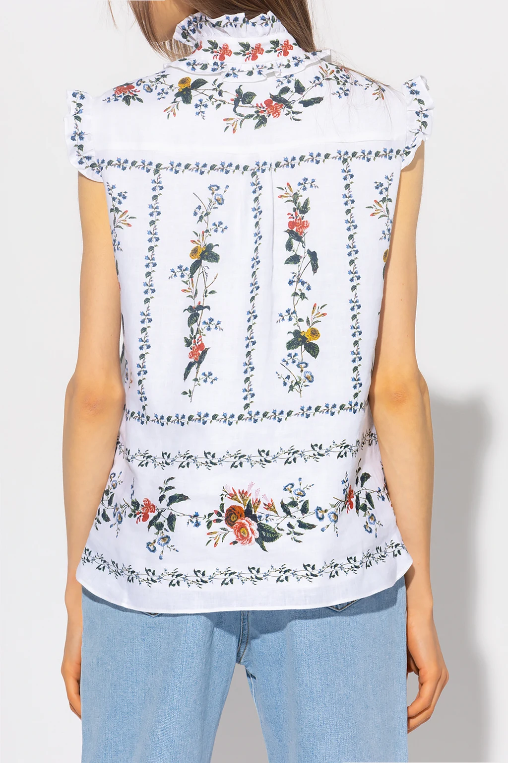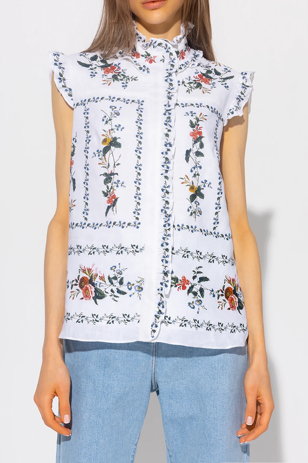 White ‘Cyrus’ sleeveles shirt from Erdem. Crafted from linen canvas, this garment features buttons with a concealed placket, multicolored Carrington Vine floral motif and ruffles at the neck and shoulders.