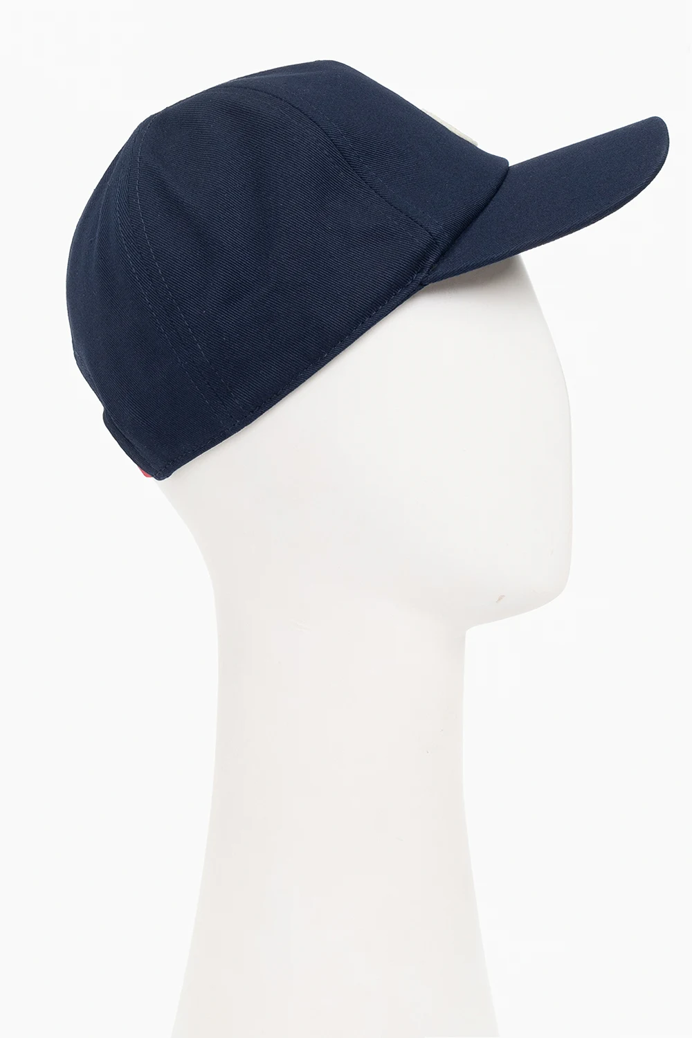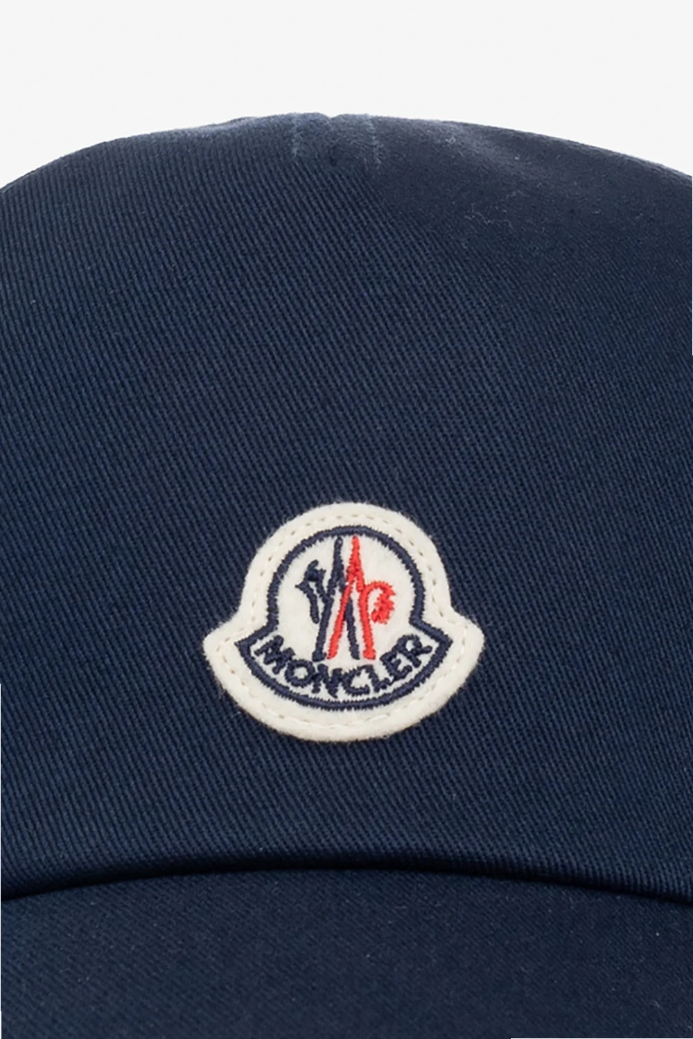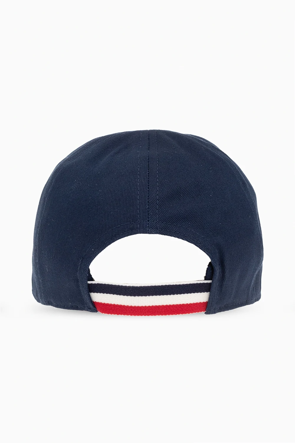 Navy blue baseball cap from Moncler Enfant. Made of cotton, this item showcases a logo patch and a red, white and navy blue elastic strap at the back.