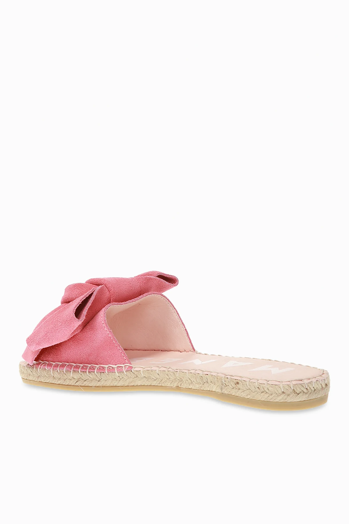 Pink 'Hamptons' slides from Manebi. Made of suede. Decorated with a bow and a woven insert. Brown rubber sole.