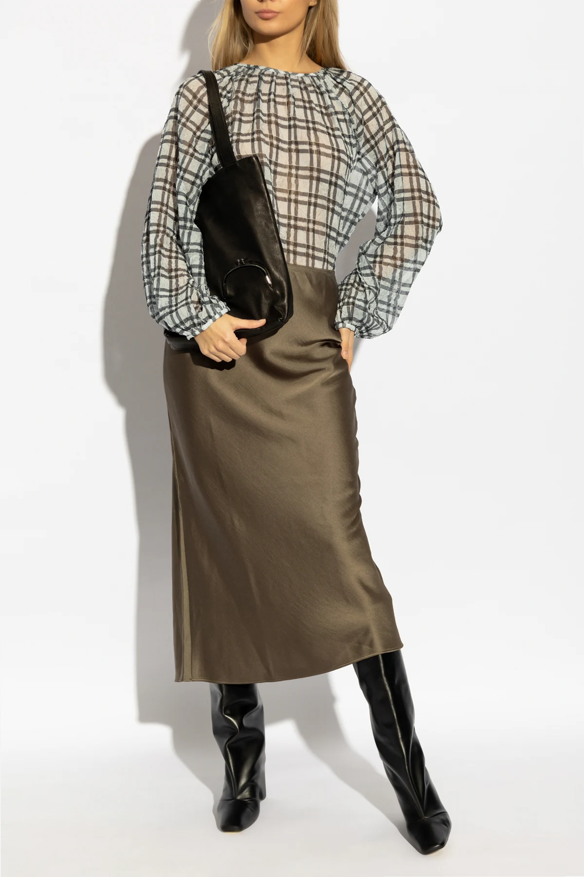 In Kombination mit einer karierten Bluse und schwarzen langen Stiefeln entsteht ein harmonisches Ensemble, das seinen raffinierten Charakter perfekt unterstreicht. Der Verzicht auf sichtbare Schriftzüge und Logos verleiht ihm einen diskreten Charme, der die Essenz der minimalistischen Ästhetik widerspiegelt, für die die Marke Samsøe Samsøe bekannt ist.
