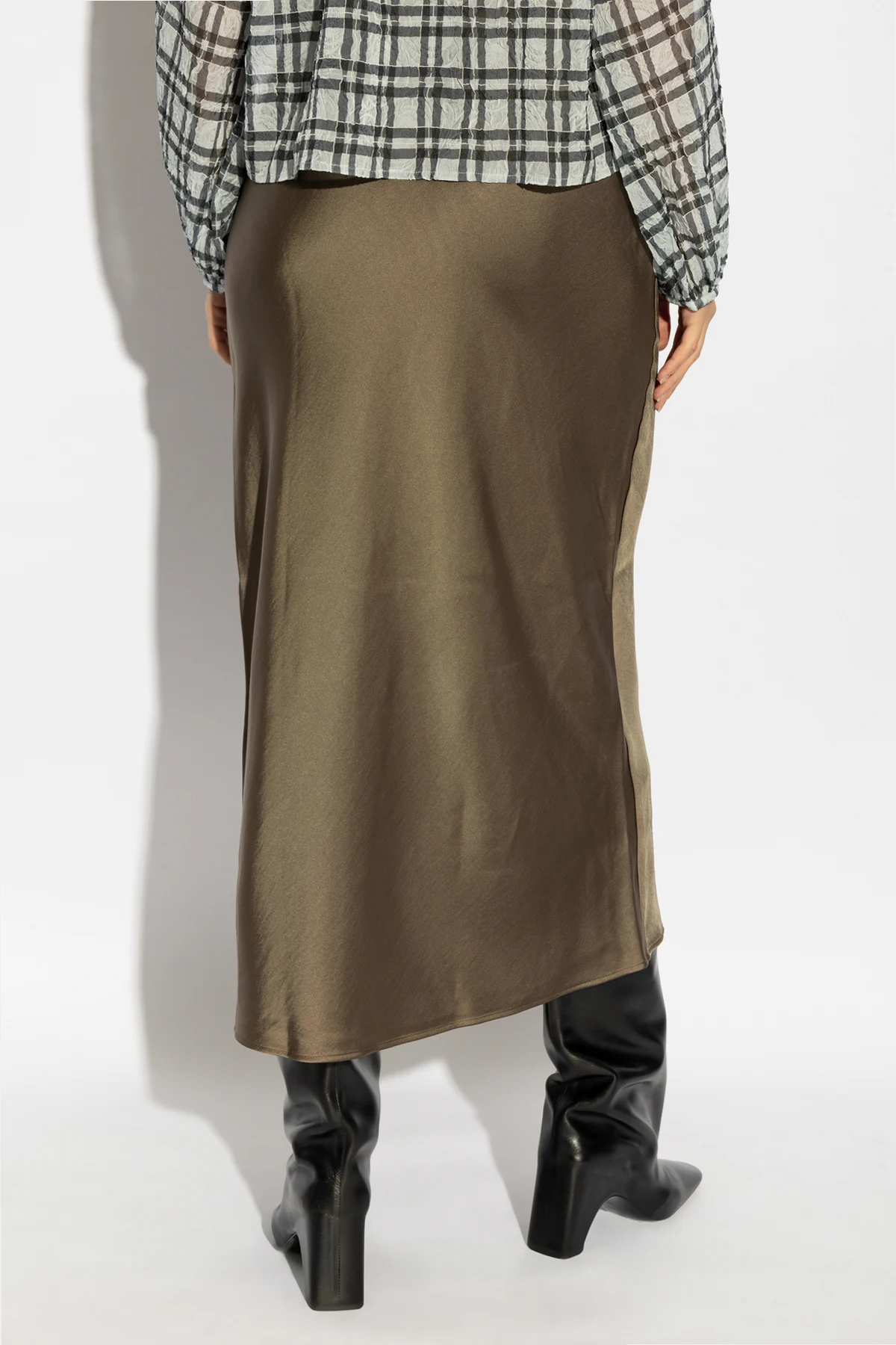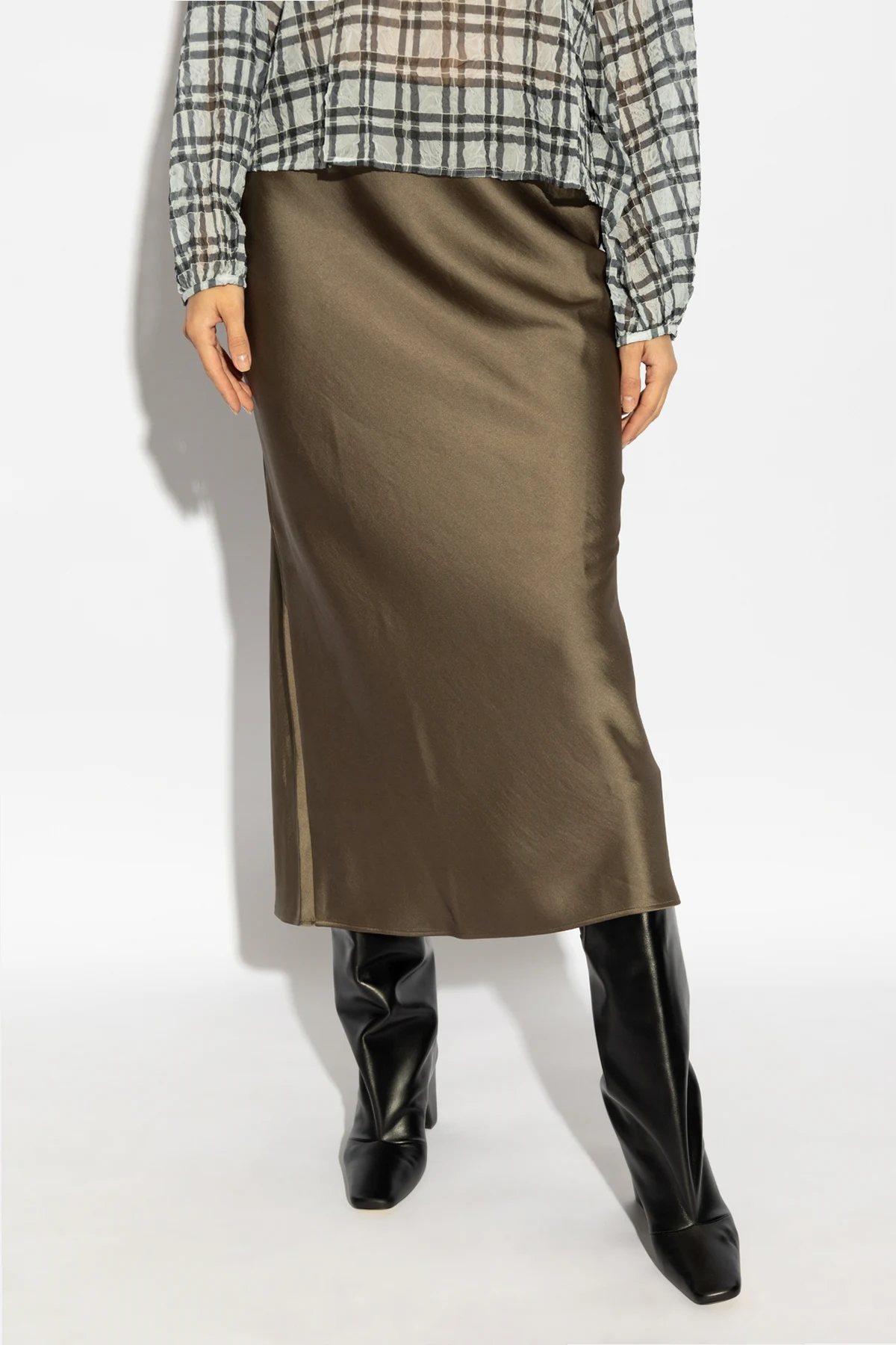 Wir präsentieren den Saagneta-Rock des renommierten Designers Samsøe Samsøe, der zeitlose Eleganz und skandinavische Schlichtheit verkörpert. Der aus recyceltem Polyester gefertigte olivgrüne Rock mit satinierter Oberfläche besticht durch seinen subtilen Glanz und die Weichheit des Materials. Seine mittlere Länge und der schlichte, leicht taillierte Schnitt machen ihn zur idealen Wahl für jeden Anlass.