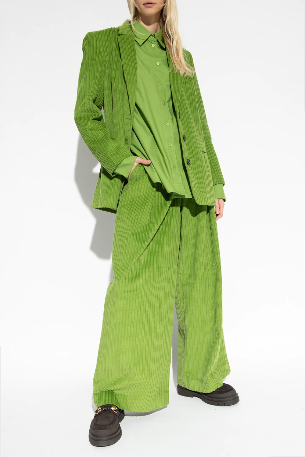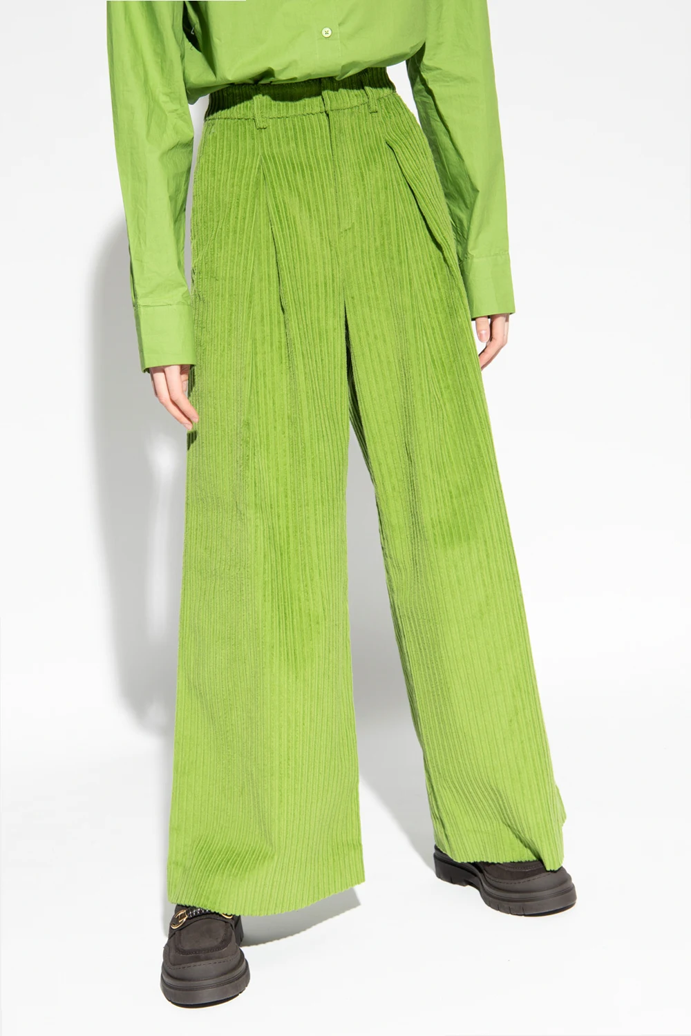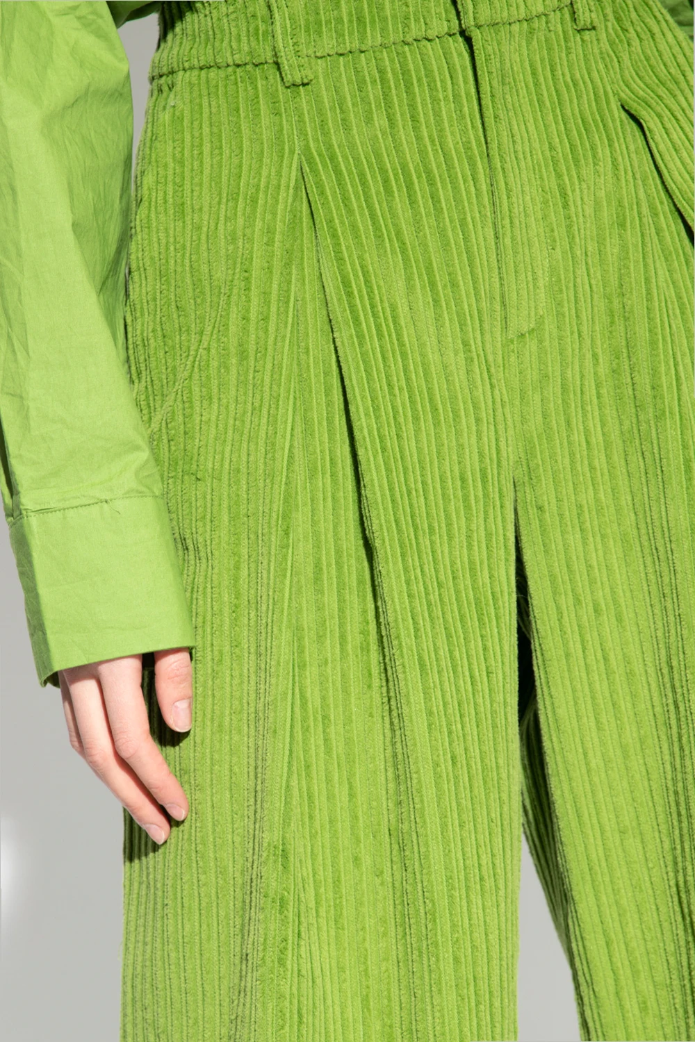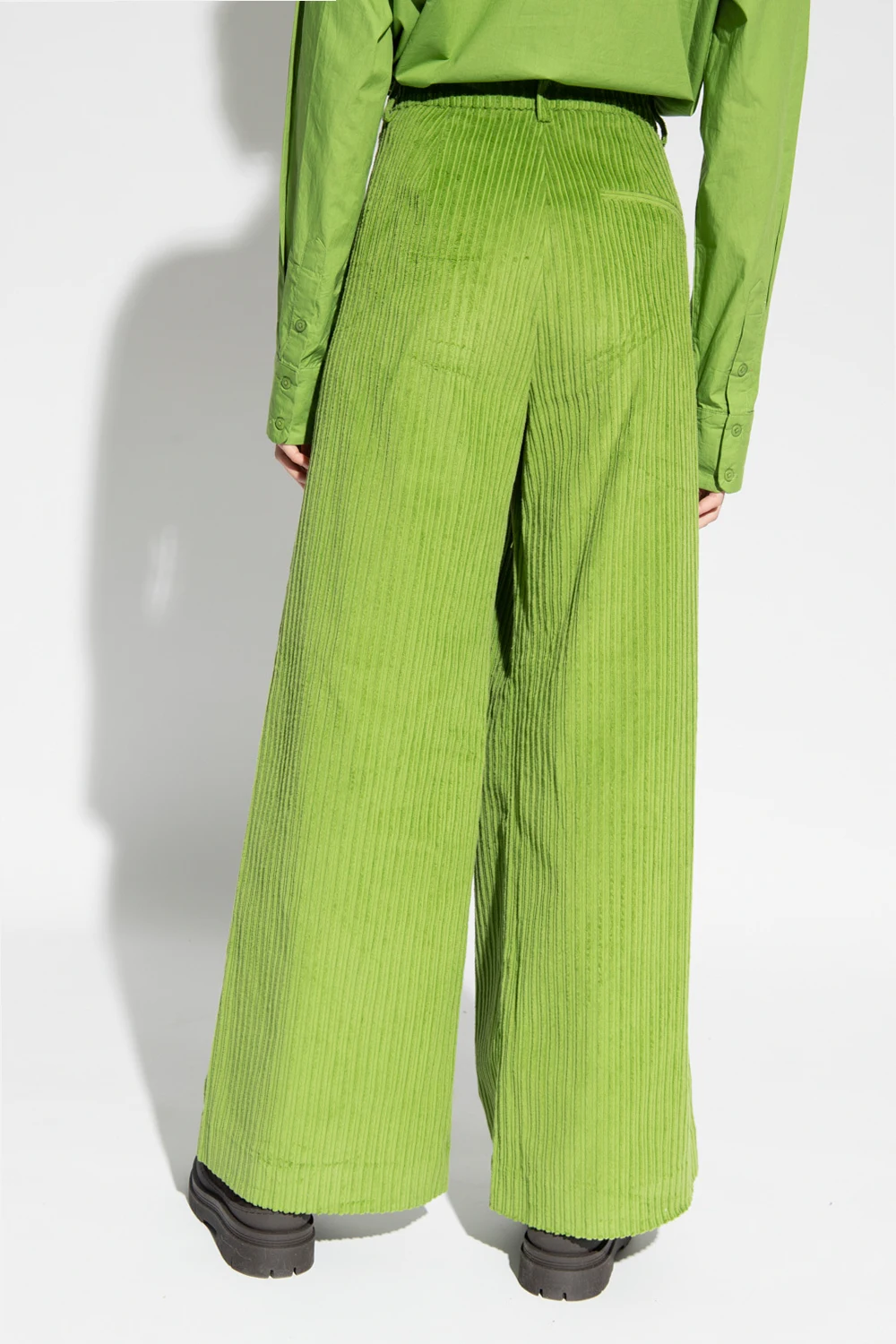 Green ‘Minced’ ribbed trousers from Gestuz. Crafted from cotton, this wide leg pair features zip and hook fastening and three slip pockets.