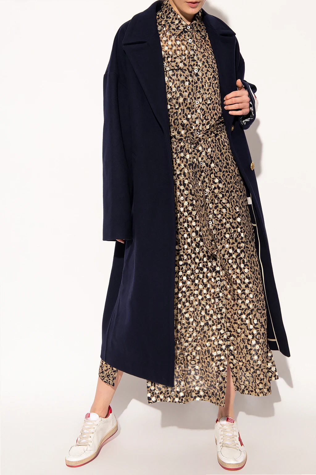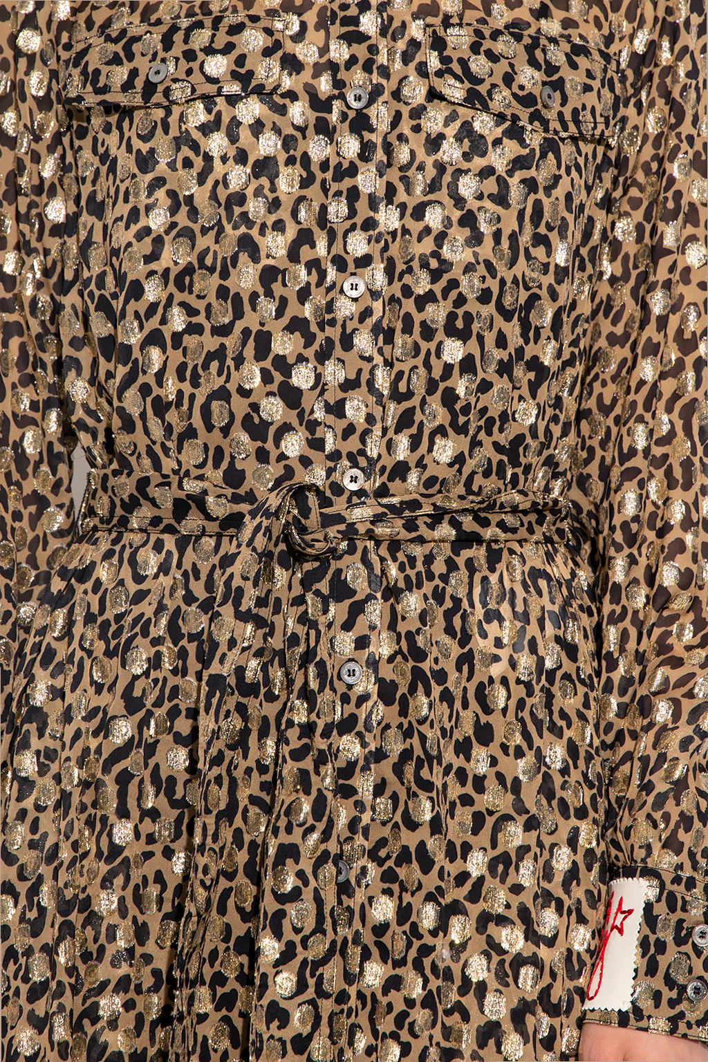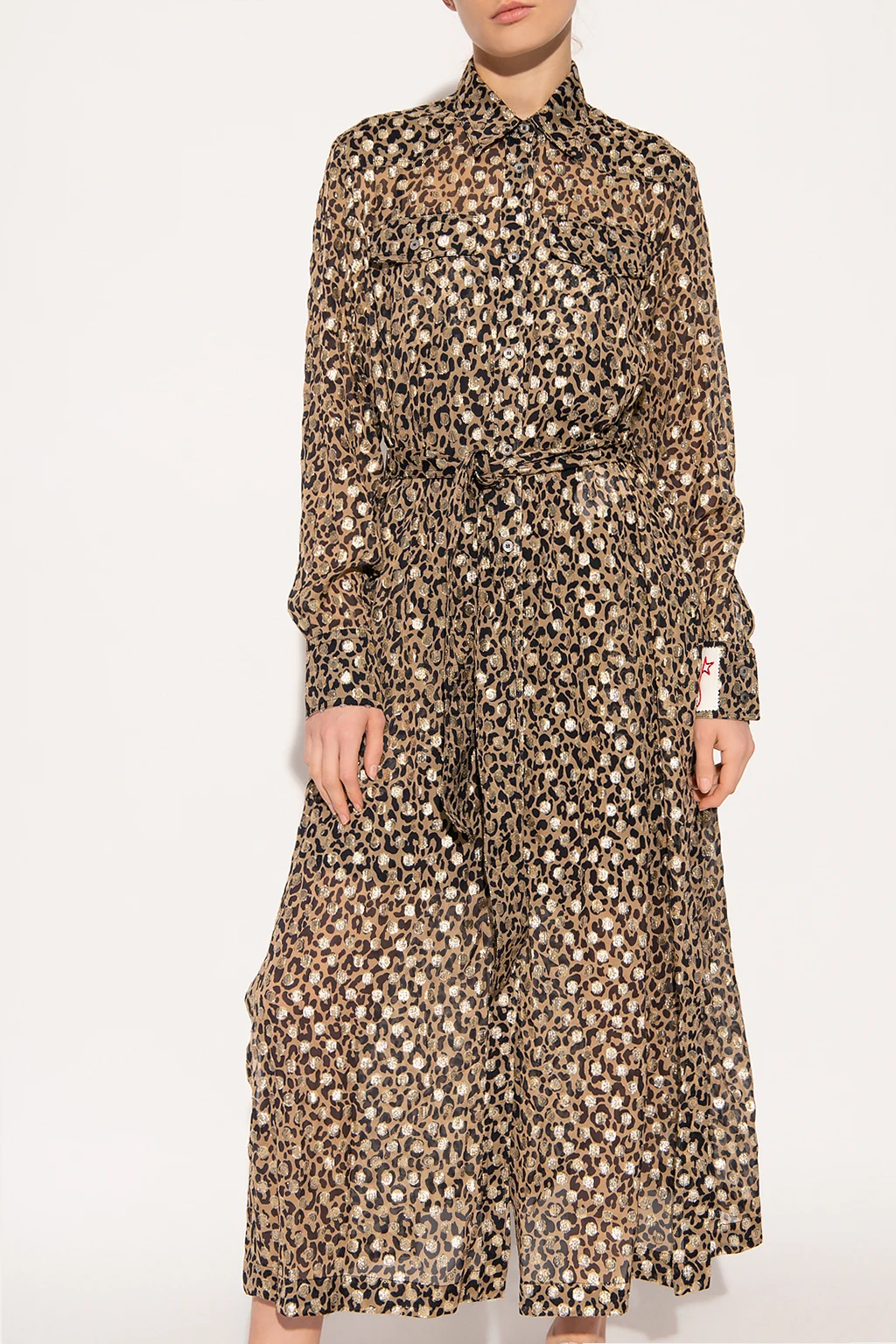 Beige, black and gold-tone dress from Golden Goose. Emblazoned with an animal motif and a white patch with a red logo, this style features button fastenings, a waist-cinching belt, two flapped pockets with buttons, and bottom splits.