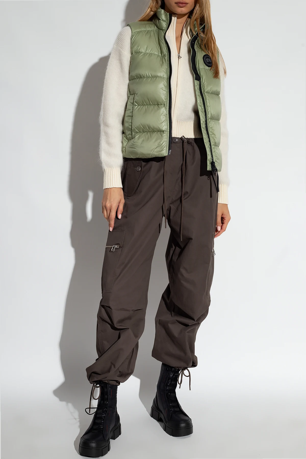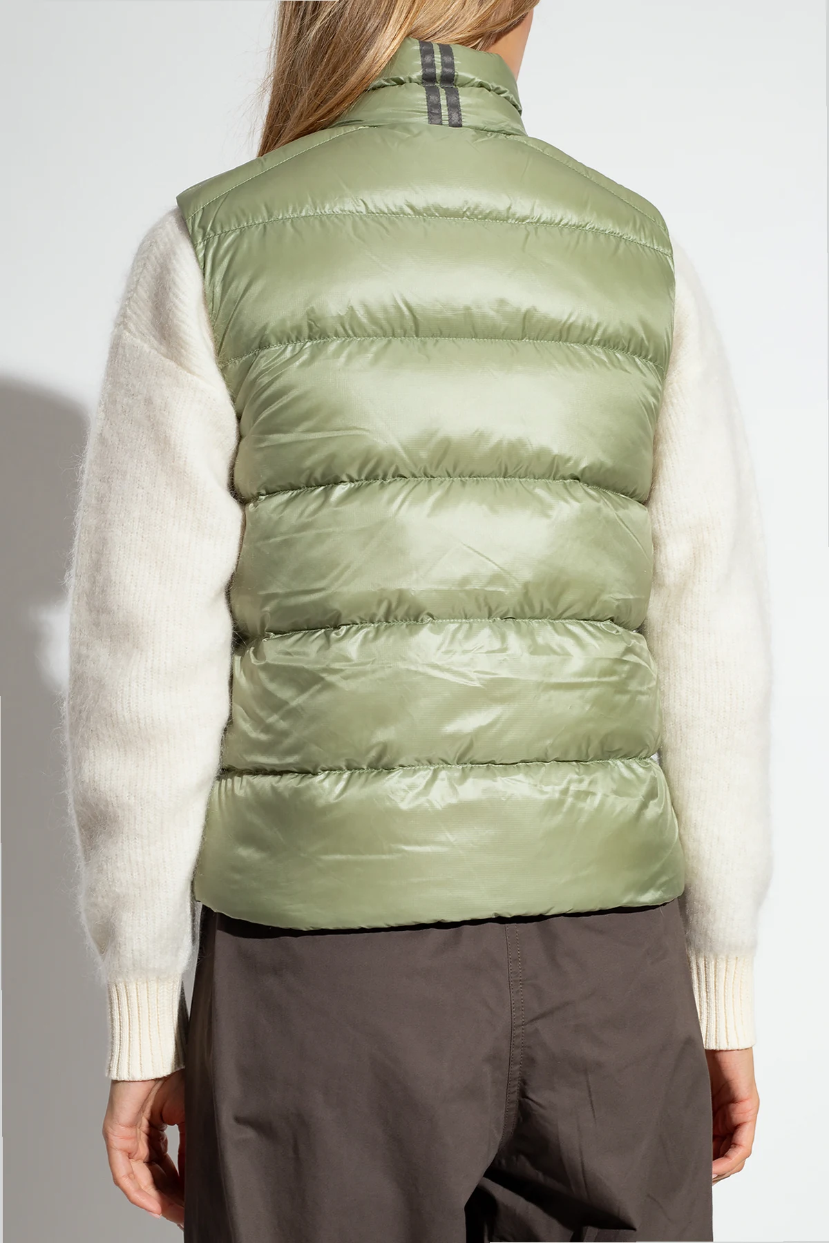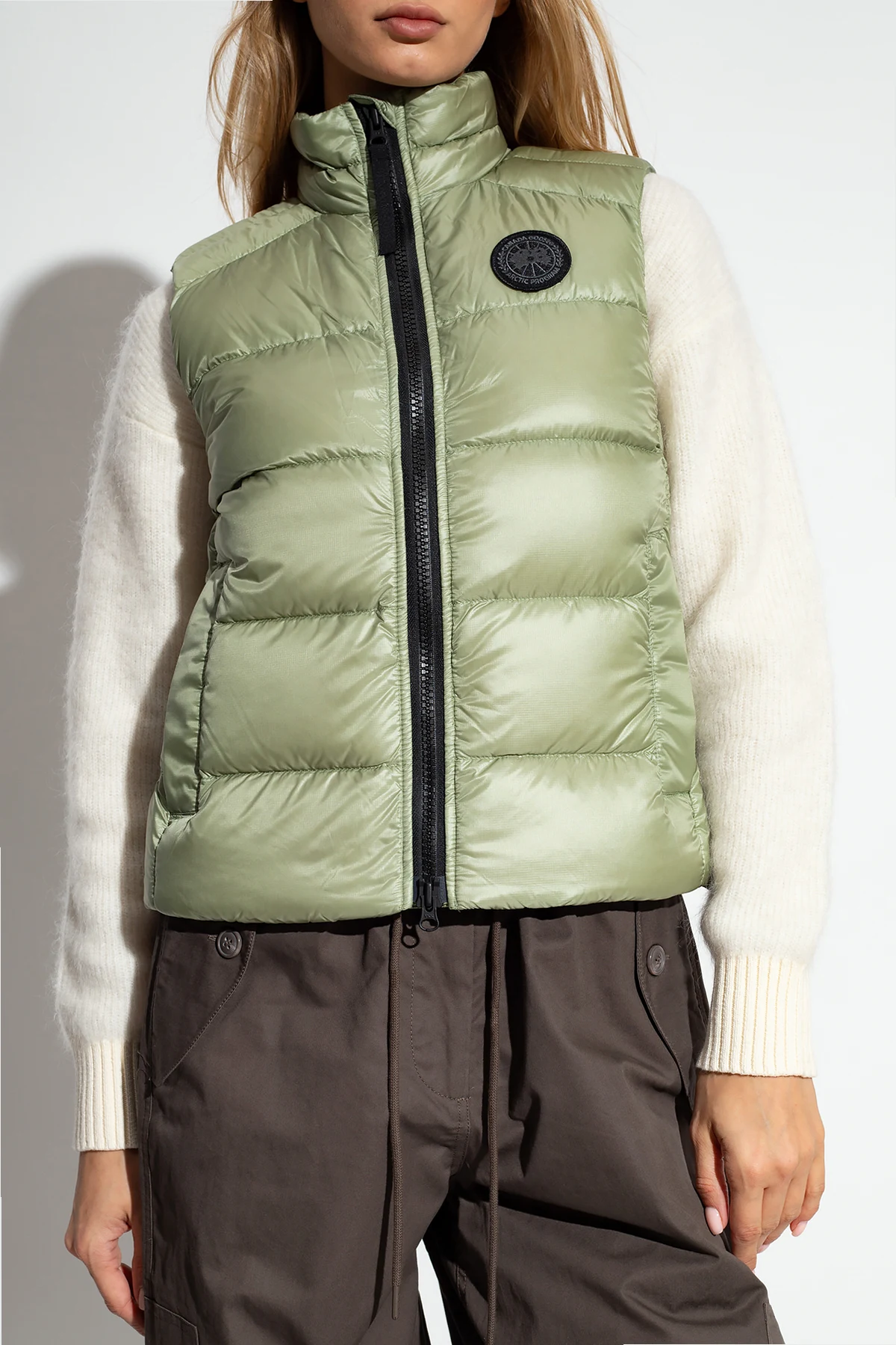 Green ‘Cypress’ down vest with a stand collar from Canada Goose. Crafted from light, water and wind-proof fabric, this design features a two-way zip, black logo patch, two zip pockets and a drawstring hem.