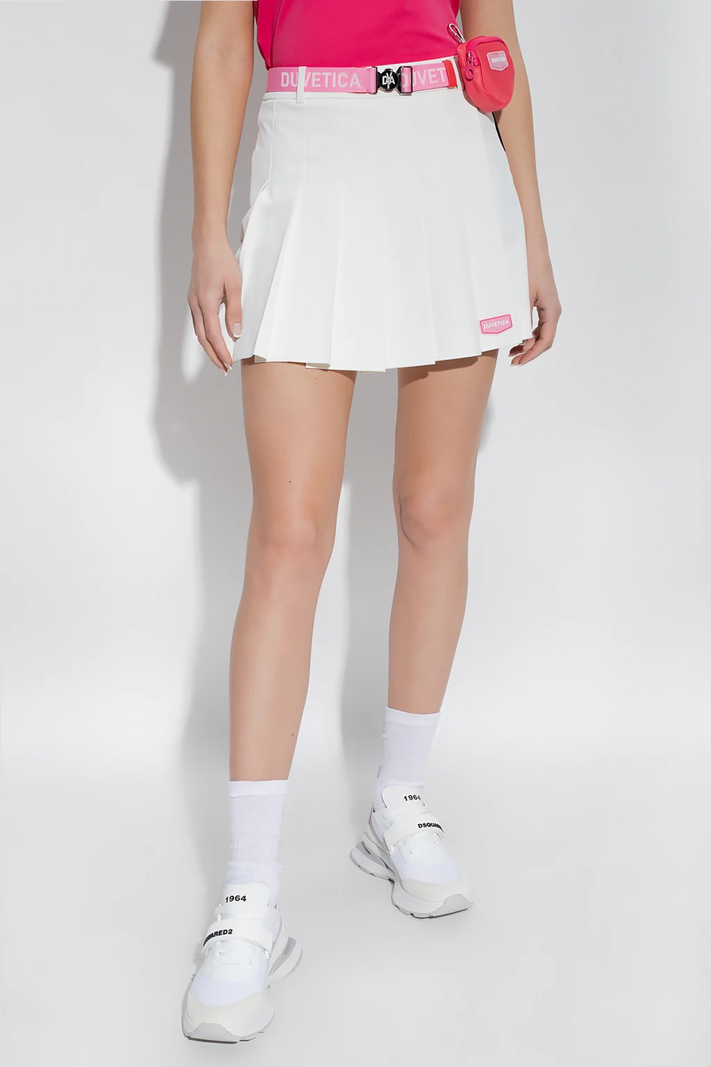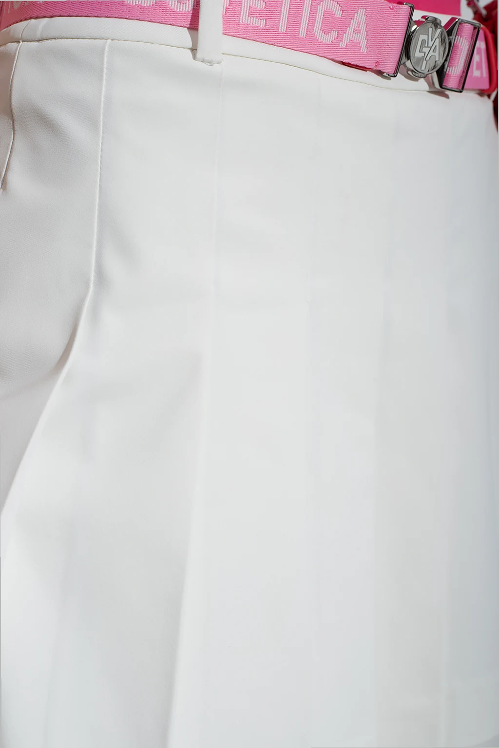 White ‘Mincana’ shorts from Duvetica. Emblazoned with a rubber logo patch, this pair features a side zipper, a pleated insert on the front, two back zip pockets and an attached pink belt with a logo detail, silver-tone buckle and a detachable zip sachet.
