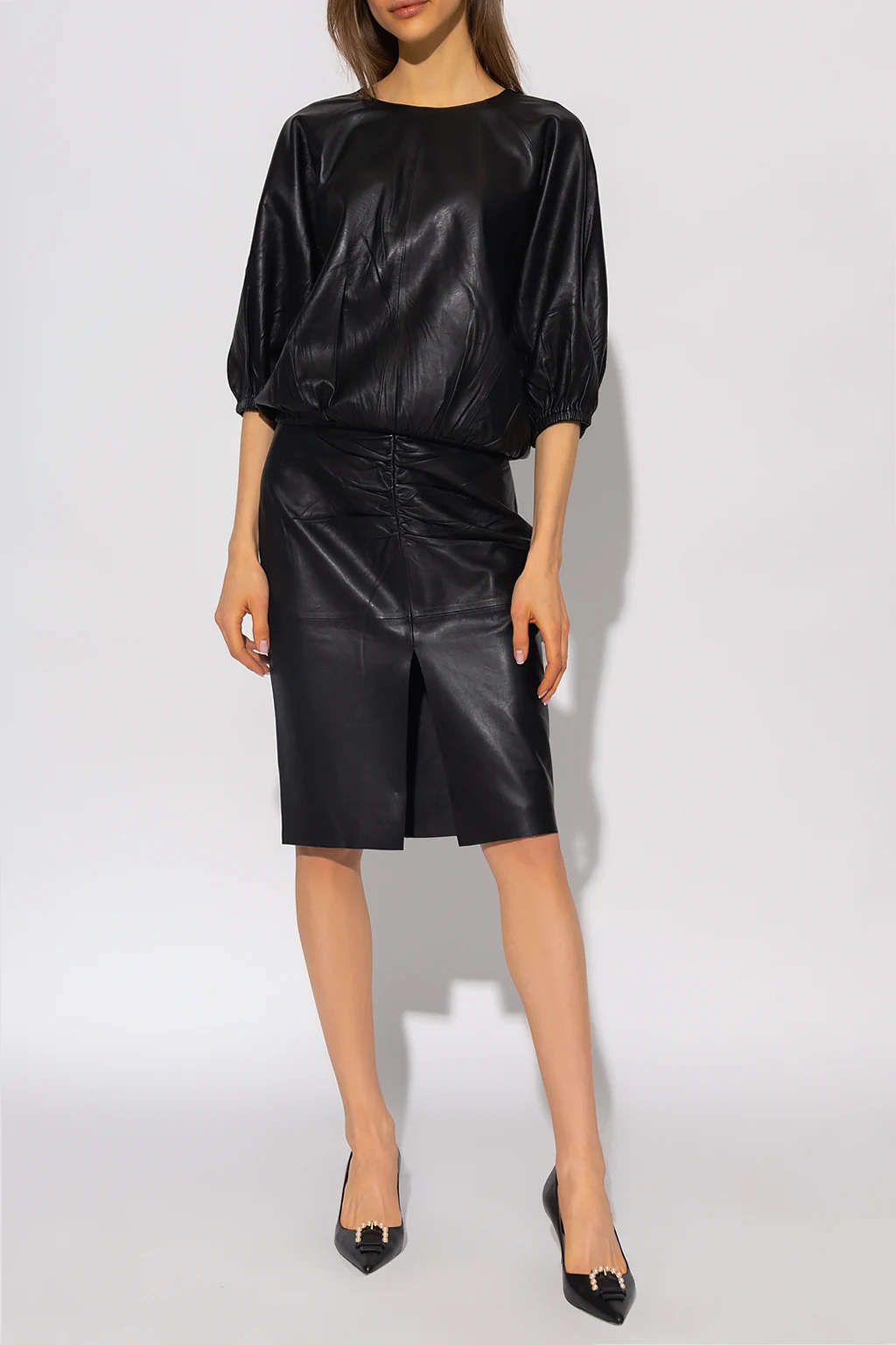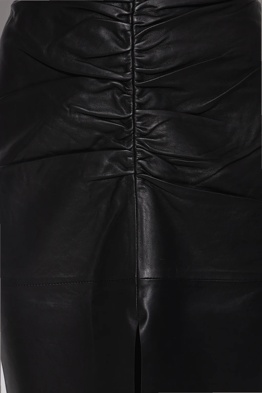 Black ‘Chia’ skirt from Notes Du Nord. Crafted from soft lamb leather, this style features a hidden zip fastening on the side and a gathered front with a vent.