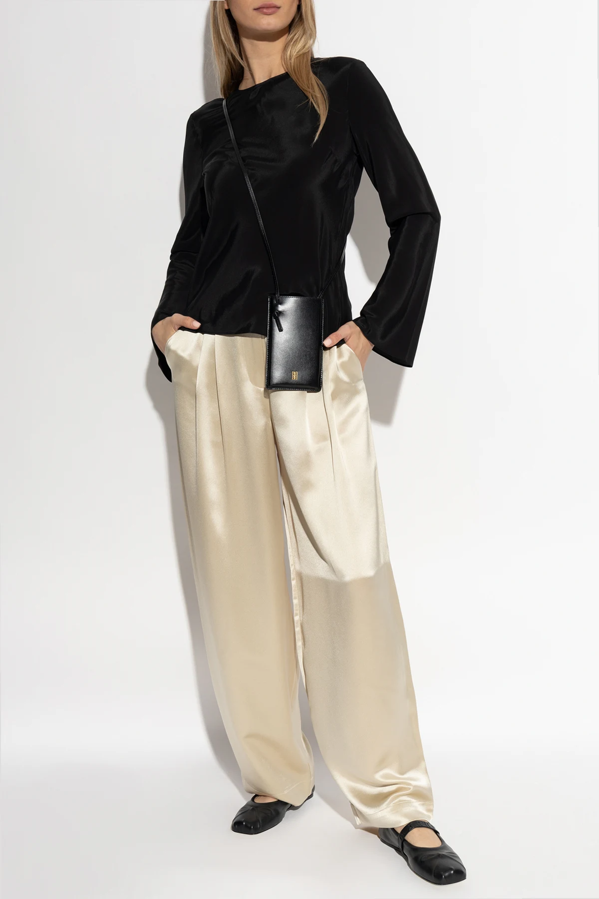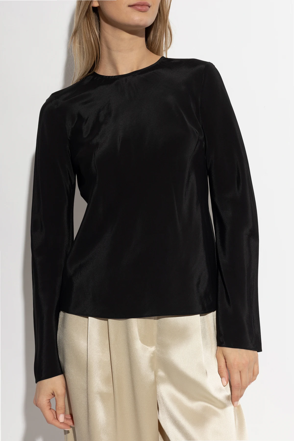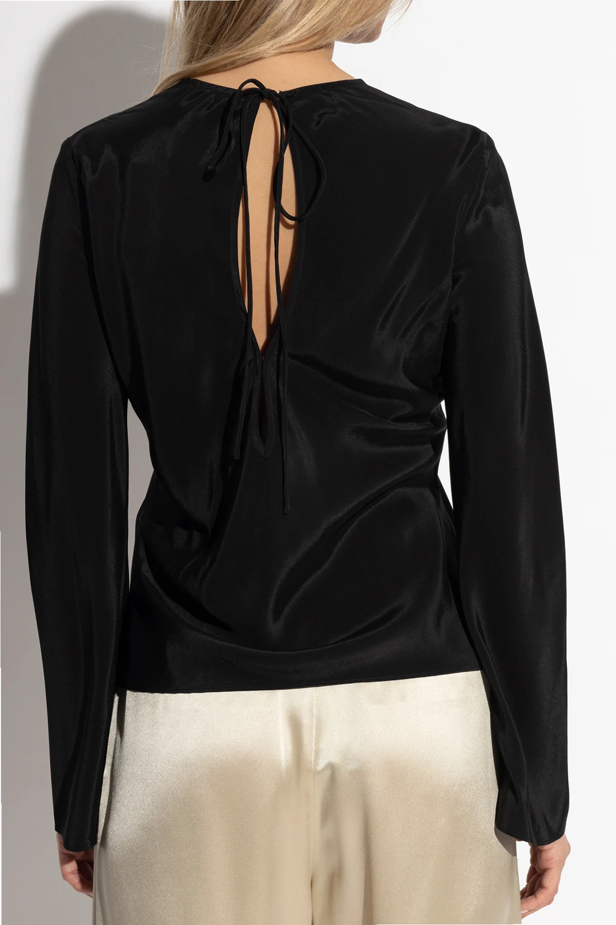 Dieses schwarze Top zeichnet sich durch Einfachheit und Raffinesse aus. Es verfügt über lange Ärmel und einen leicht lockeren Schnitt, was es zur idealen Wahl für formelle und halbformelle Anlässe macht. Der klassische Schnitt mit Rundhalsausschnitt und das sinnliche Bindeband auf dem offenen Rücken sind die Quintessenz des minimalistischen skandinavischen Stils.