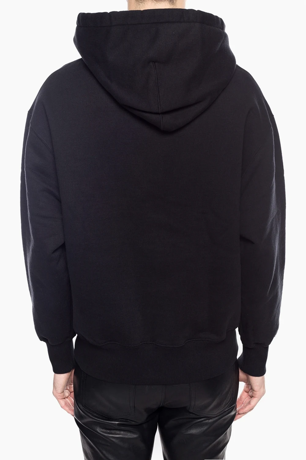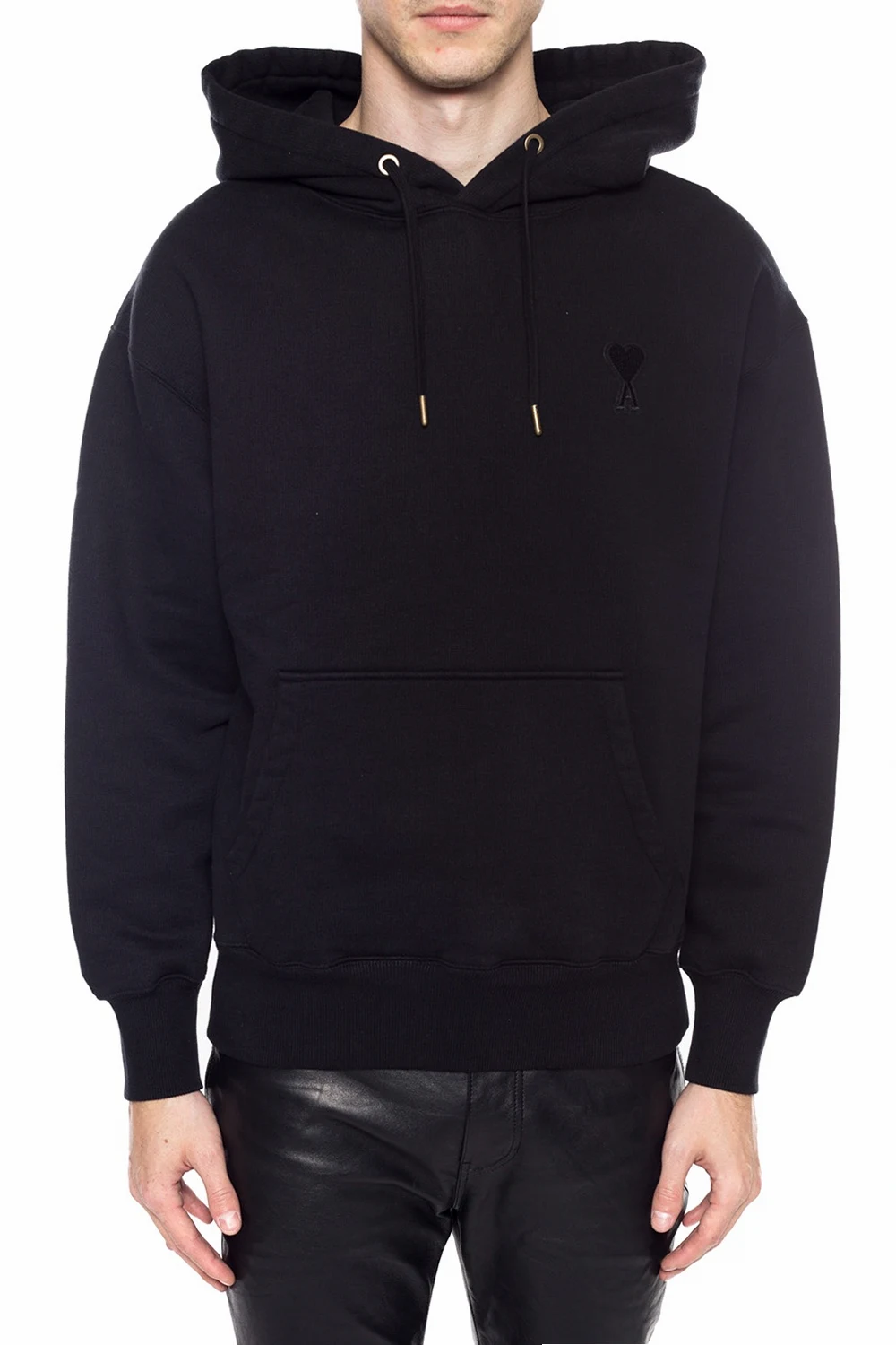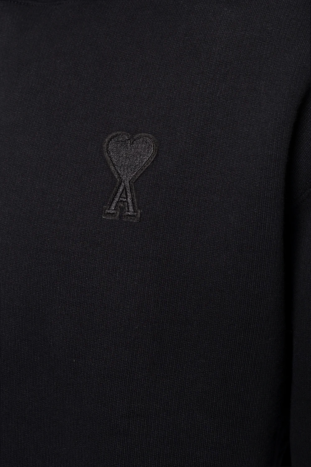 Black sweatshirt with a drawstring hood from Ami Alexandre Mattiussi. Made of cotton. Features slip pocket and logo patch on the front as well as a ribbed bottom hem and cuffs.