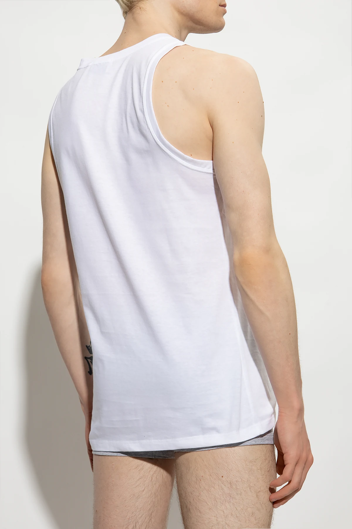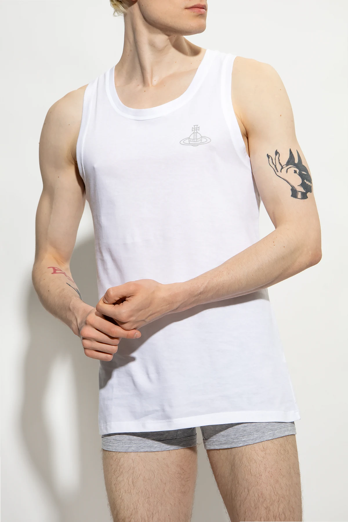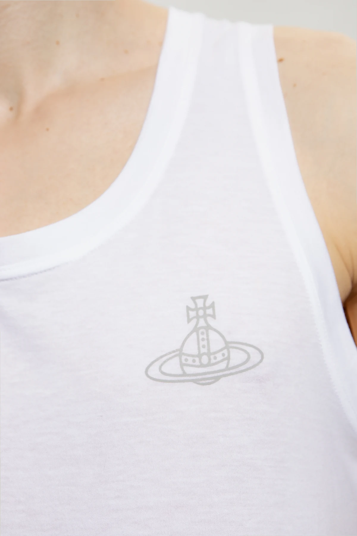 2-pack of white sleeveless T-shirts from Vivienne Westwood, the ‘Underwear’ collection. Made of organic cotton, each garment features a grey logo print and ribbed crew neck.