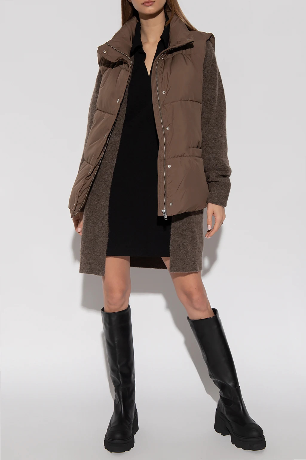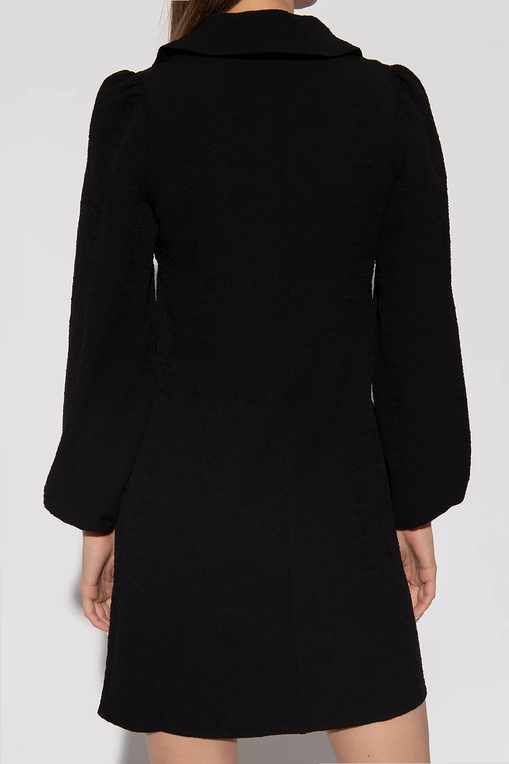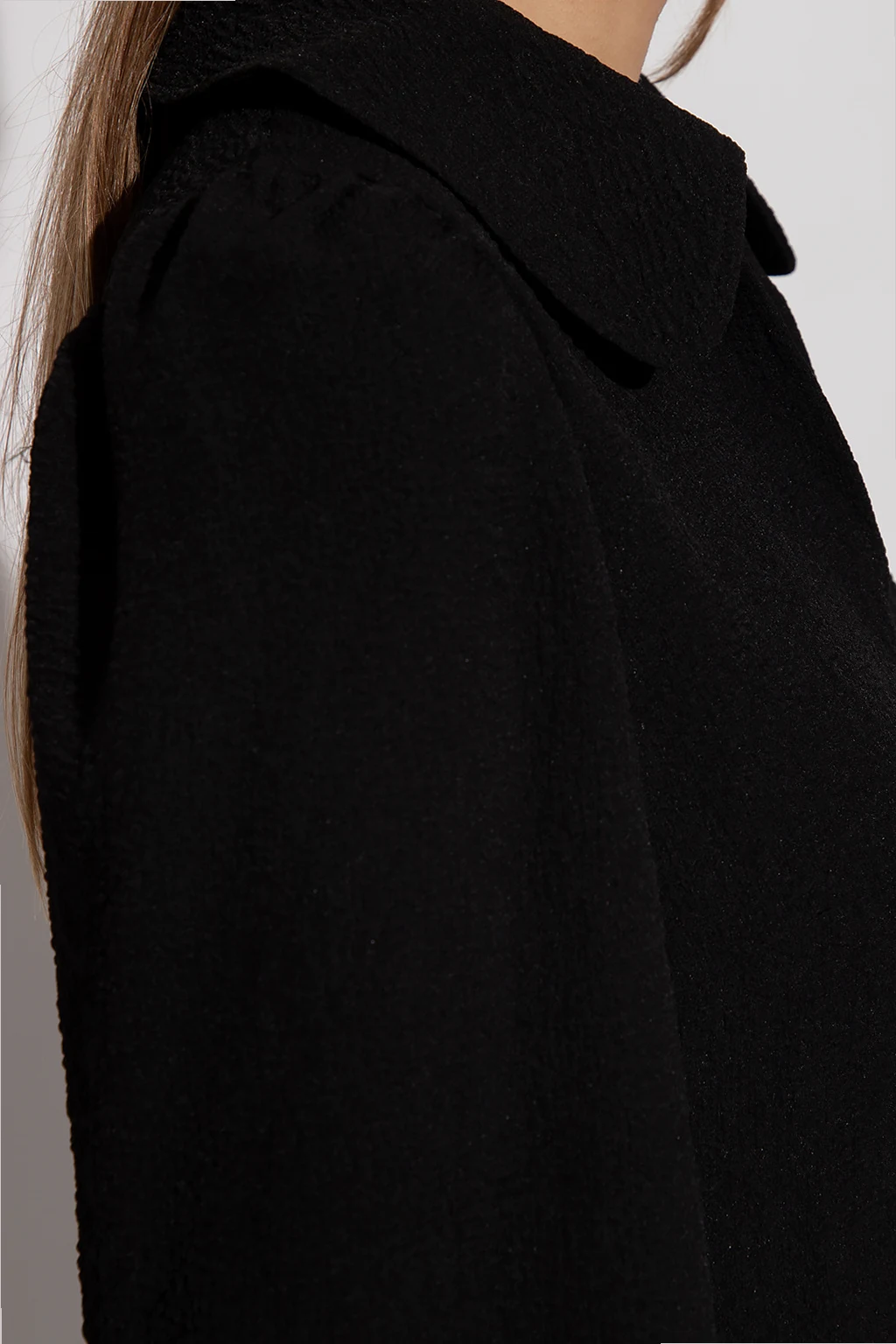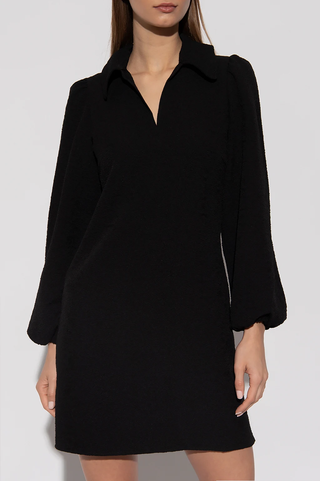 Black dress from Samsoe Samsoe. Made of recycled textured fabric, V-neck collar and long sleeves with ribbed cuffs.