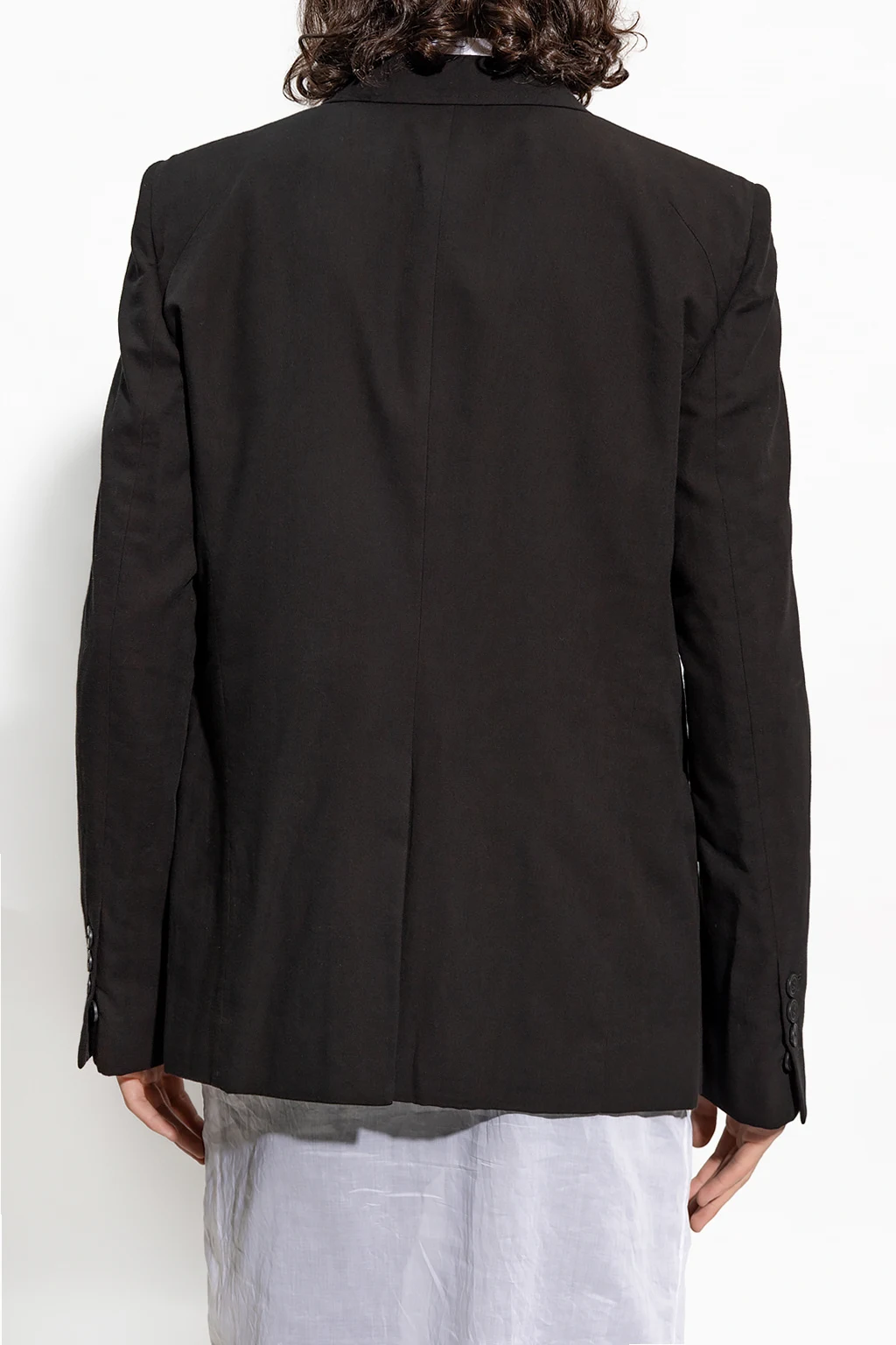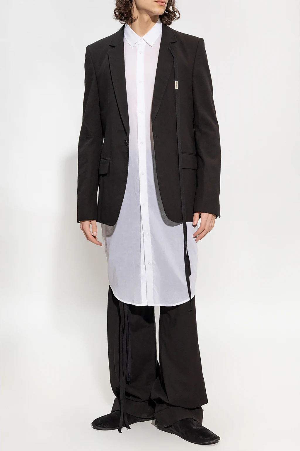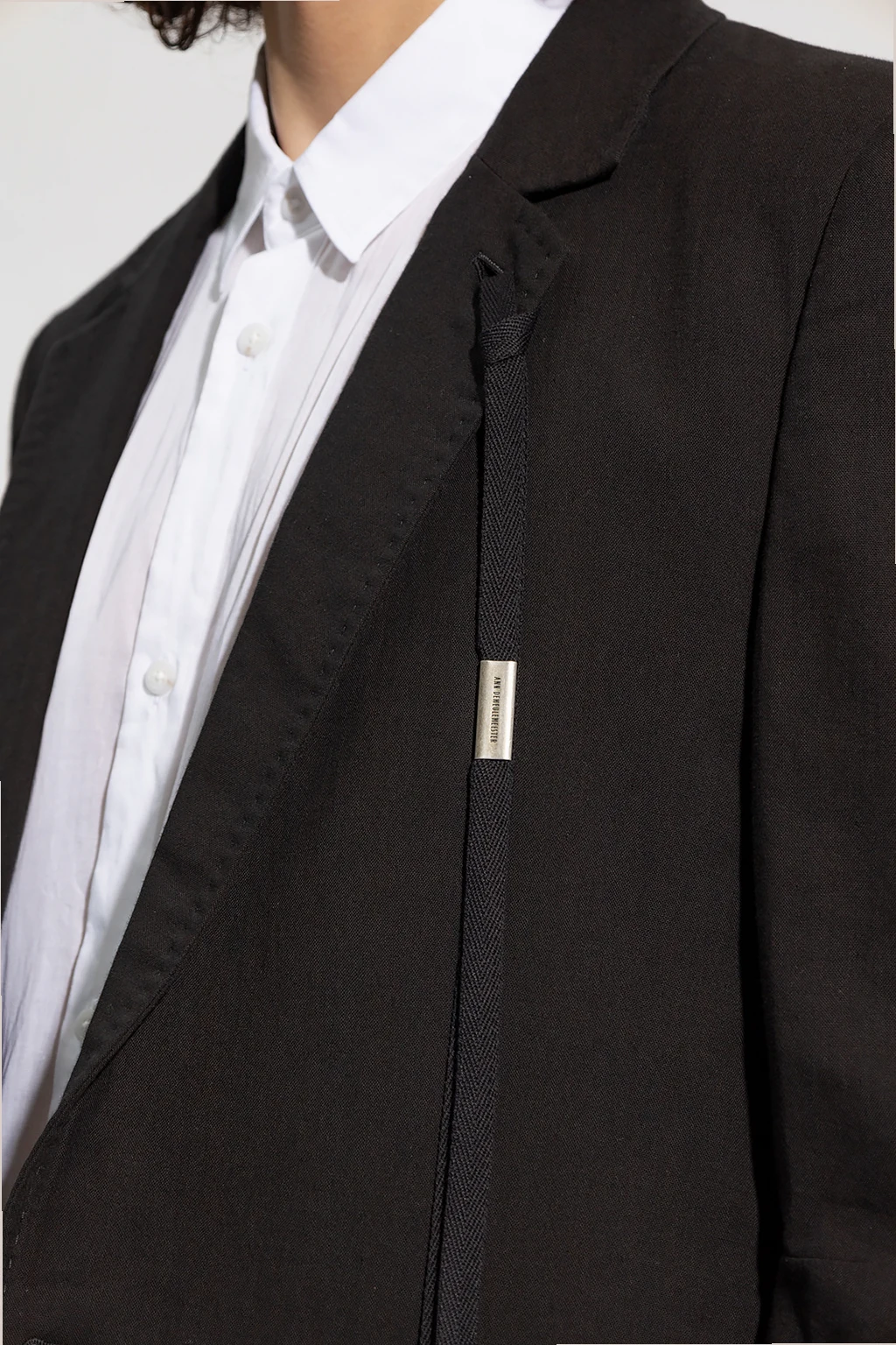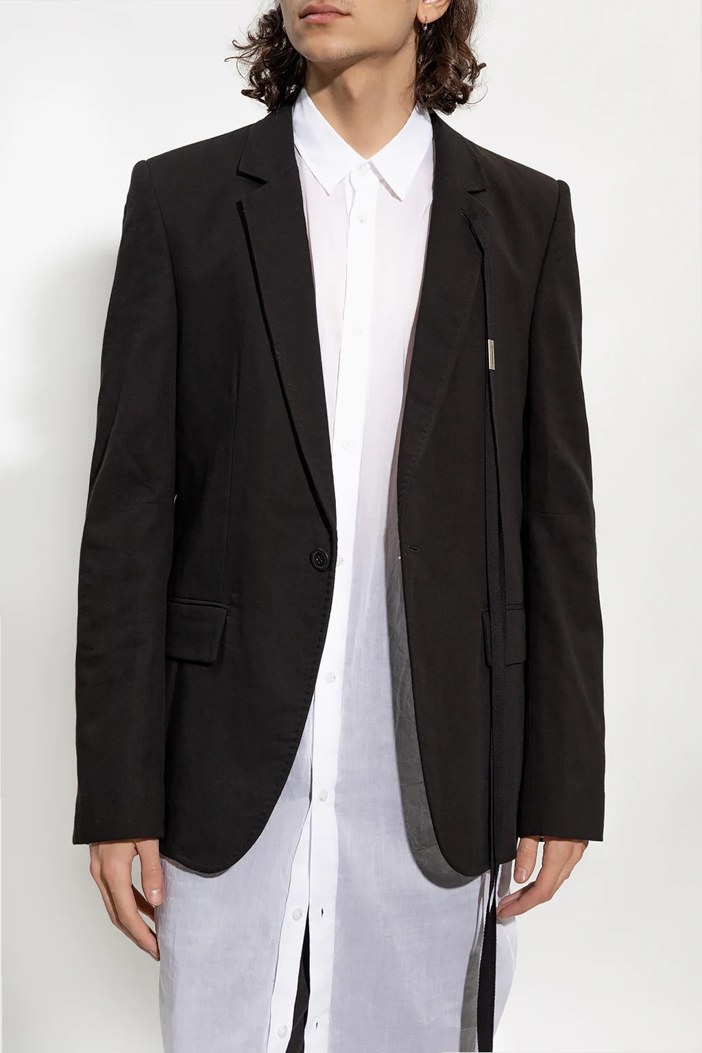 Black ‘Kobe’ blazer from Ann Demeulemeester. Made of cotton, this style fastens with a button and showcases a signature ribbon with logo-engraved hardware. It is complete with a single back vent, notch lapels, two flapped pockets and long sleeves with button closures.