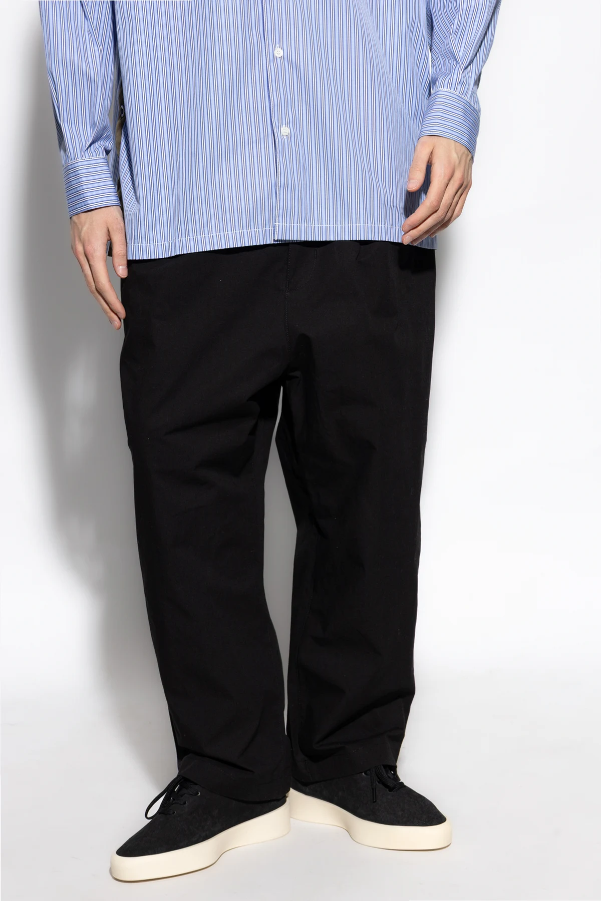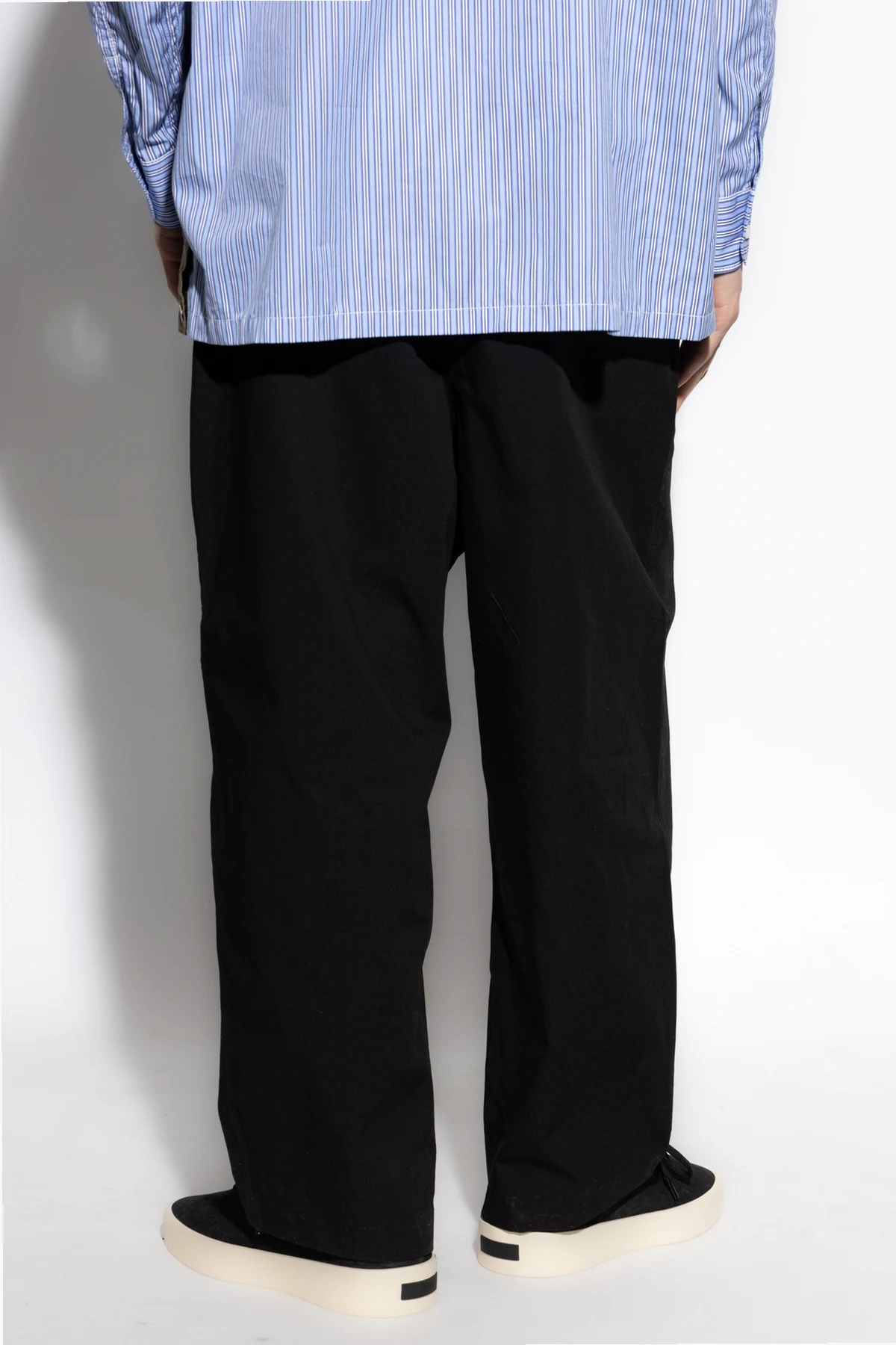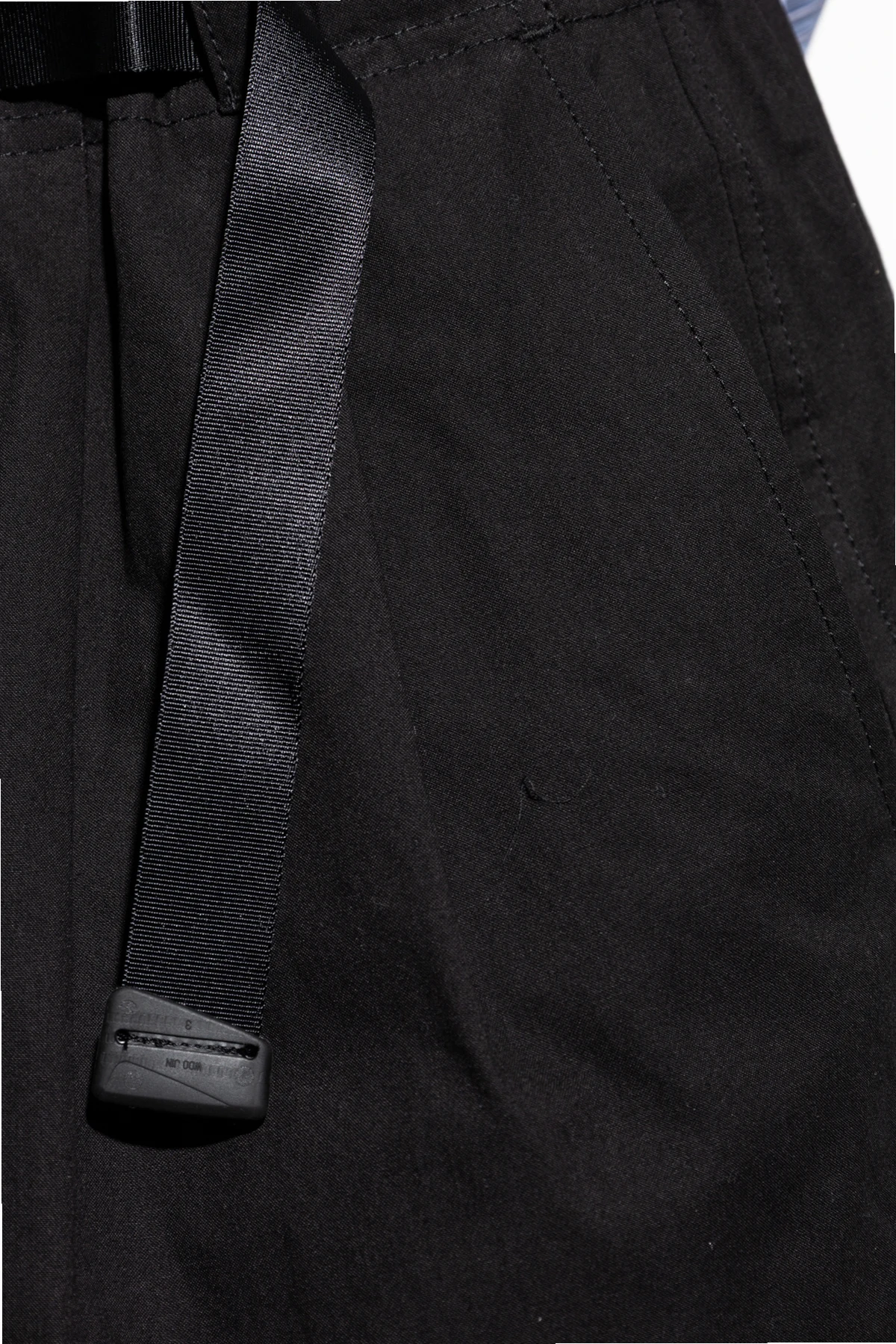 Hergestellt aus einer Kombination von Baumwolle und Nylon , zeichnen sich die Hosen durch eine glatte Oberfläche und Strapazierfähigkeit aus und bieten den ganzen Tag über Tragekomfort. Der lockere Schnitt verleiht ihnen einen etwas lässigen Charakter, und die Einfachheit des Designs wird durch den funktionalen Gürtel mit Schnalle betont, der ein integraler Bestandteil dieses künstlerischen Werkes ist.