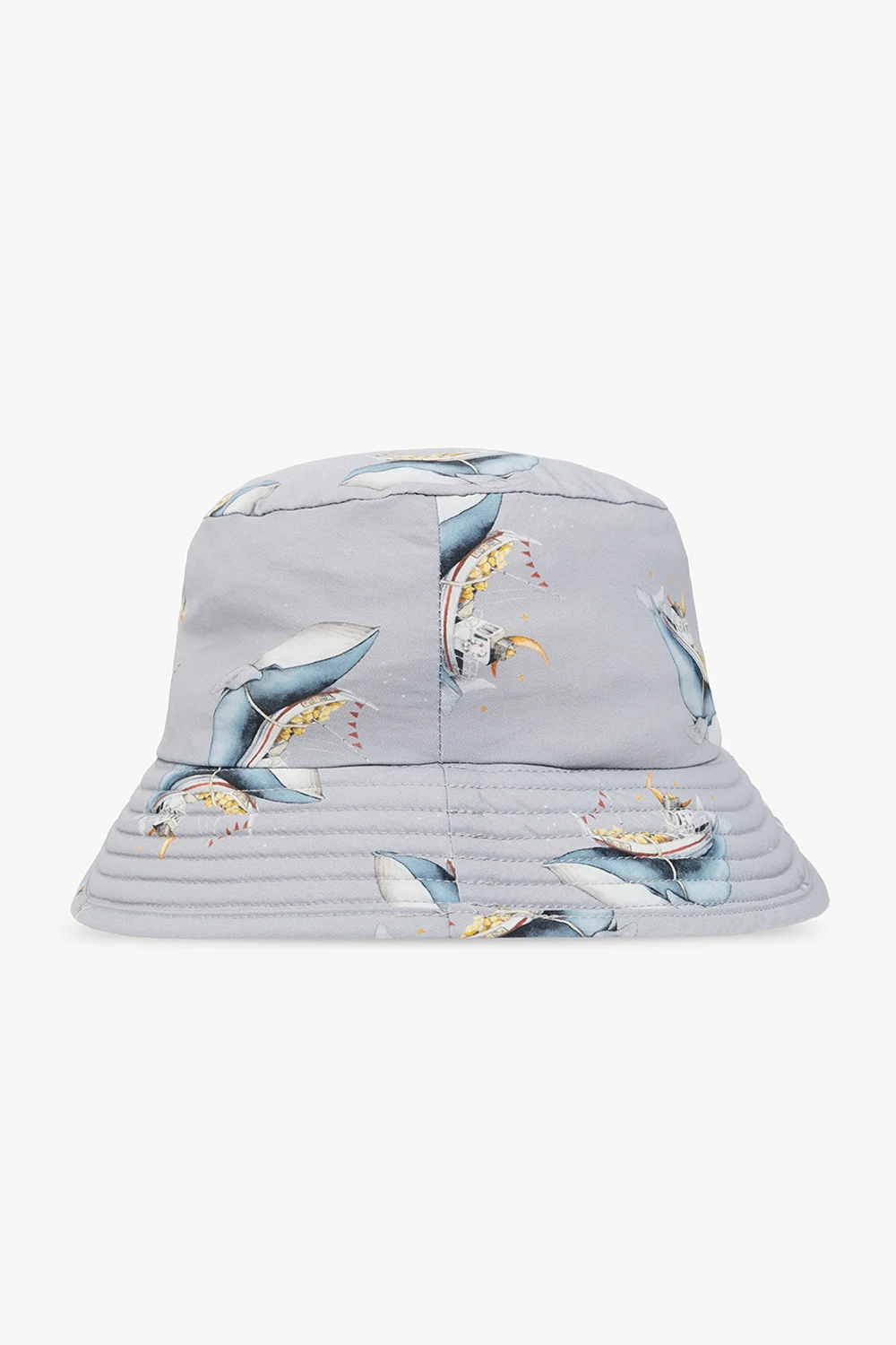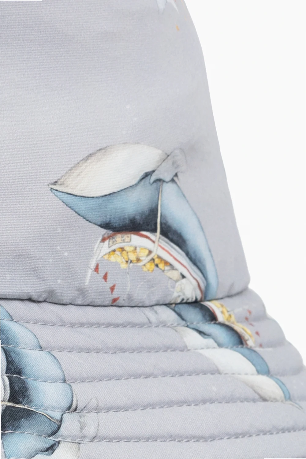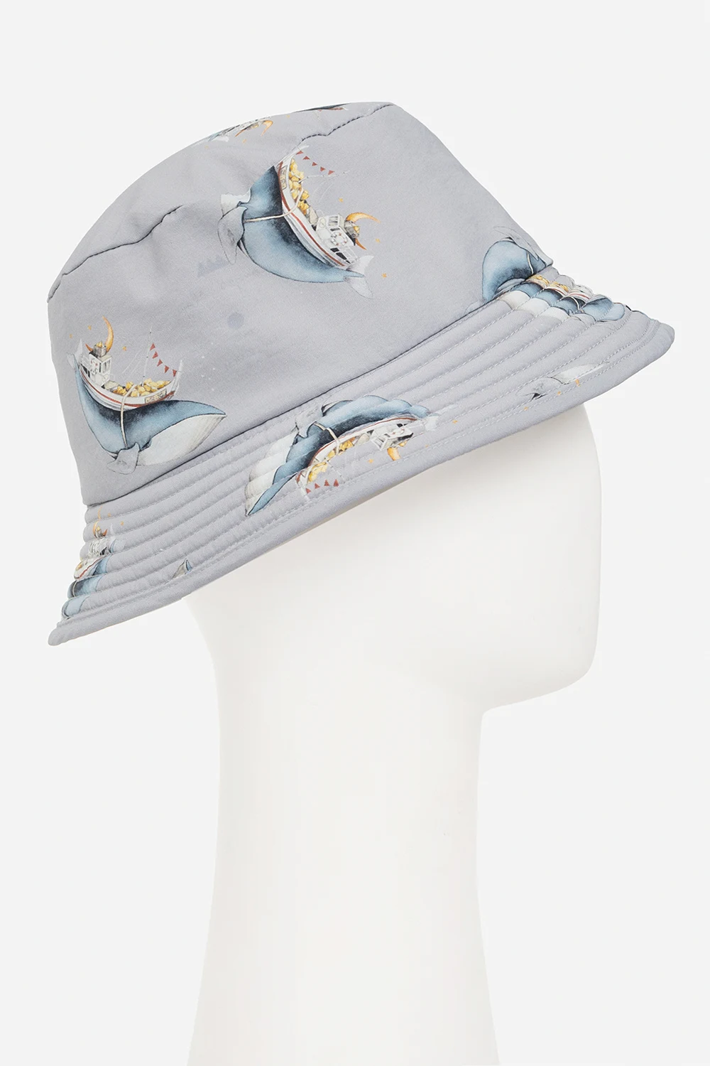 Blue bucket hat from Konges Slojd. Made of fabric with a UPV 50+ filter, this item is decorated with a multicolored whale motif.