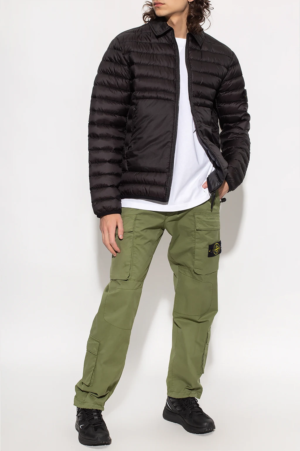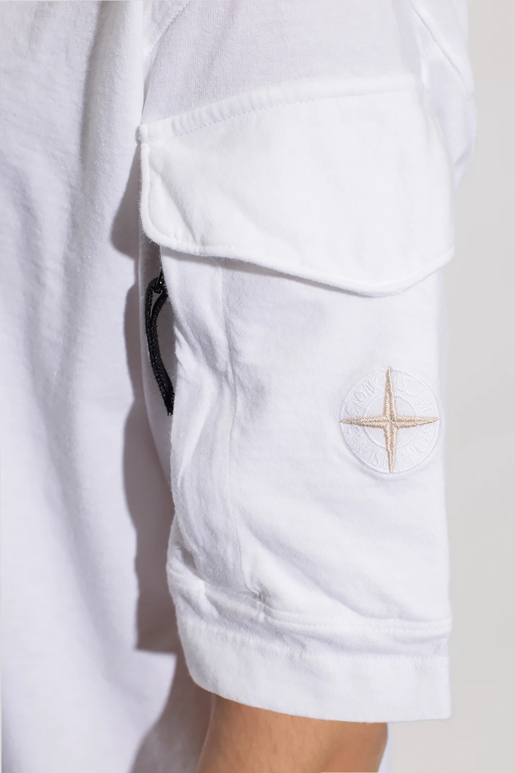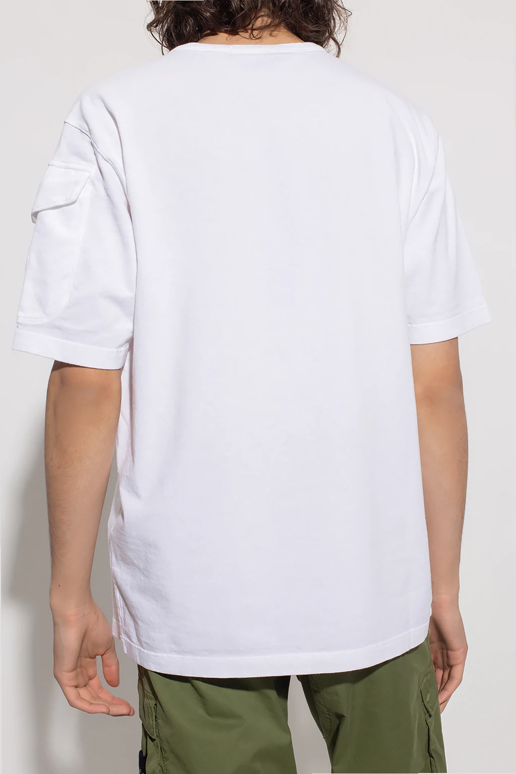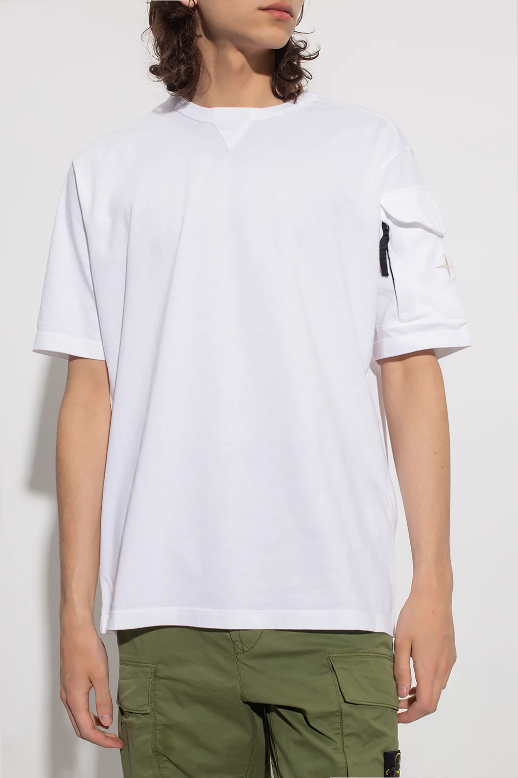 White crewneck T-shirt from Stone Island. Crafted from cotton, this short sleeve design features a snap-fastened flap pocket with a black zip on one sleeve and cream logo embroidery.