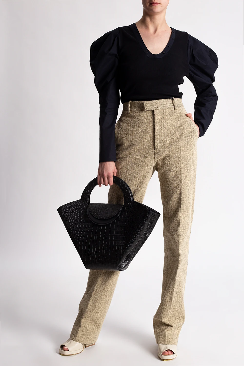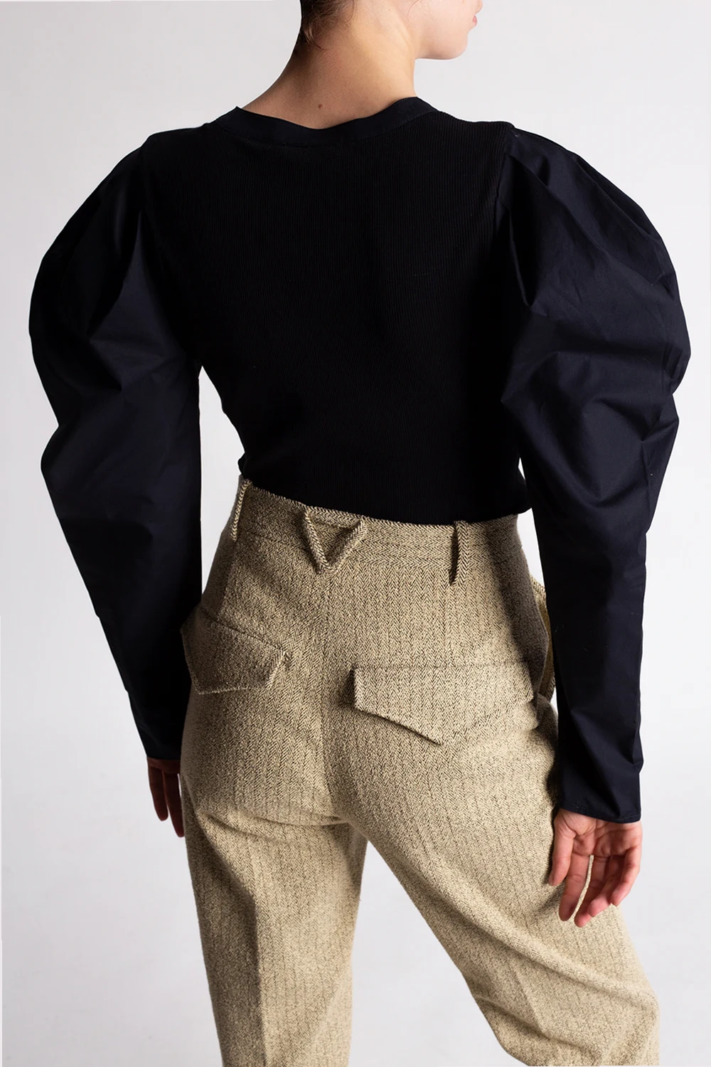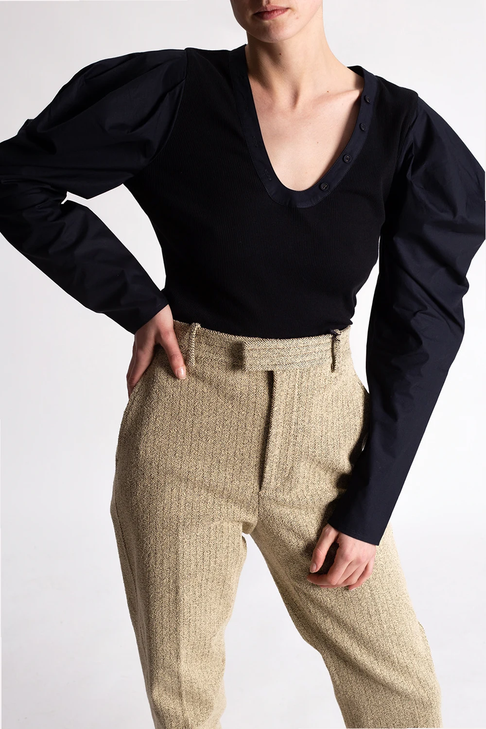 Black ‘Flynn’ top from Ulla Johnson. Crafted from cotton with ribbed detailing, this style features a plunging neckline, and long, puff sleeves.