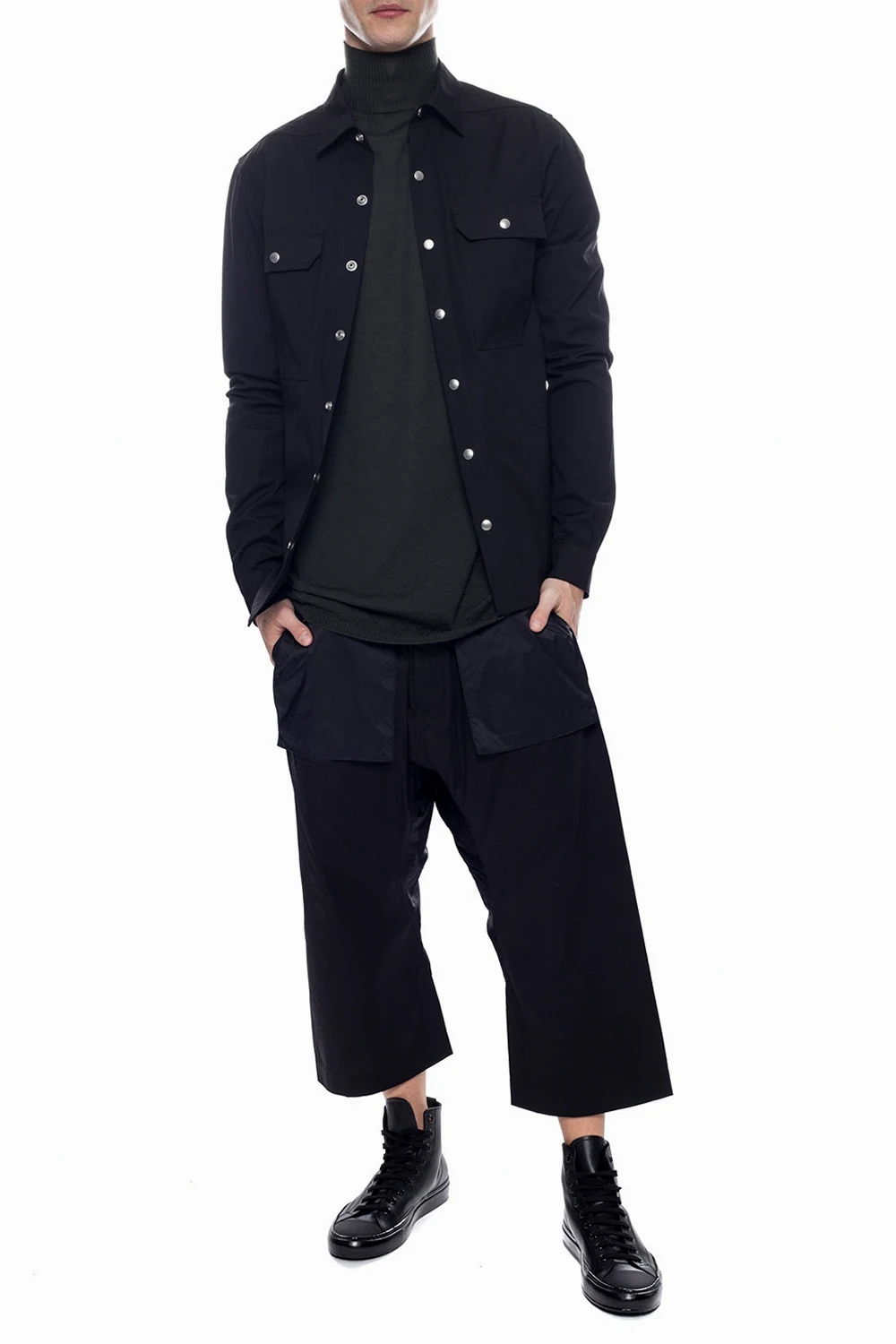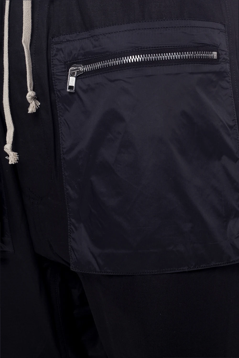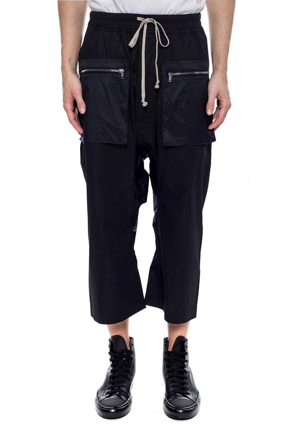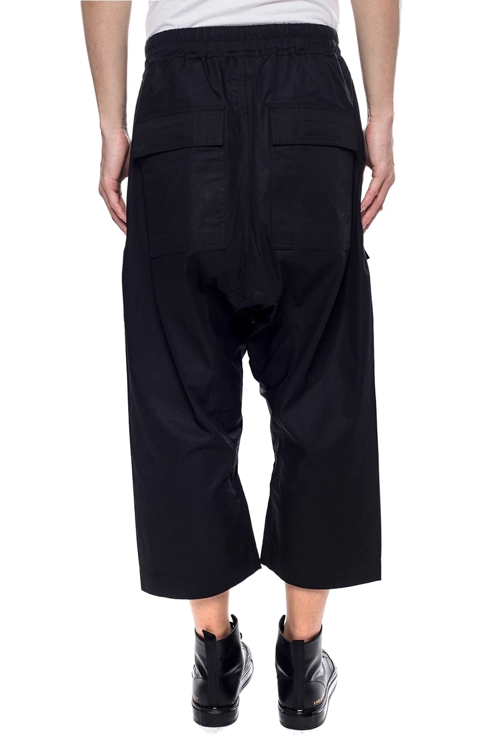 Black drop crotch trousers from Rick Owens DRKSHDW. Made of cotton. Fastened with drawstrings and buttons. Two zip pockets on the front, two flap pockets fastened with velcro at the back. 3/4 length legs.