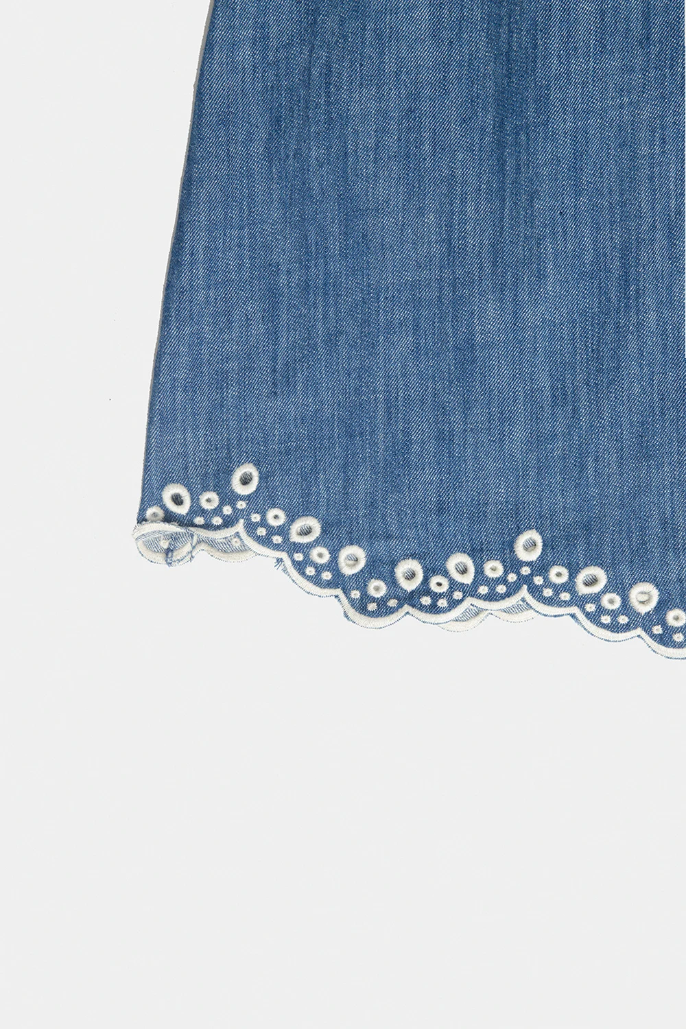 Dark blue denim top dress from Zimmermann Kids. Enriched by a colourful bee patch on the front, this style features a relaxed fit, a self-tie neckline and ruffle detailing with cream embroidery on the collar, short sleeves and bottom hem.