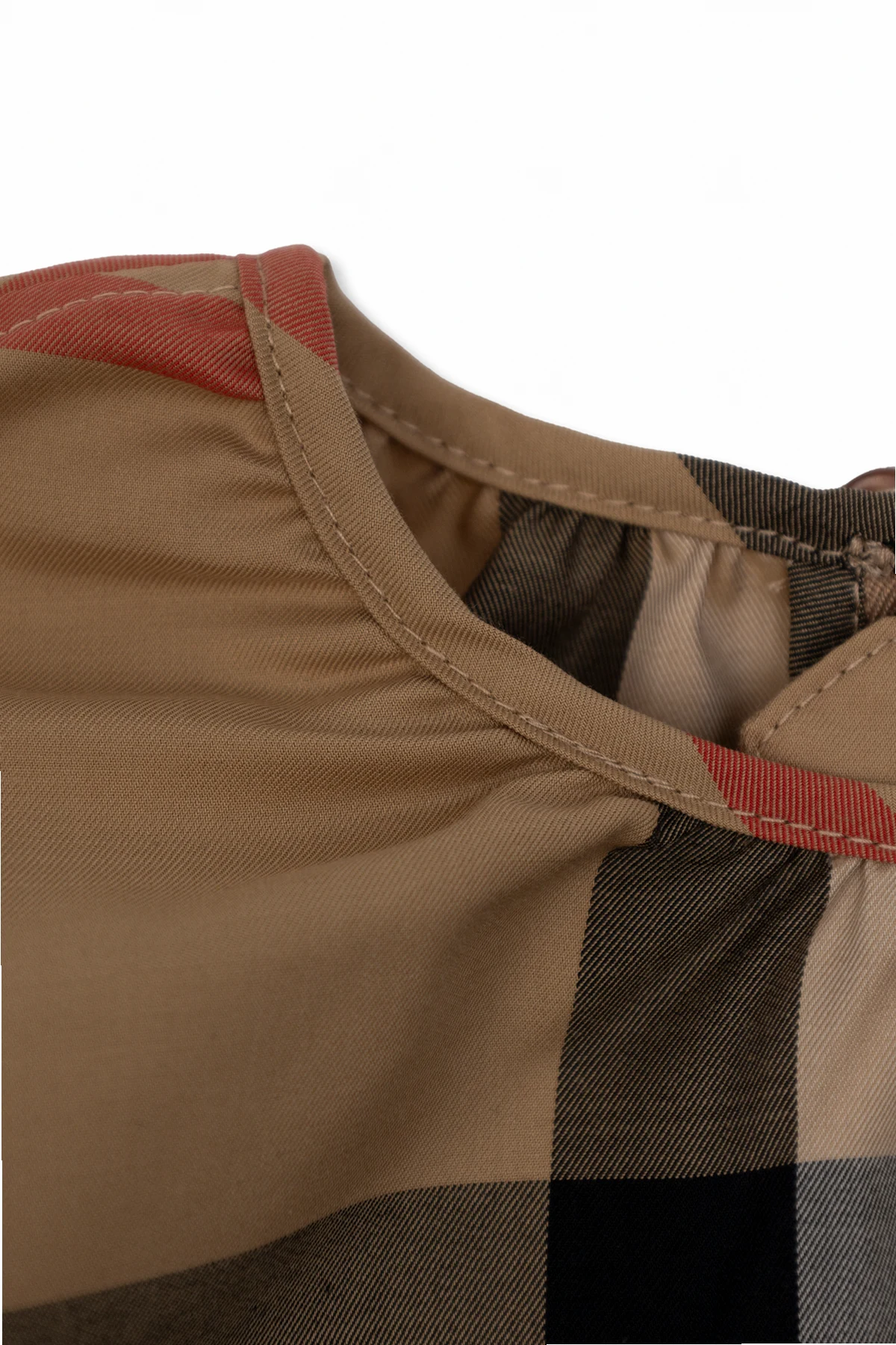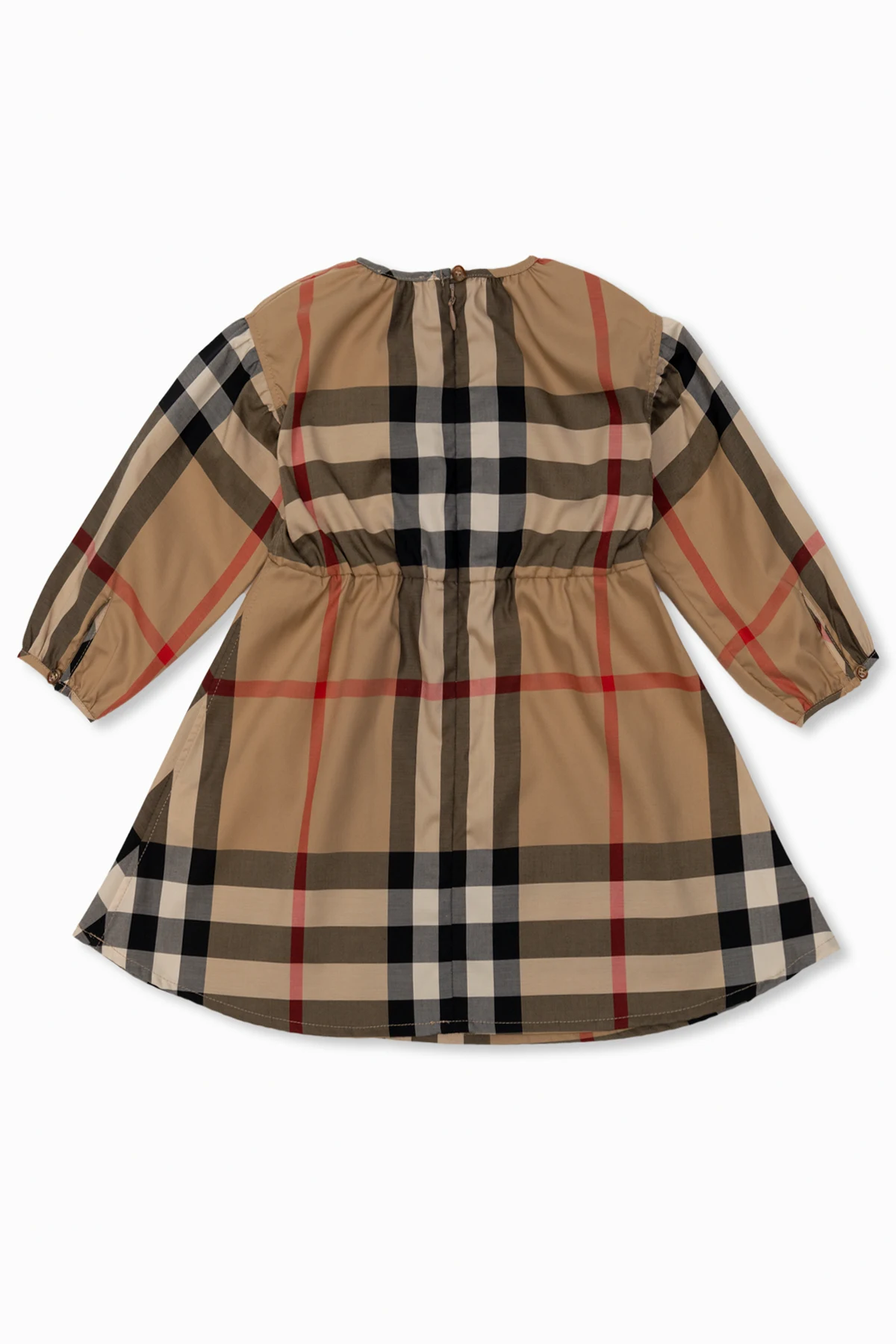 Beige ‘Savannah’ dress from Burberry Kids. Made of cotton, this style fastens via a hidden zip and button on the back and showcases the brand's signature check motif. It is complete with a round neck and long sleeves with button closures.