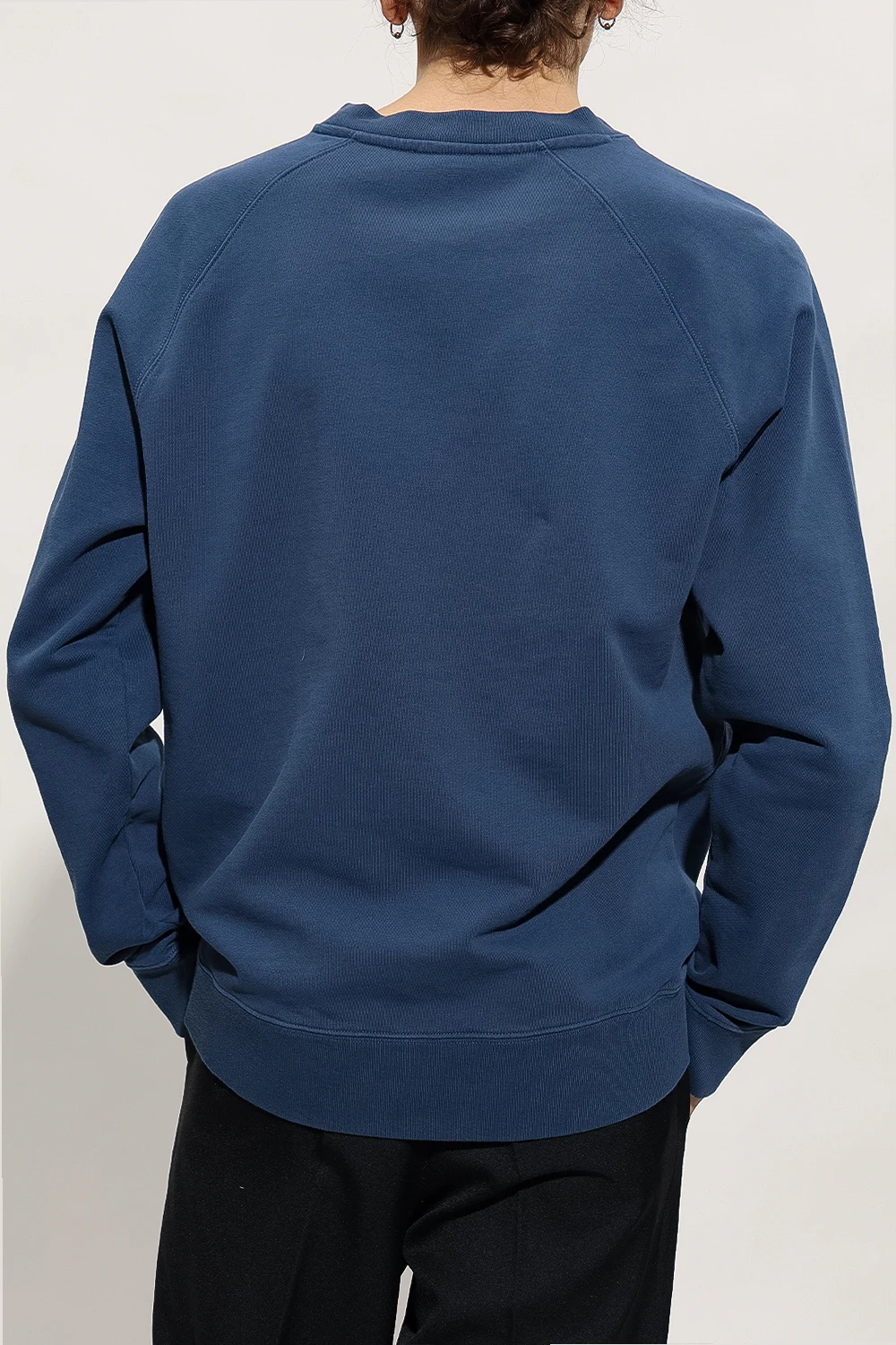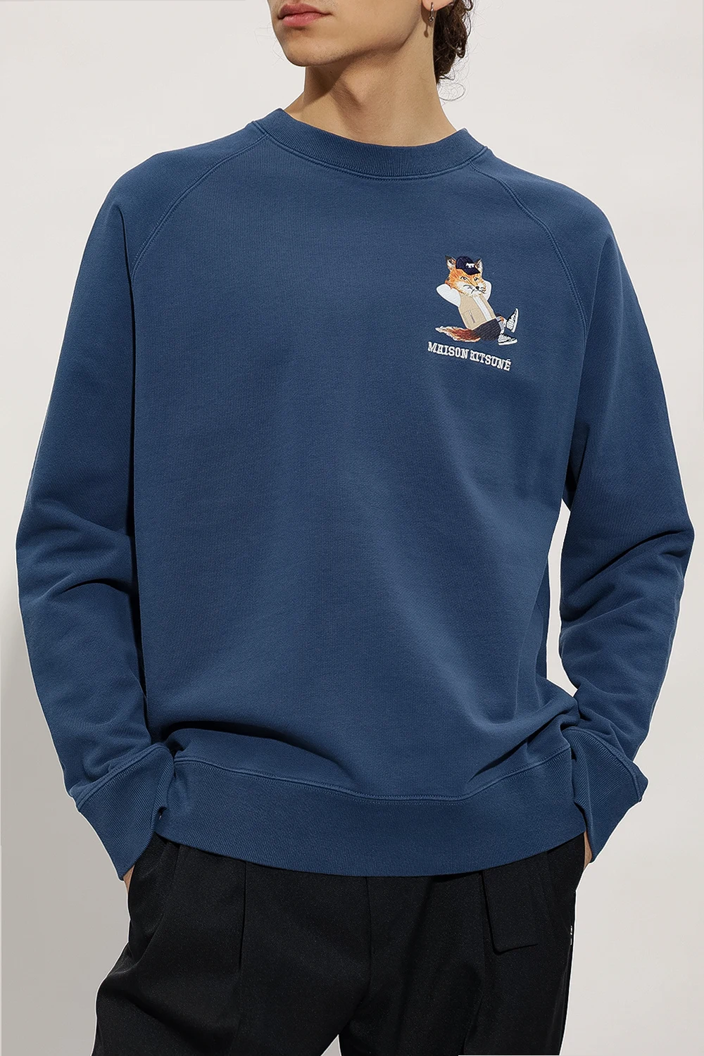 Dark blue crewneck sweatshirt from Maison Kitsune. Crafted from cotton, this long sleeve design features a multicolored printed and embroidered animal motif and ribbed edges.