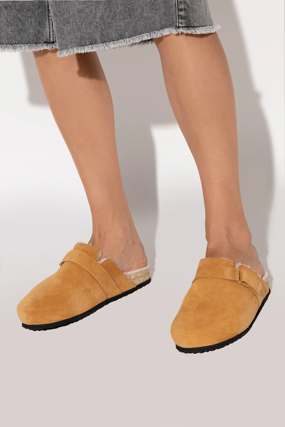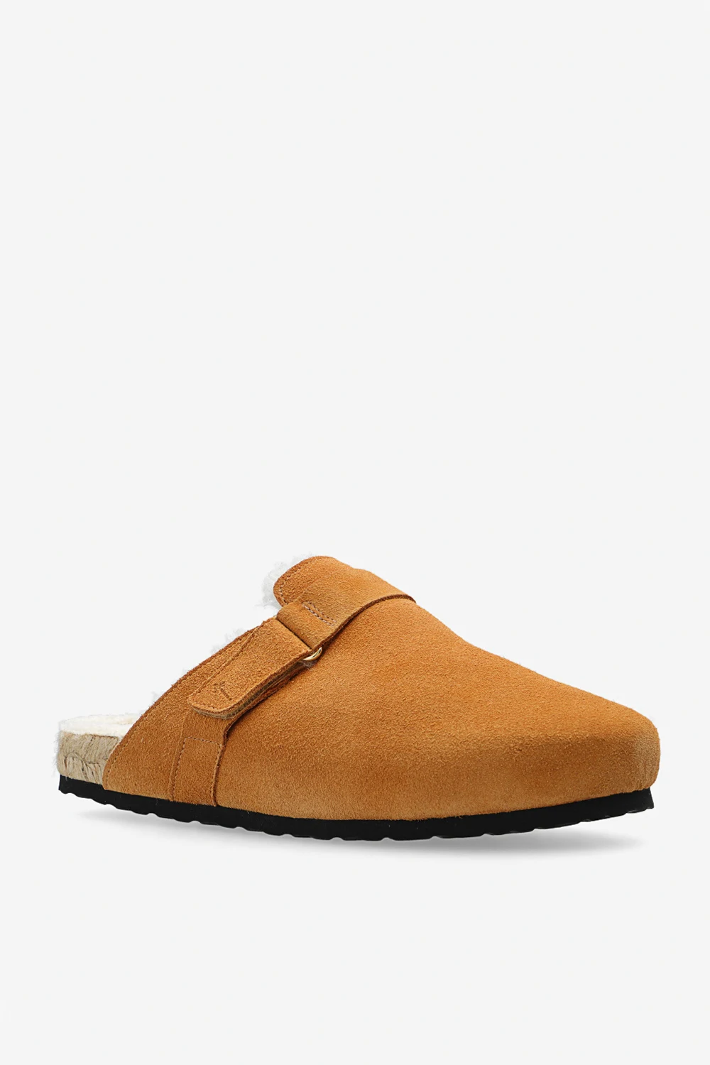 Light brown ‘Clog’ slides from Manebi. Made of leather, this pair is complete with a buckle strap, faux fur trims and black rubber sole.