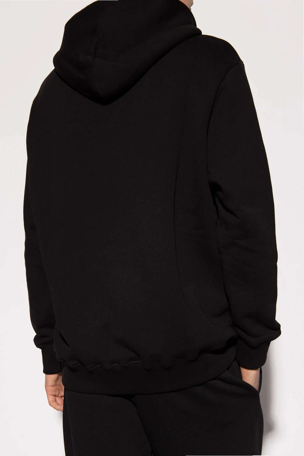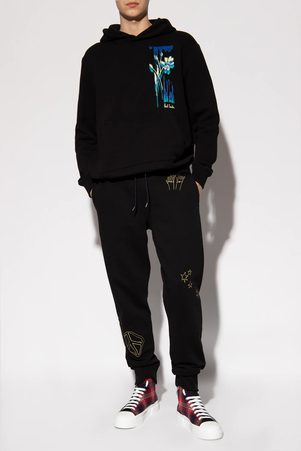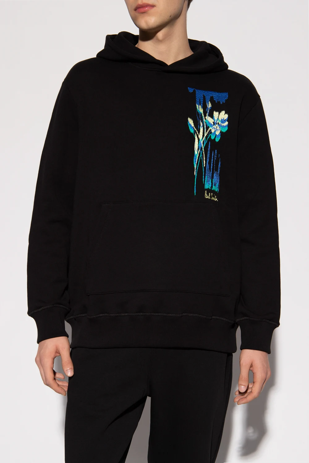 Black sweatshirt with a drawcord-adjustable hood from Paul Smith. Crafted from cotton jersey, this hoodie showcases blue, green and yellow graphic embroidery, a kangaroo pocket and ribbed trims on the bottom hem and cuffs.