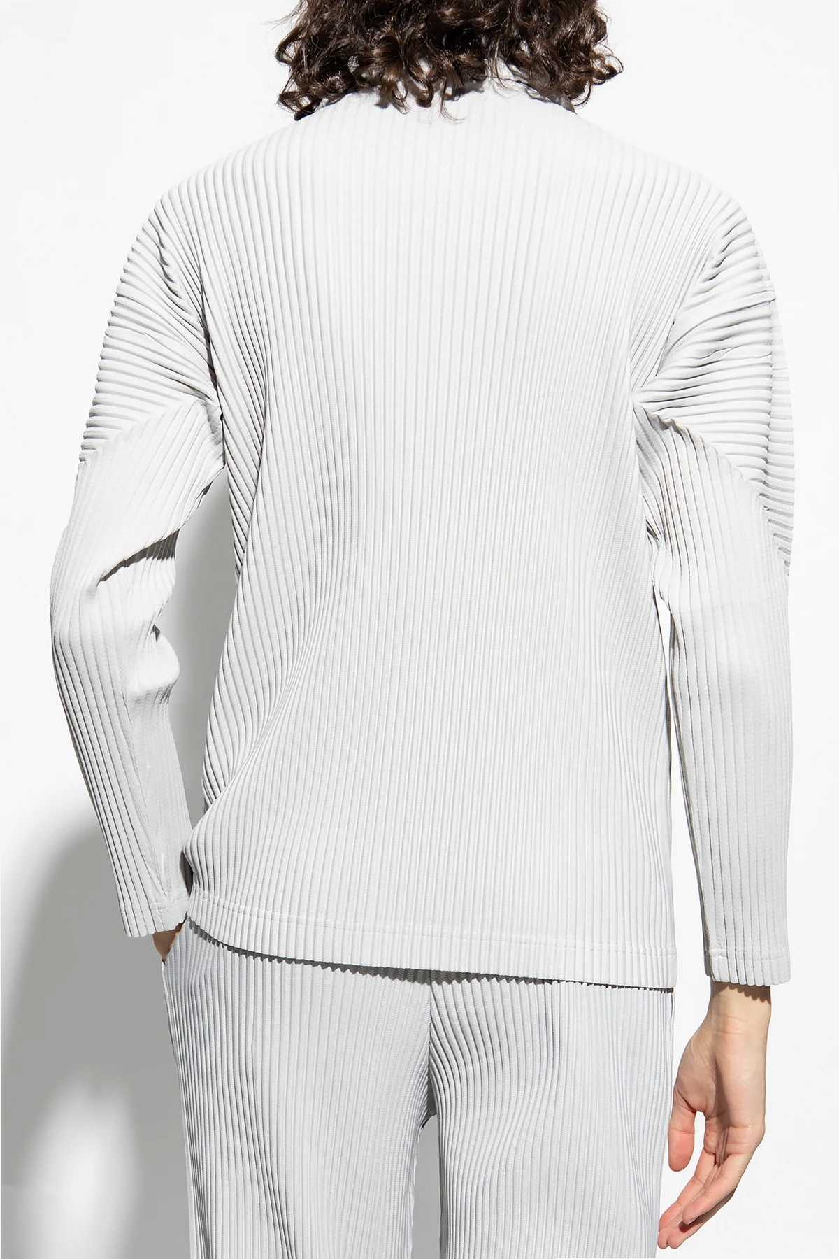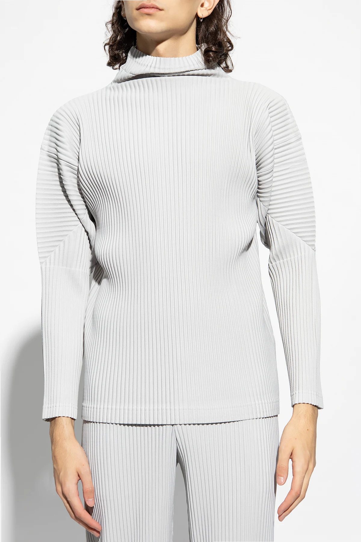 Light gray pleated turtleneck sweater with long sleeves from Issey Miyake Homme Plisse.