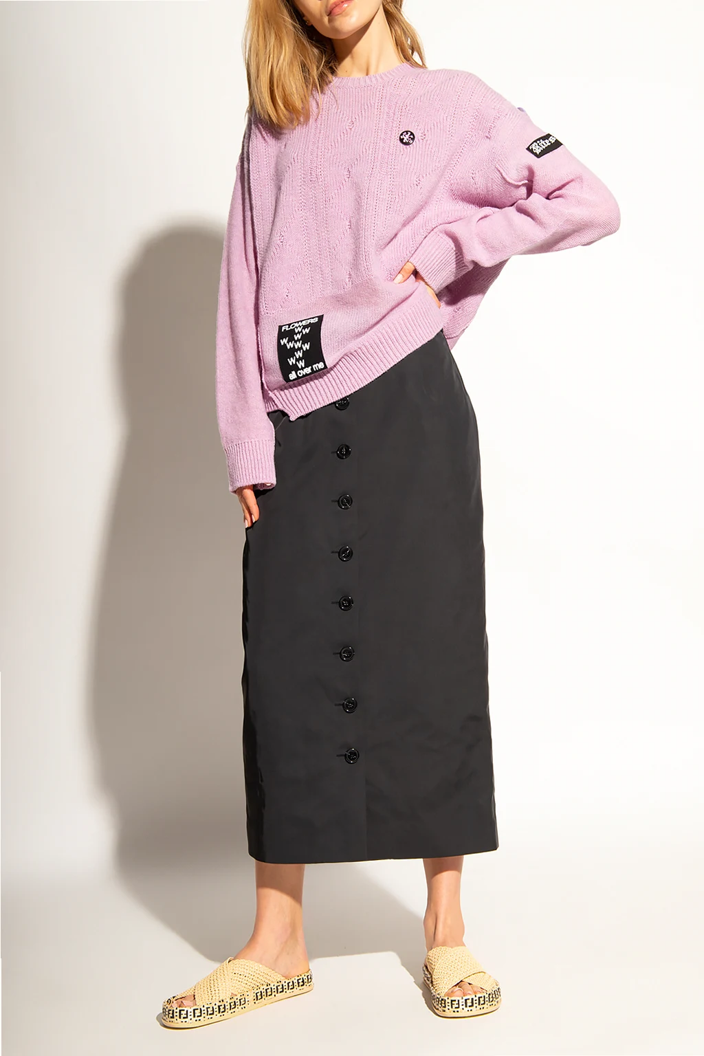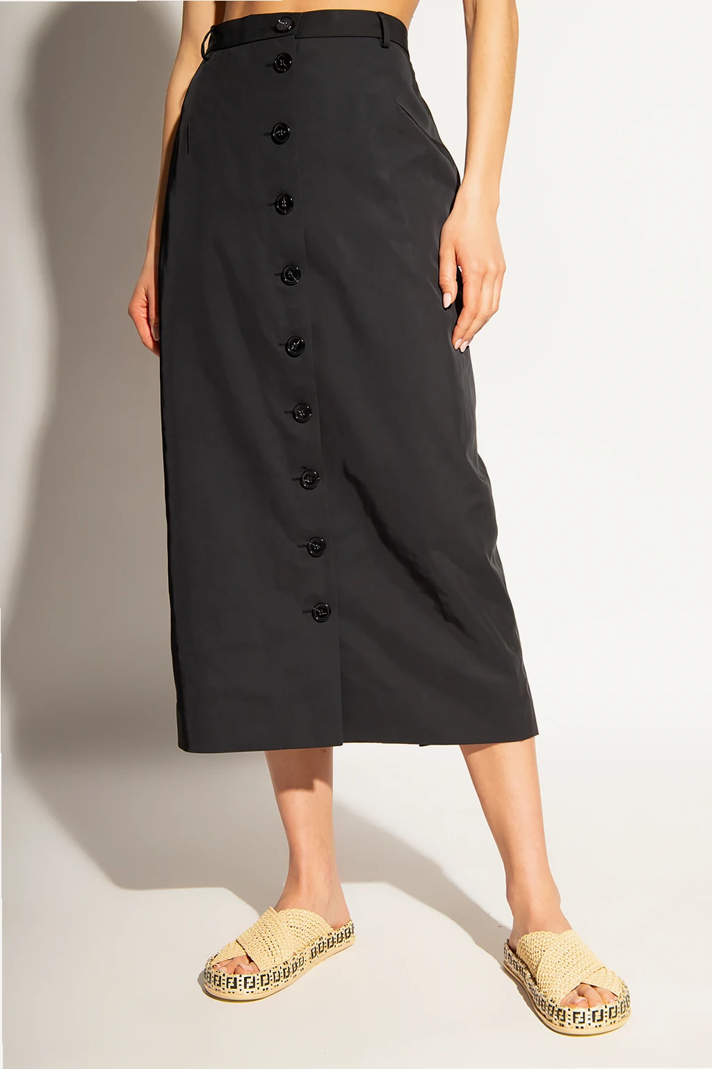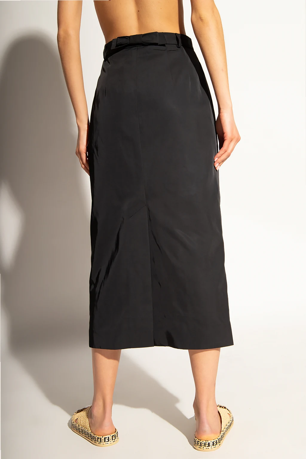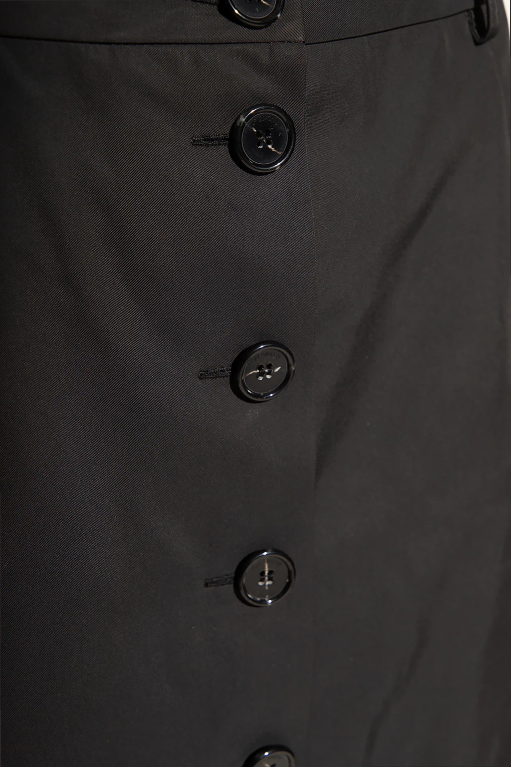 Black pencil skirt from Raf Simons. Enriched by a decorative bow insert at the back, this style features logo-embossed button closures and a hem slit for walking ease.