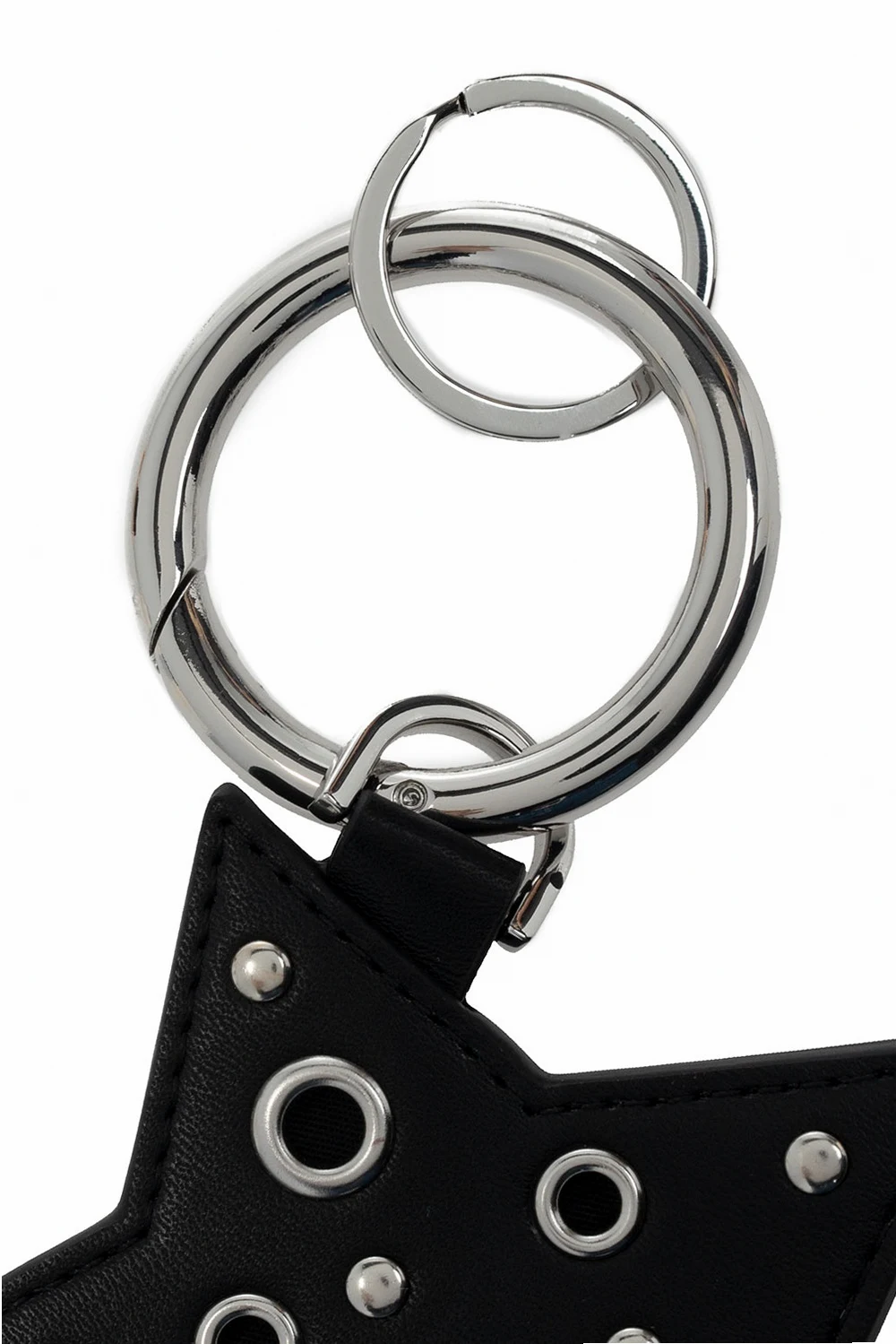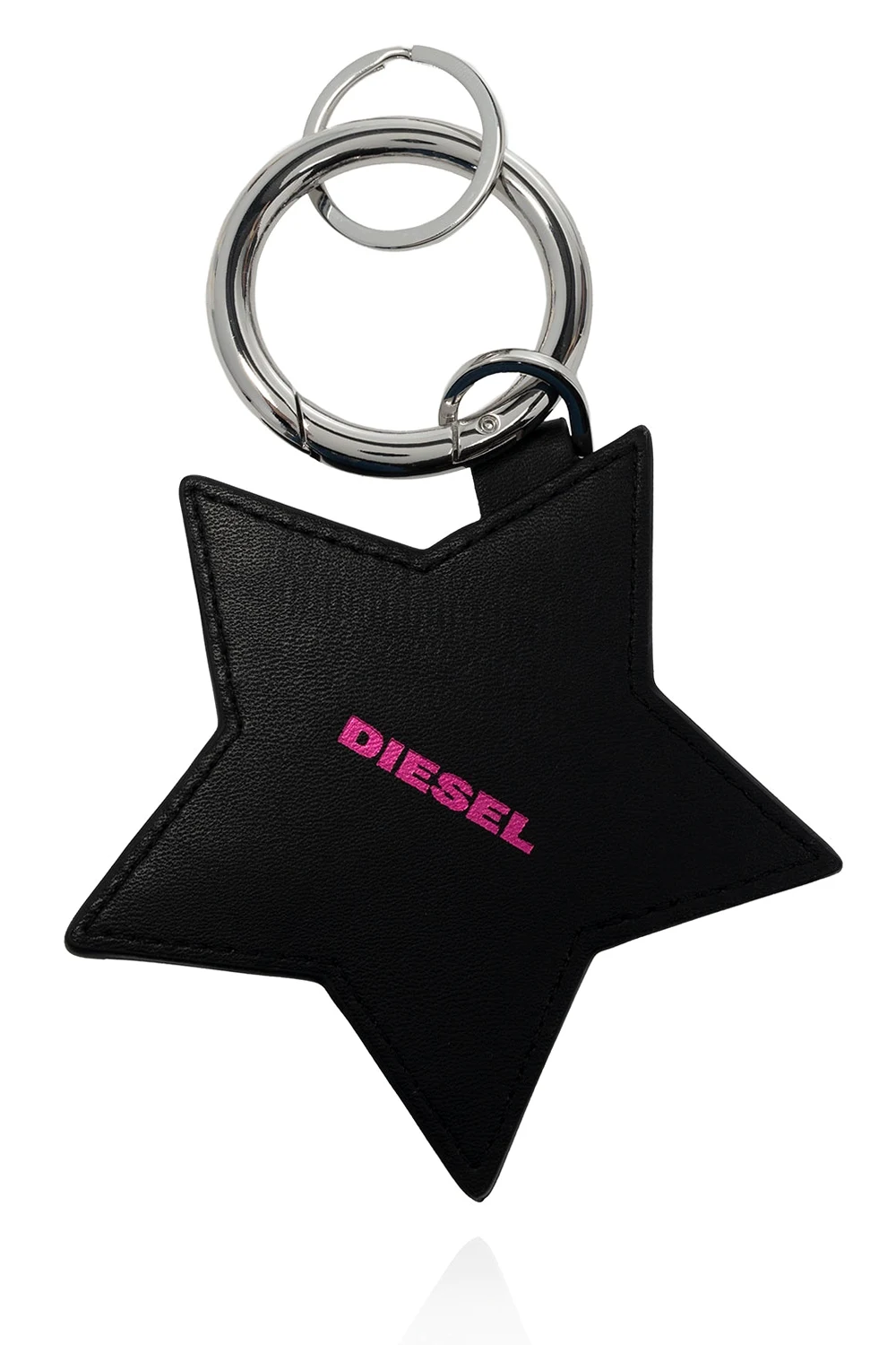 Silver-tone keyring from Diesel. It is decorated with a star motif, silver-tone studs and an embossed logo in pink.