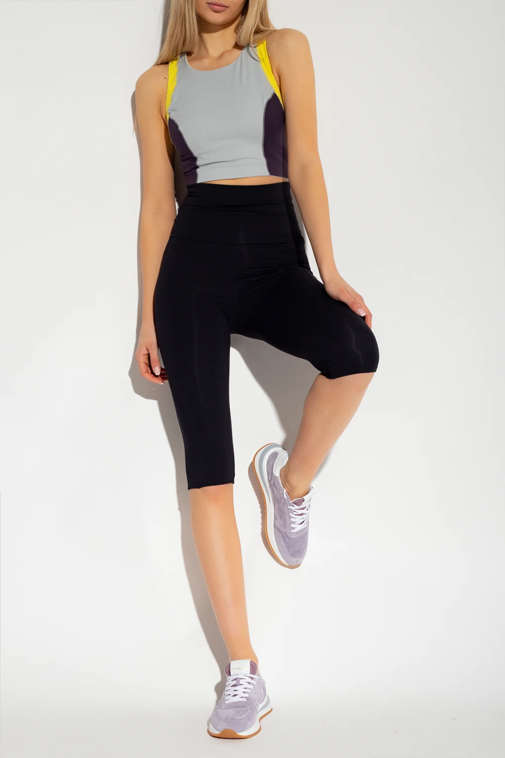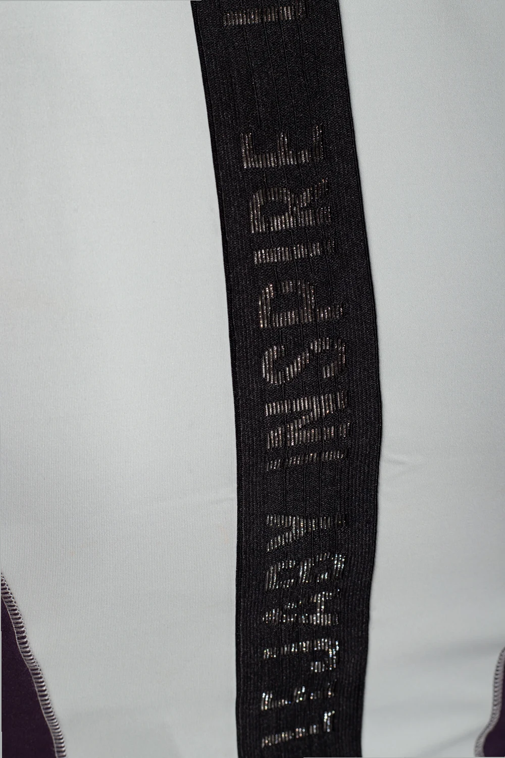 Purple, yellow and grey training top with a black stripe and logo from Maison Lejaby. Made of Emana® – a polyamide 6.6-based smart yarn which incorporates in its polymeric matrix bioactive mineral to improve blood microcirculation and cell metabolism.