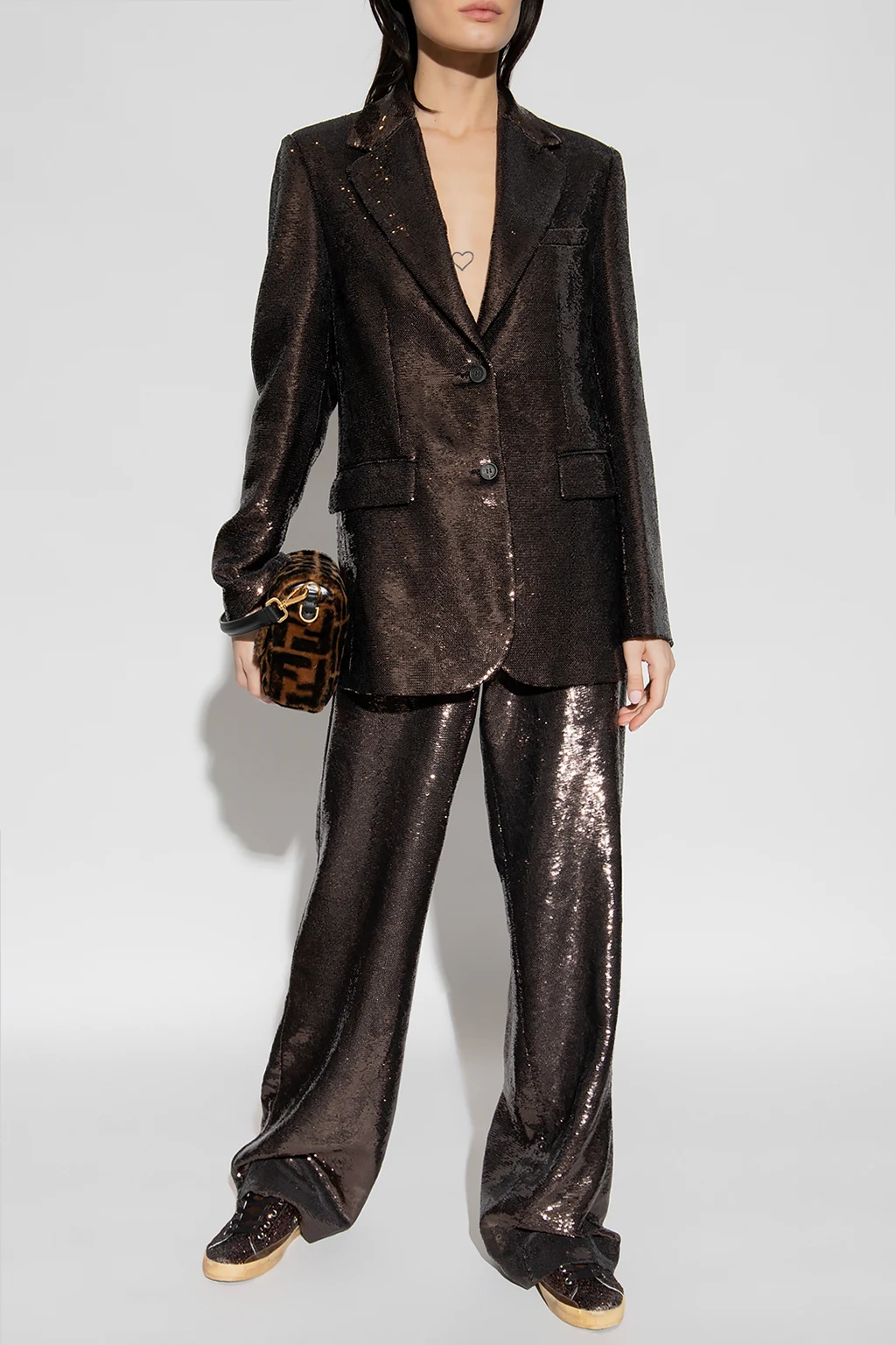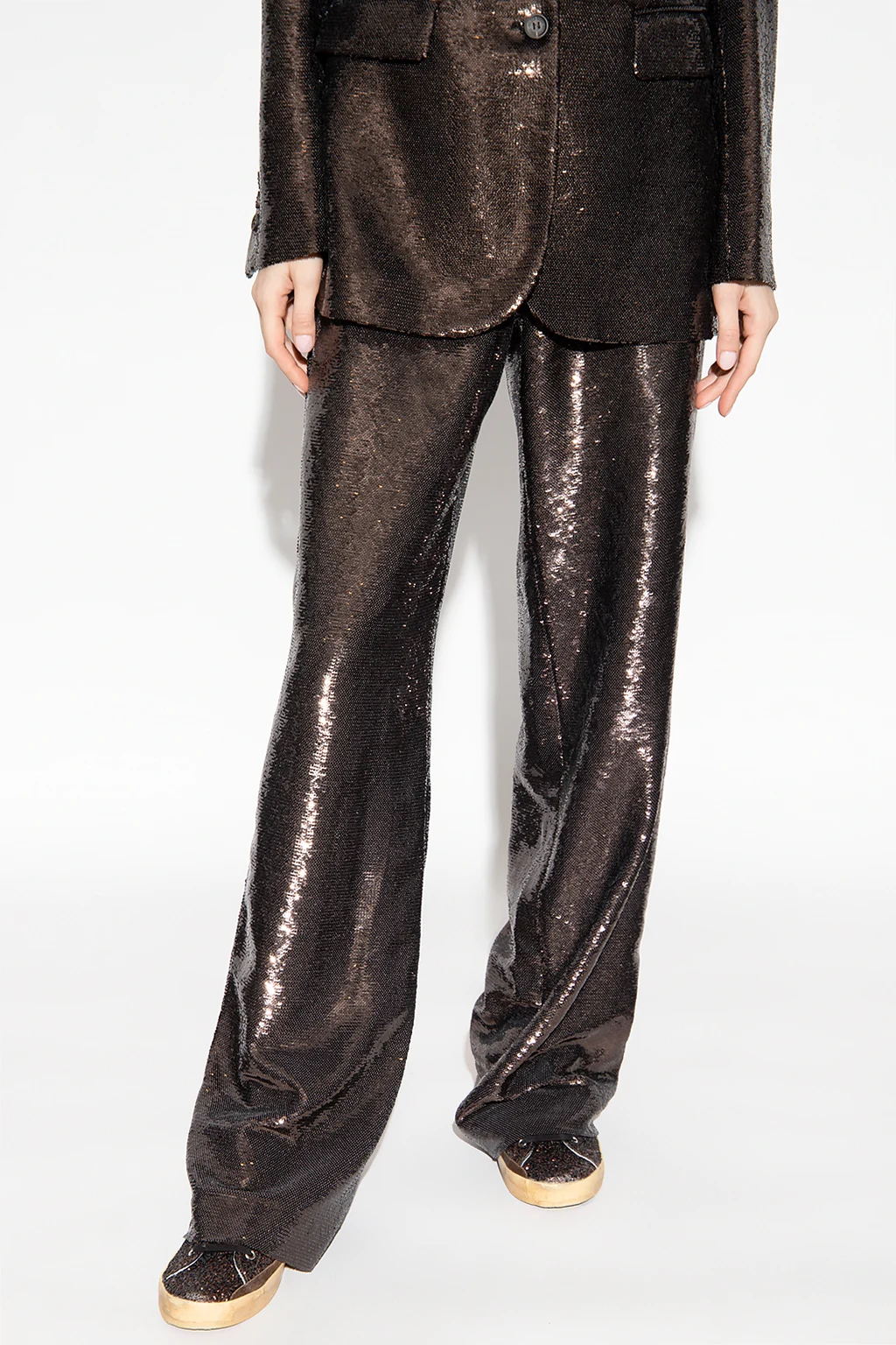 Brown trousers from Golden Goose. Spruced up with sequins, this pair falls with wide legs and features a hidden zipper, two slip pockets and a logo appliqué at the back.
