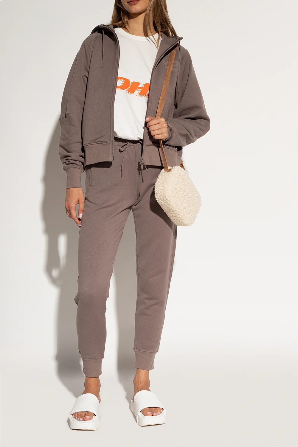 White slides from Y-3 Yohji Yamamoto. Made of tanned leather, this pair features a logo patch at the back, ‘PORON®’ cushioning and white rubber sole.