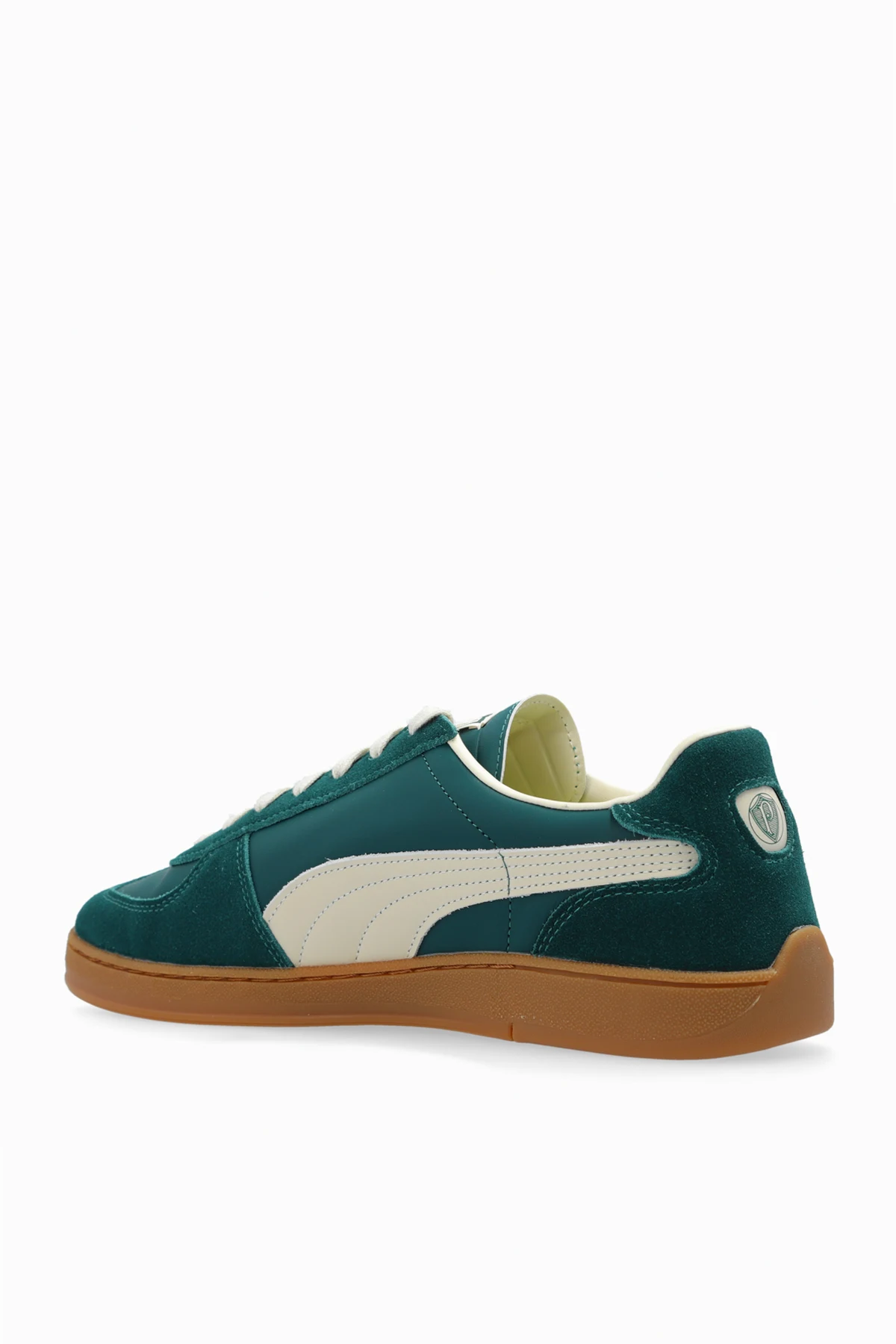 Details wie der Schriftzug "PUMA" und "Palmeiras São Paulo" an den Seitenteilen, das Puma-Logo auf der Zunge und das Palmeiras São Paulo-Logo im Fersenbereich unterstreichen den einzigartigen Charakter dieses Modells. Ein weiteres Highlight sind die weißen Schnürsenkel, die harmonisch zum Gesamtbild passen. Die klassische Gummisohle sorgt für hervorragenden Grip und Haltbarkeit, und die Innensohle mit grün-gelben Streifen verleiht den Schuhen einen unverwechselbaren Stil.