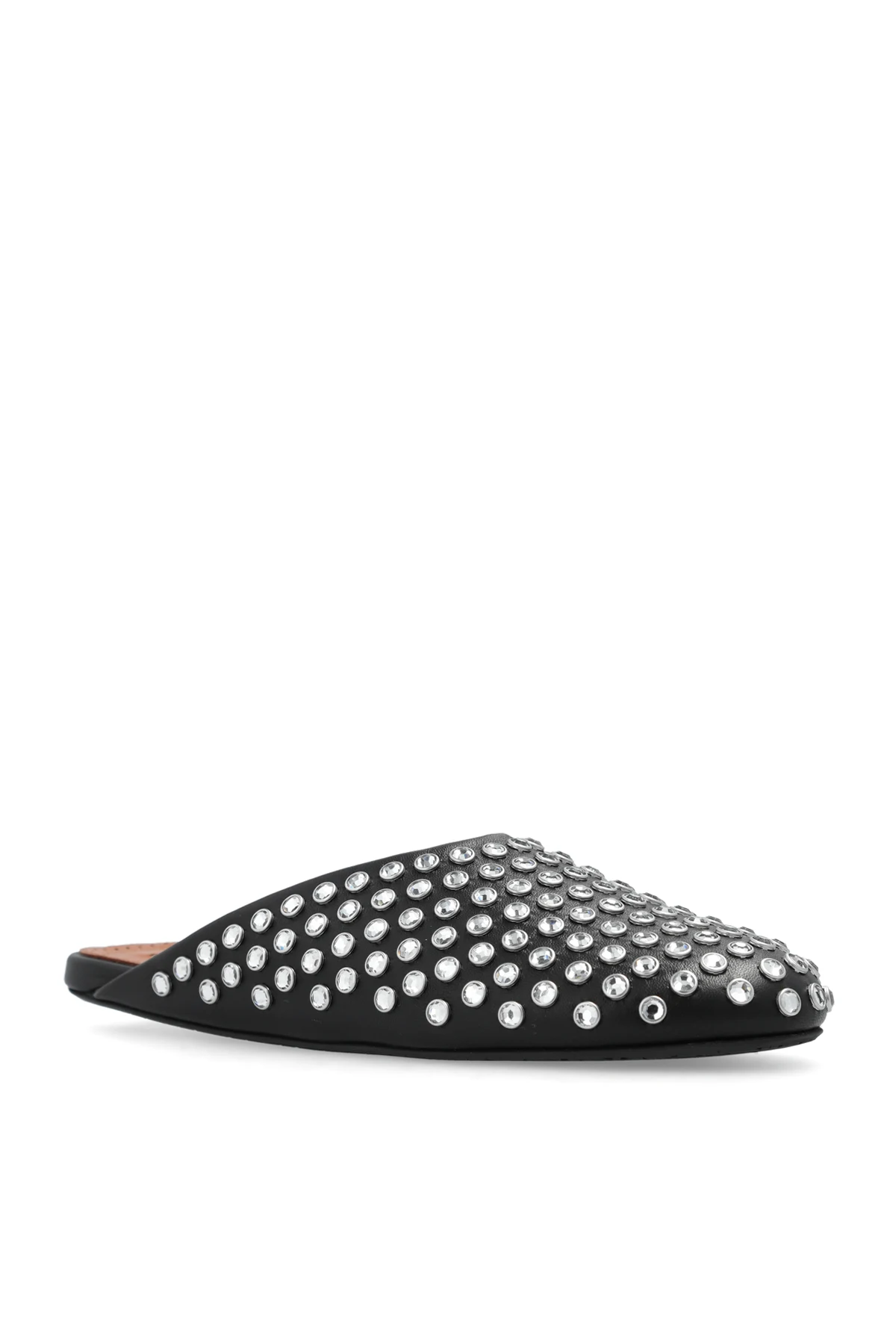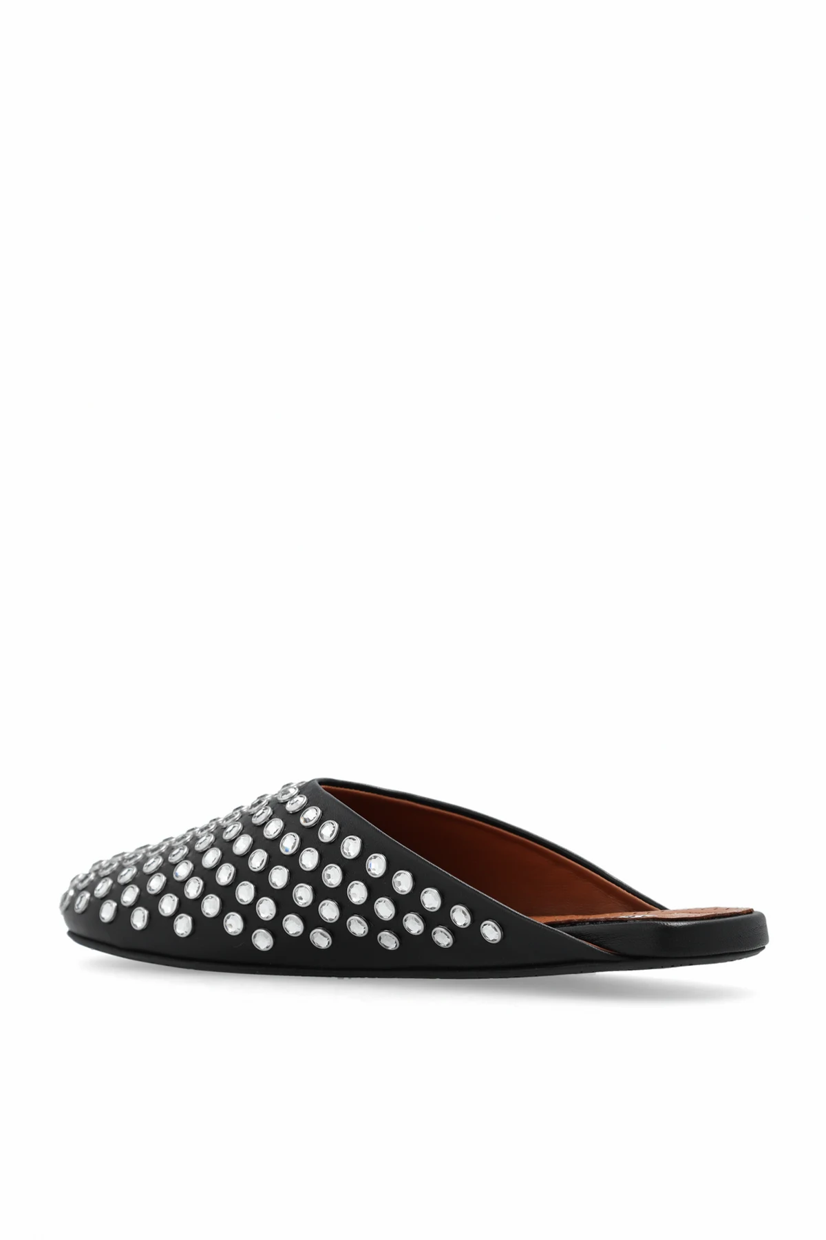 Black slides from Alaia. Crafted from leather embellished with crystals, this design features a round elongated toe and a black rubber sole with the brand’s signature pattern.