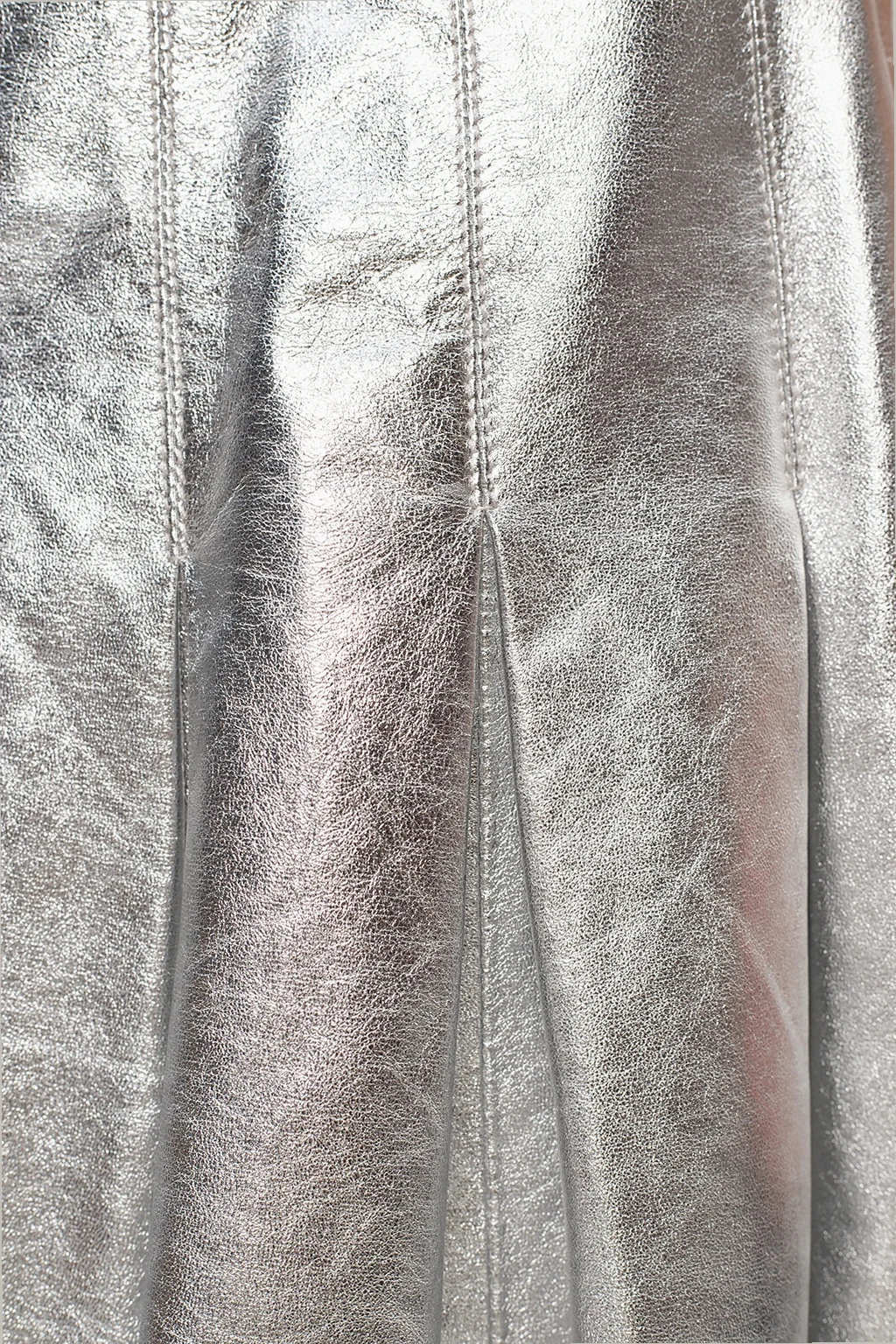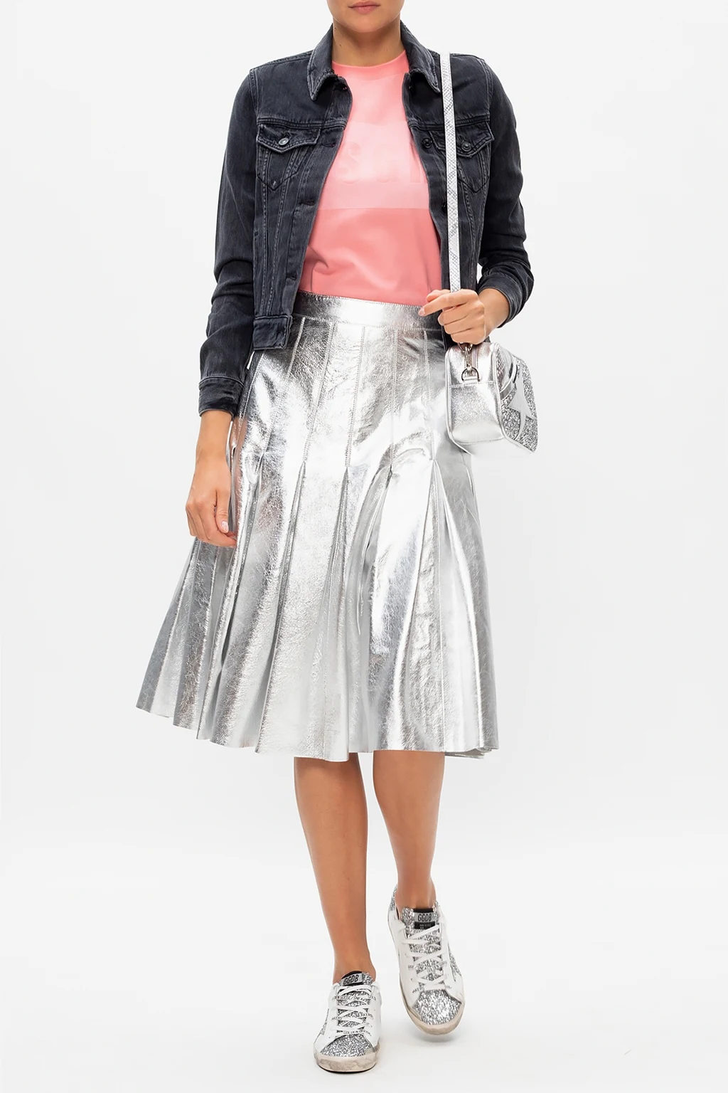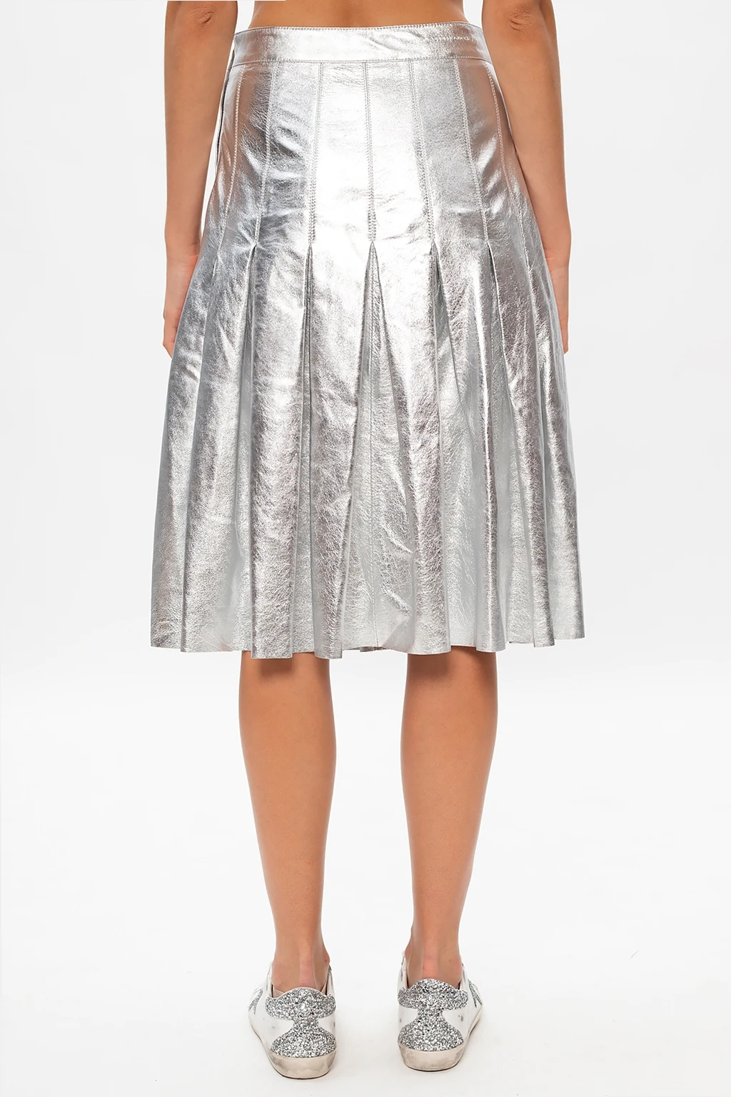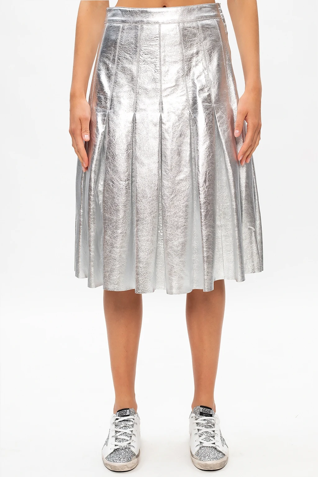 Silver-tone skirt from Golden Goose. Constructed from ovine leather, this feminine piece fastens via hidden zip on the side and showcases distinctive pleats.