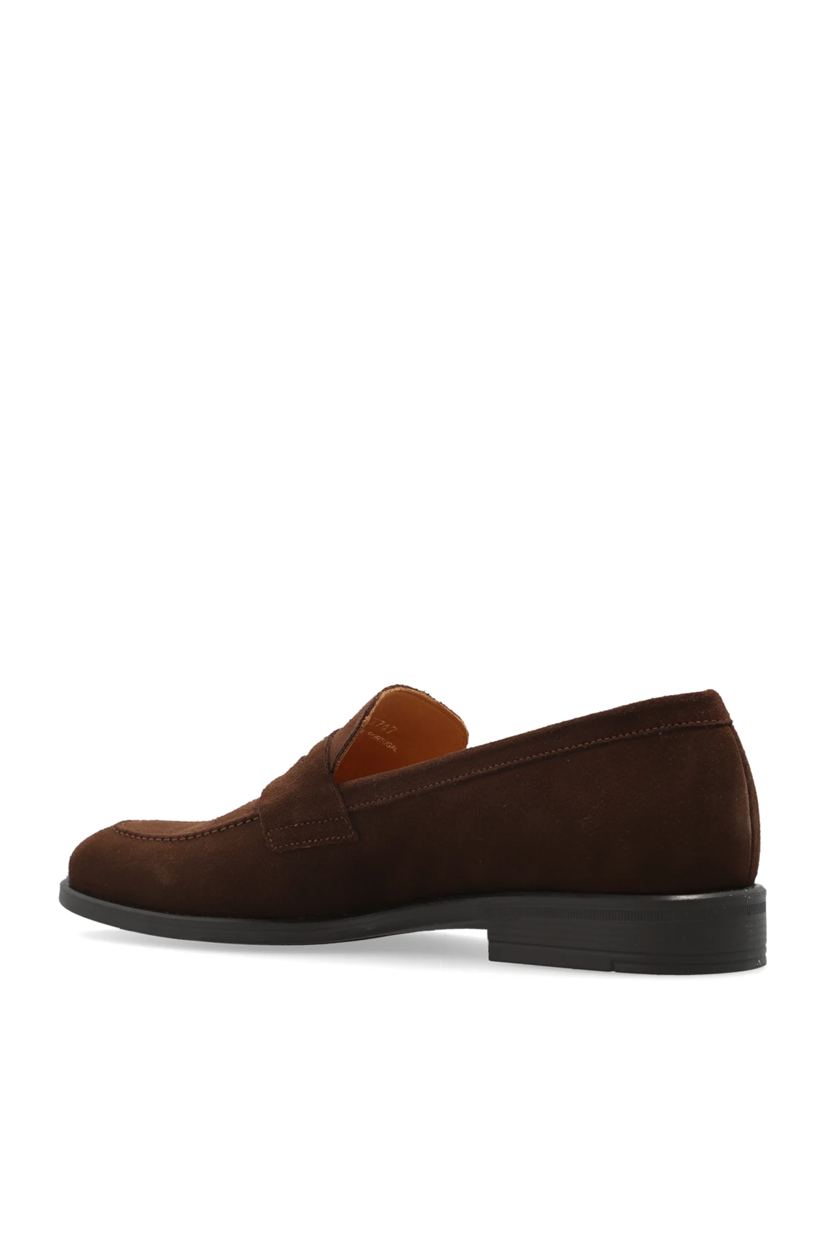 Brown ‘Remi’ loafers from Paul Smith. Made of suede, this pair rests on a rubber sole in maroon and brown.