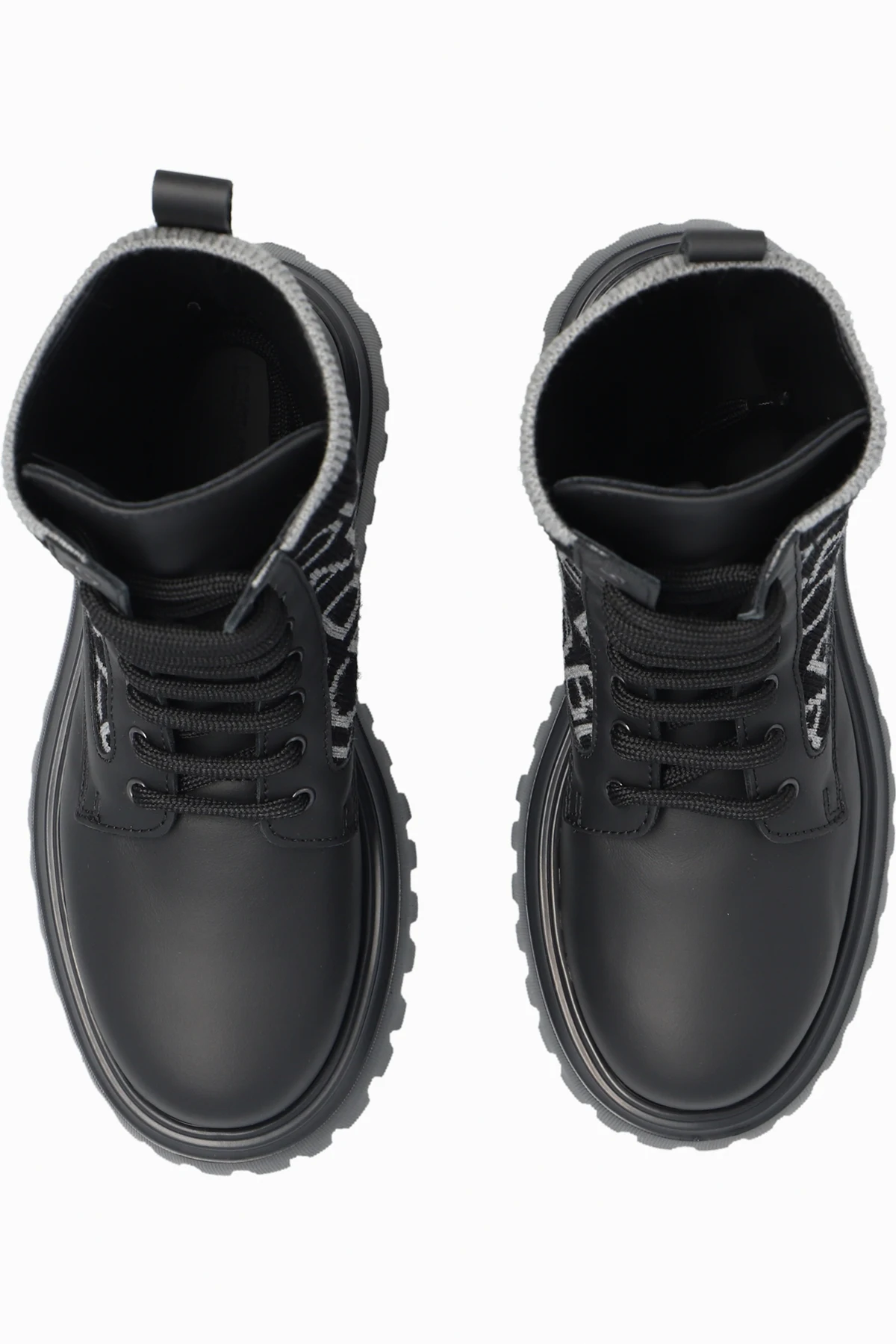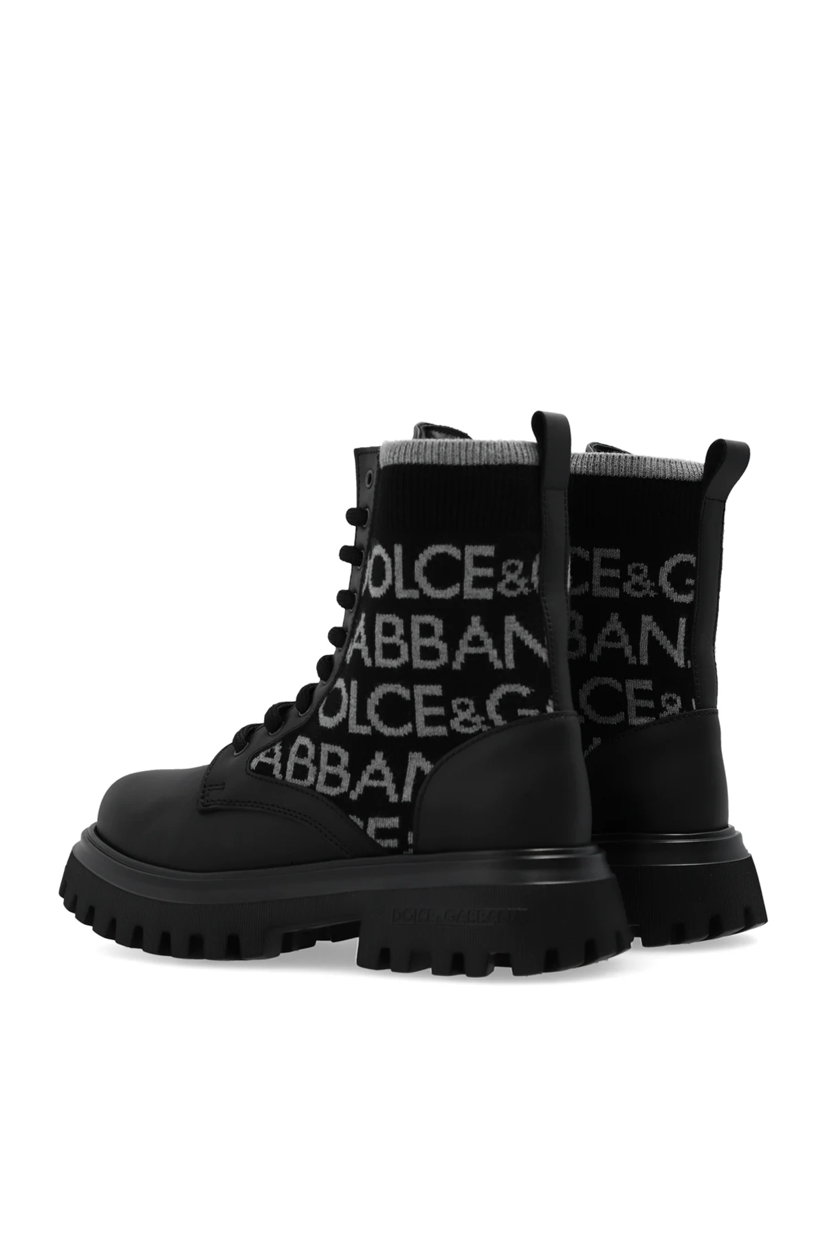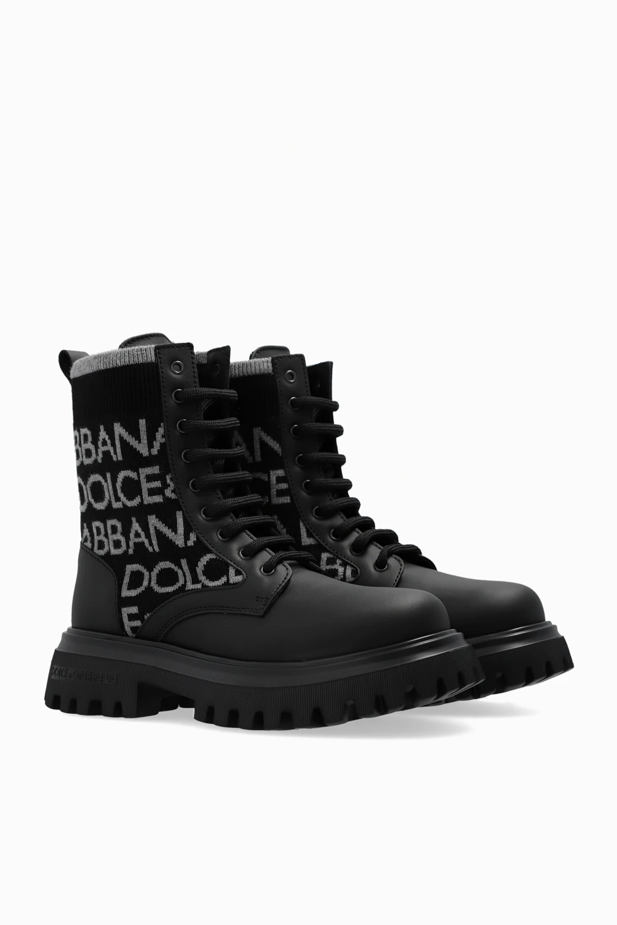 Black boots from Dolce & Gabbana Kids. Made of fabric embroidered with a grey logo, this lace-up pair is trimmed with leather and set on a black rubber sole.