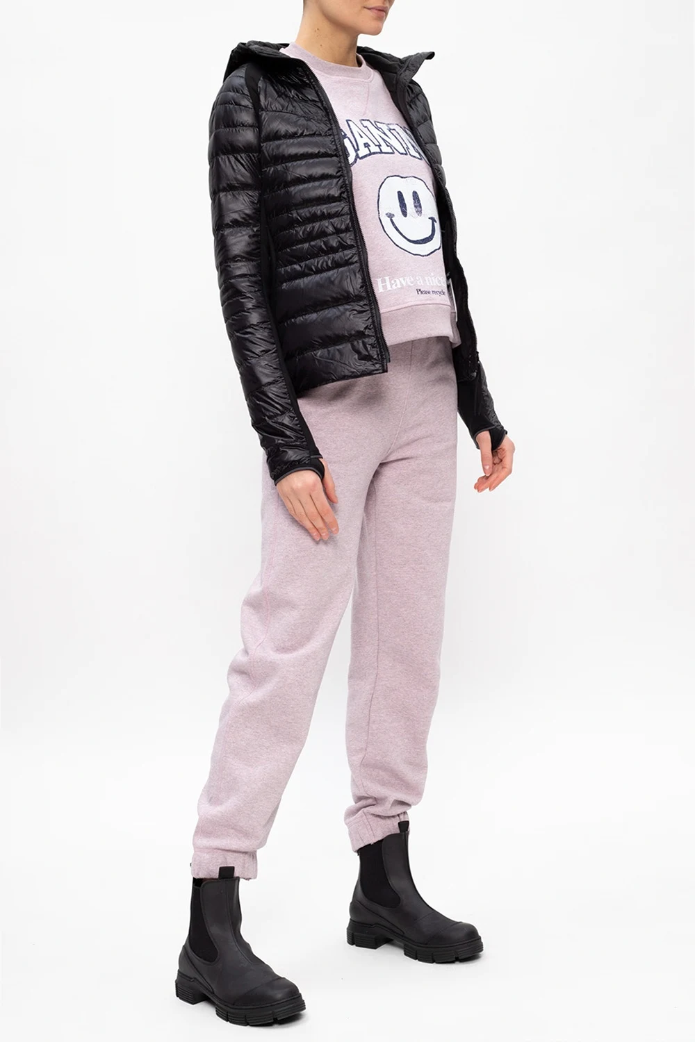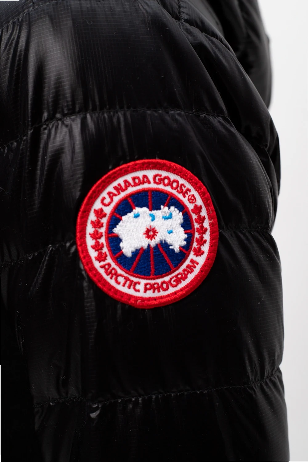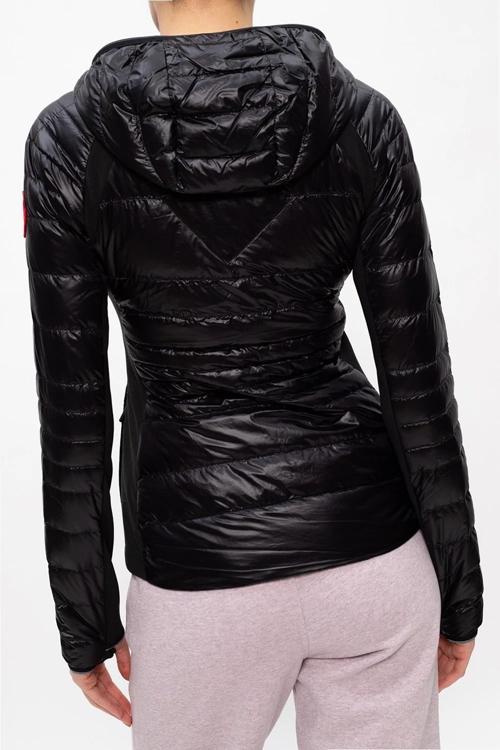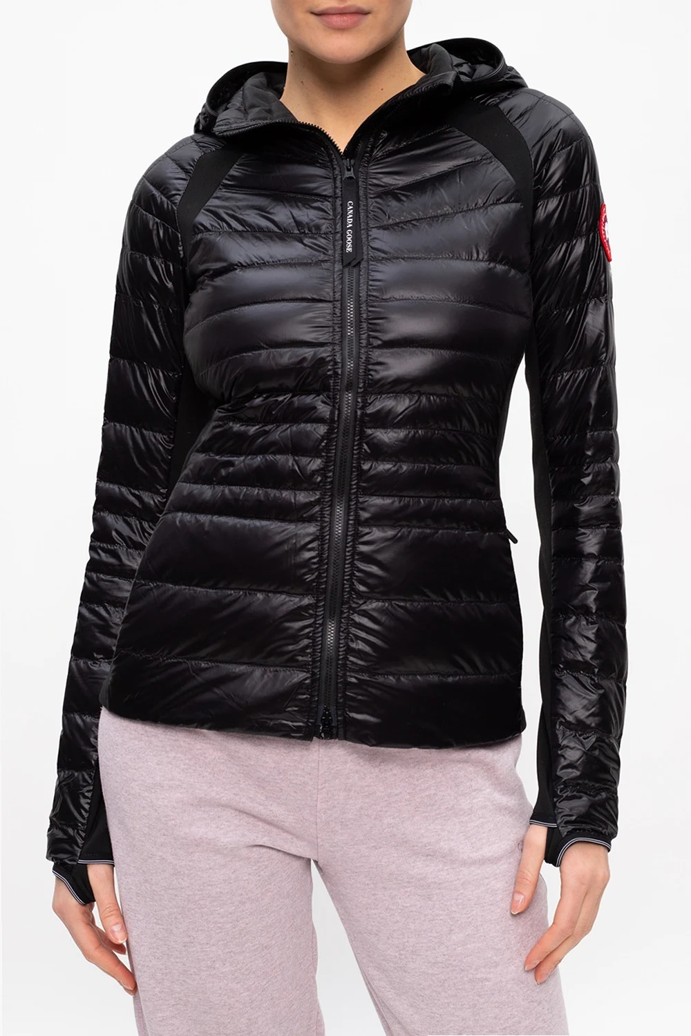Black ‘Hybridge Lite’ hooded quilted jacket from Canada Goose. Padded with duck down, it features a zip fastening, logo patch and two front zip pockets.
