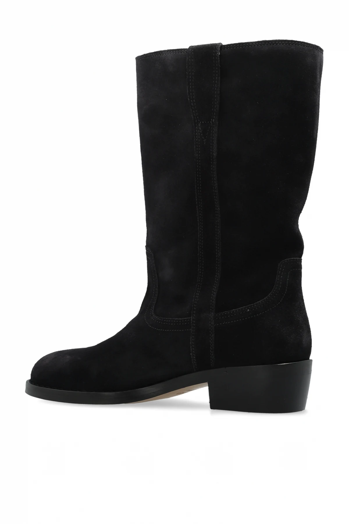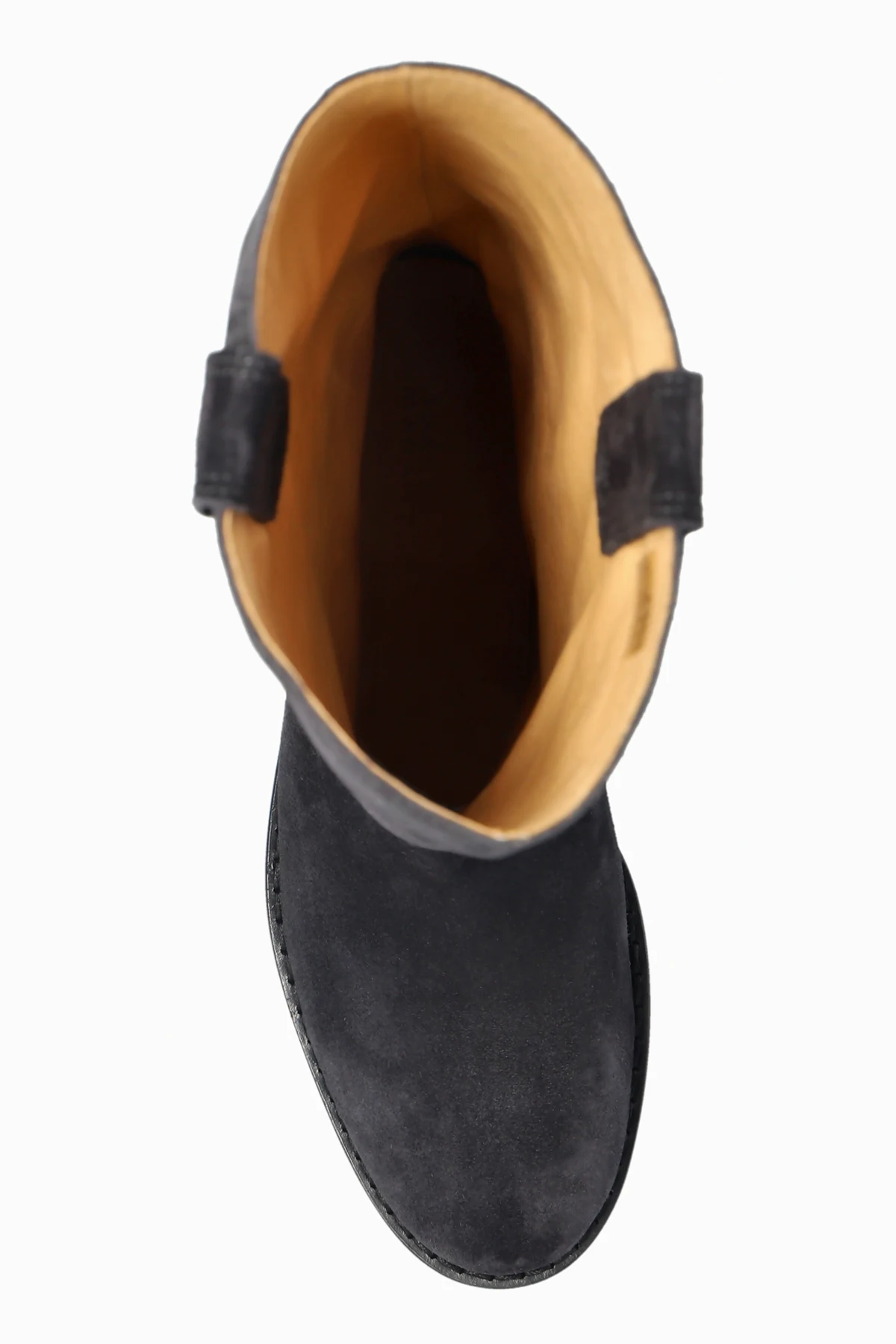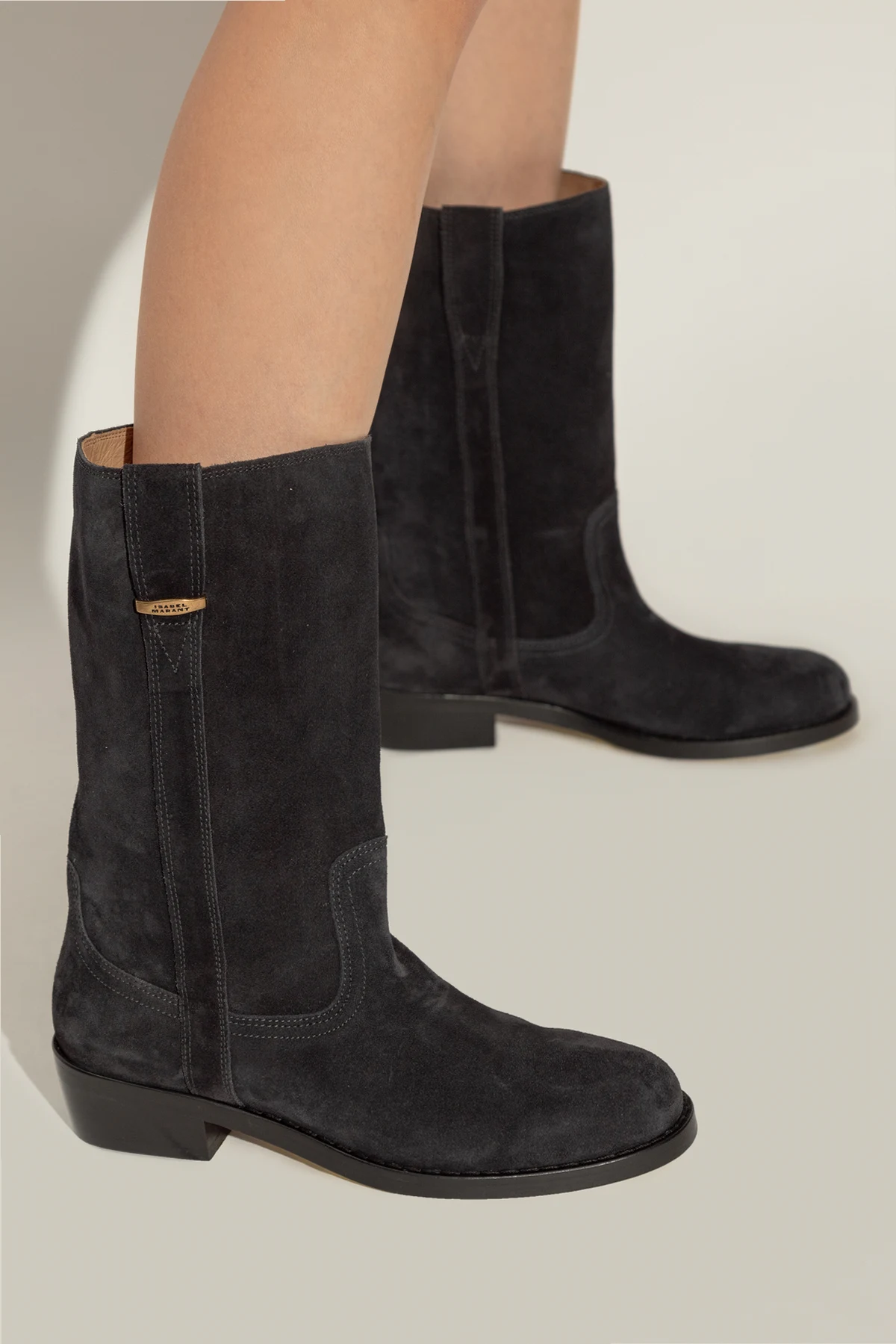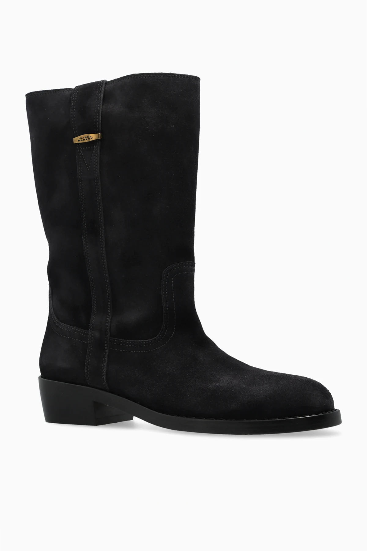 Wir präsentieren die Lederstiefeletten "Heikee" , die die Quintessenz von raffiniertem Stil und Komfort sind. Diese schwarzen Wildlederstiefeletten bestechen durch ihre klassische Form mit abgerundeter Spitze, subtile Nähte und einen mittelhohen Absatz. An der Seite des Schafts befindet sich ein zarter, goldener Akzent mit dem Isabel Marant -Logo, das die Exklusivität des Produkts unterstreicht.