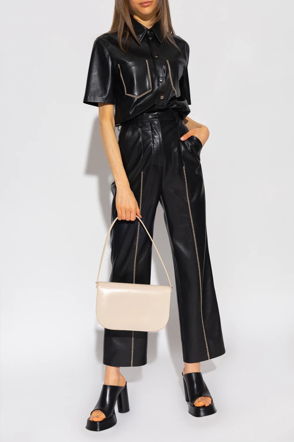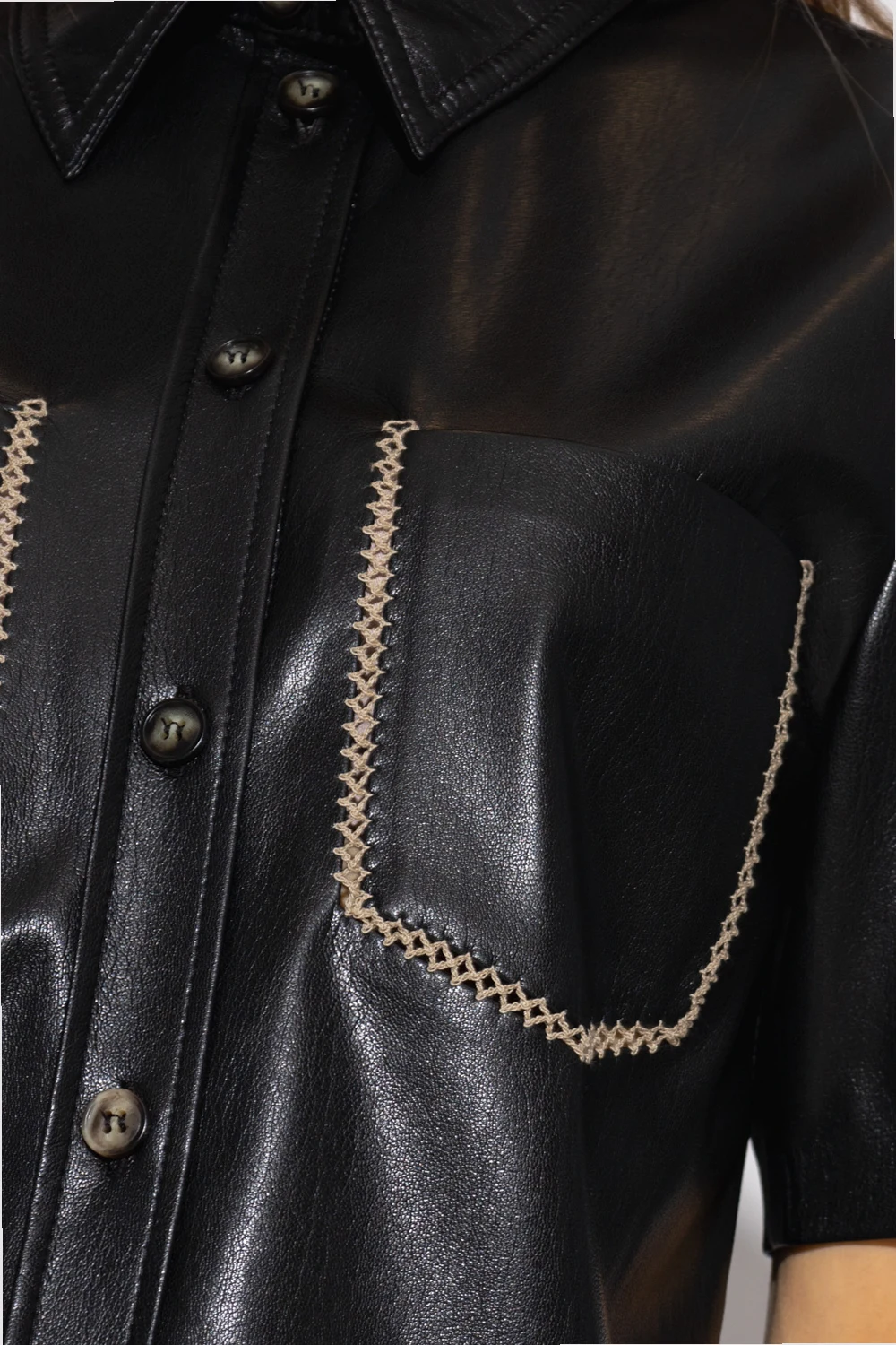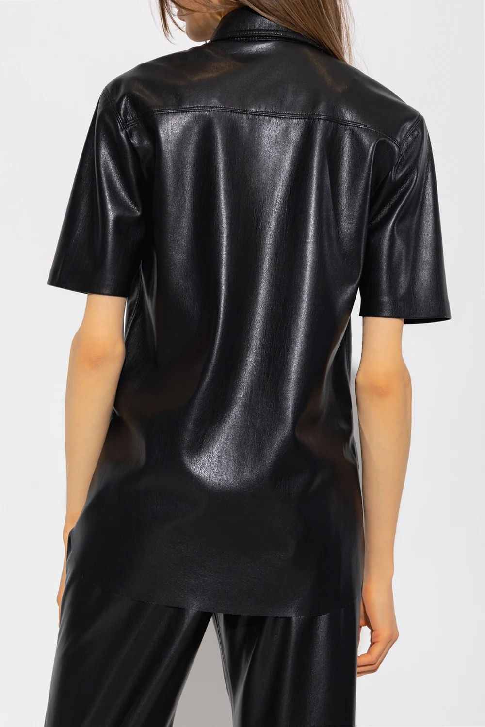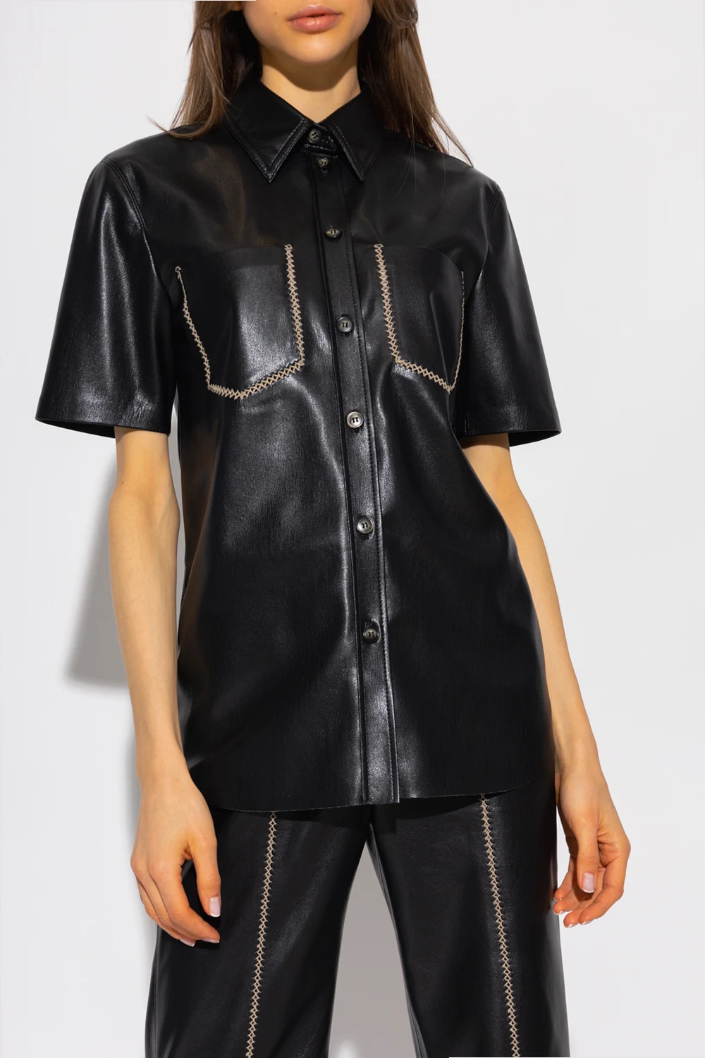 Black ‘Mayra’ shirt from Nanushka. Crafted from vegan leather, this short sleeve design features button fastenings and two slip pockets and decorative openwork seam in beige.