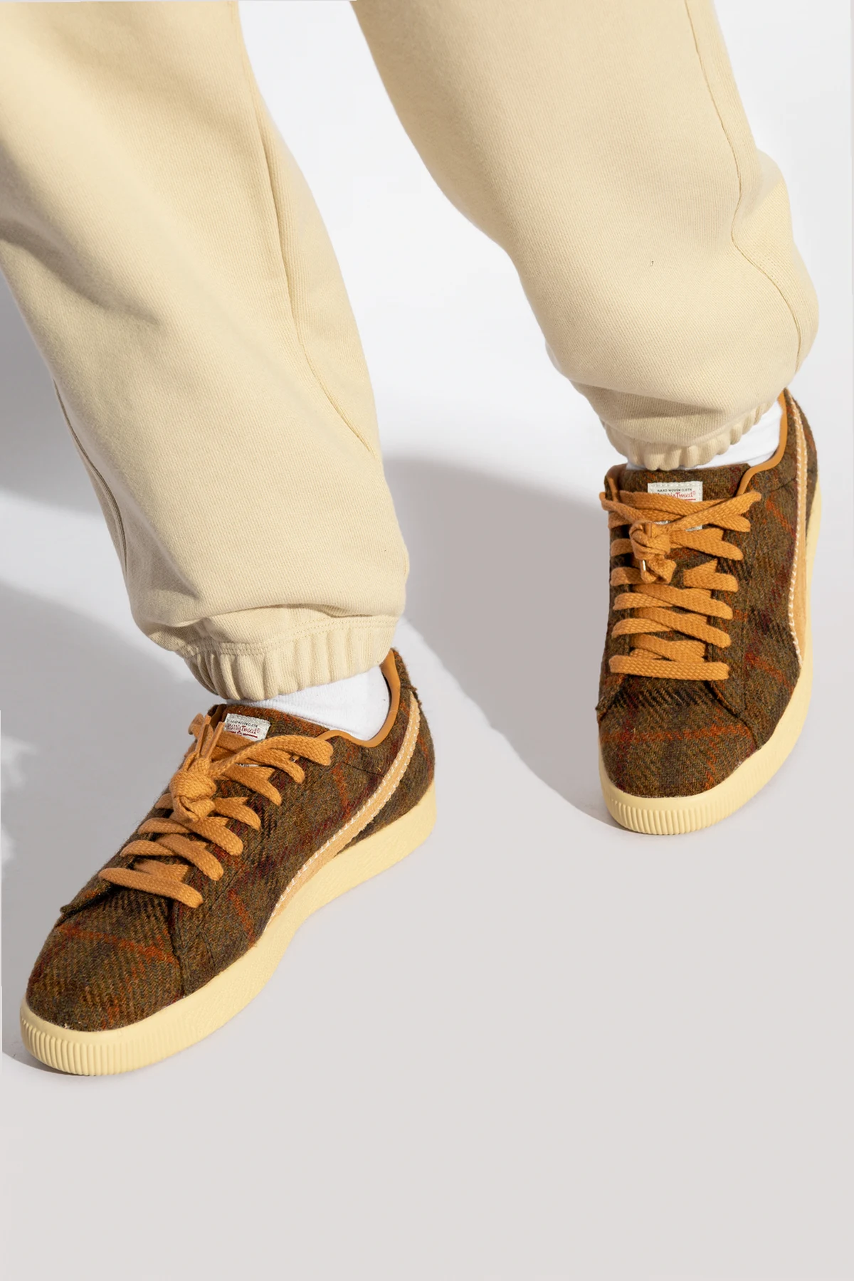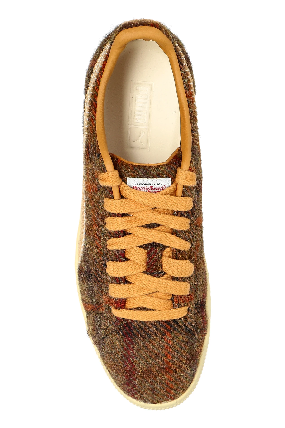 Wir präsentieren die Clyde Harris Tweed SNEAKERS der renommierten Marke Puma, die ein wahres Meisterwerk unter den SportSCHUHEN sind. Hergestellt aus luxuriösem Tweedstoff, in dem Brauntöne, Orange und Rot eine harmonische und raffinierte Komposition bilden.